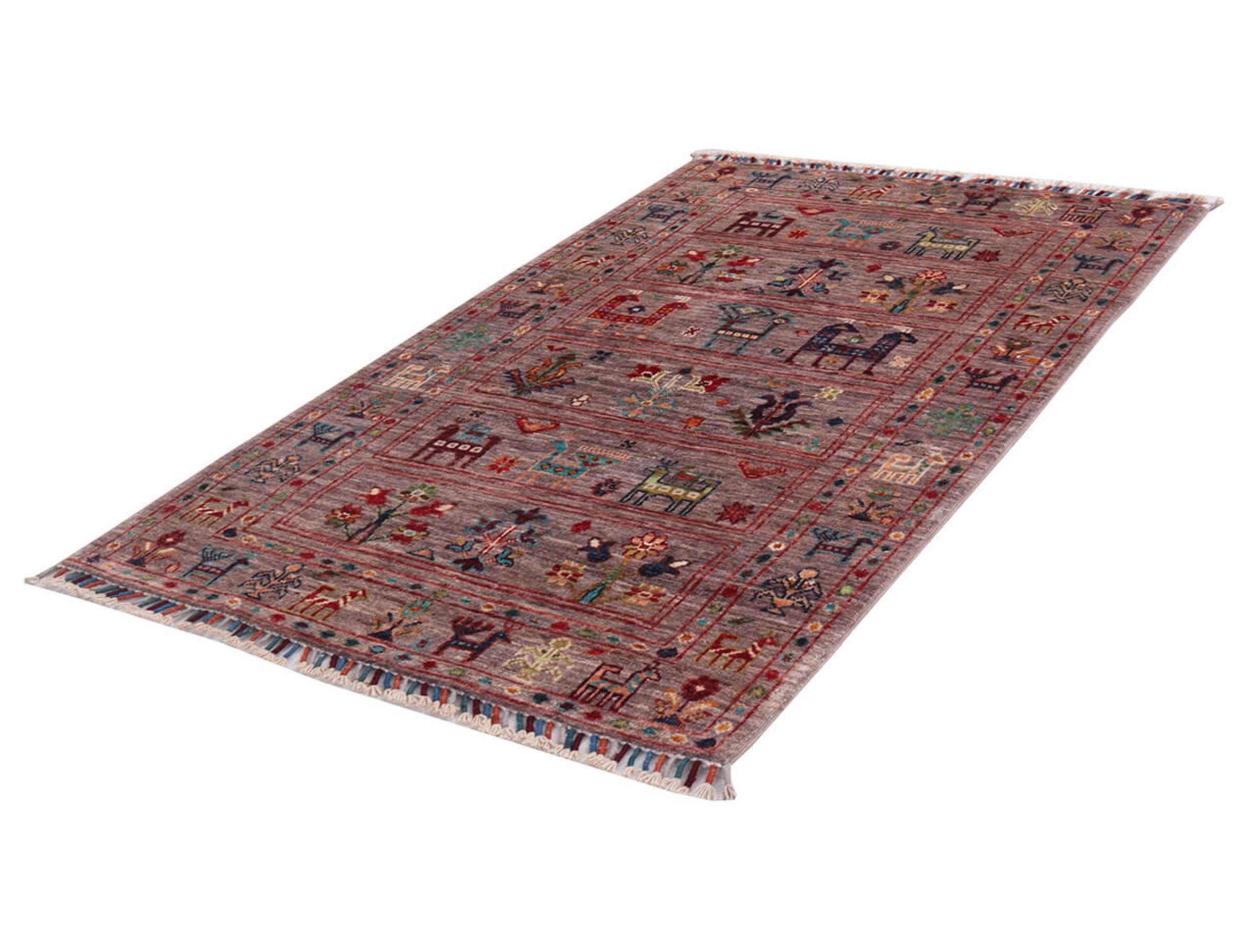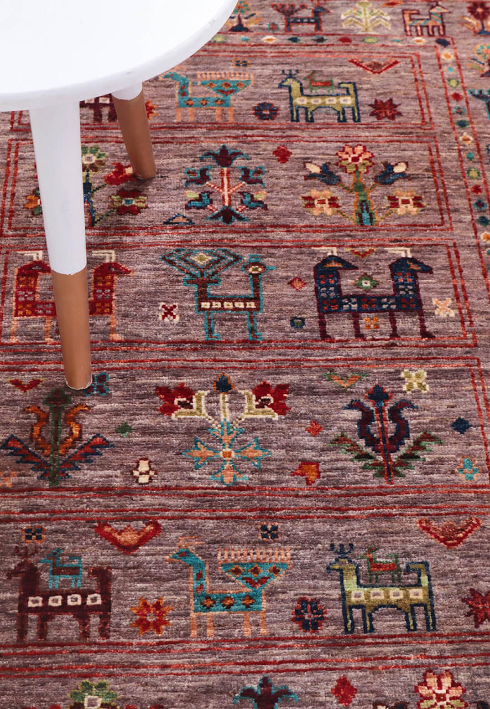 Este tapete é feito de lã de ovelha fiada à mão, da mais alta qualidade. Especialmente no Irão (antiga Pérsia), Afeganistão e Paquistão, a lã ainda é fiada à mão antes do início do nó do tapete. A lã tem provado ser um material natural e extremamente resistente ao longo dos séculos. Entre outras coisas, tem propriedades repelentes de impurezas e isolantes térmicos. Ao mesmo tempo, a lã é incomparavelmente macia e tem um brilho natural.