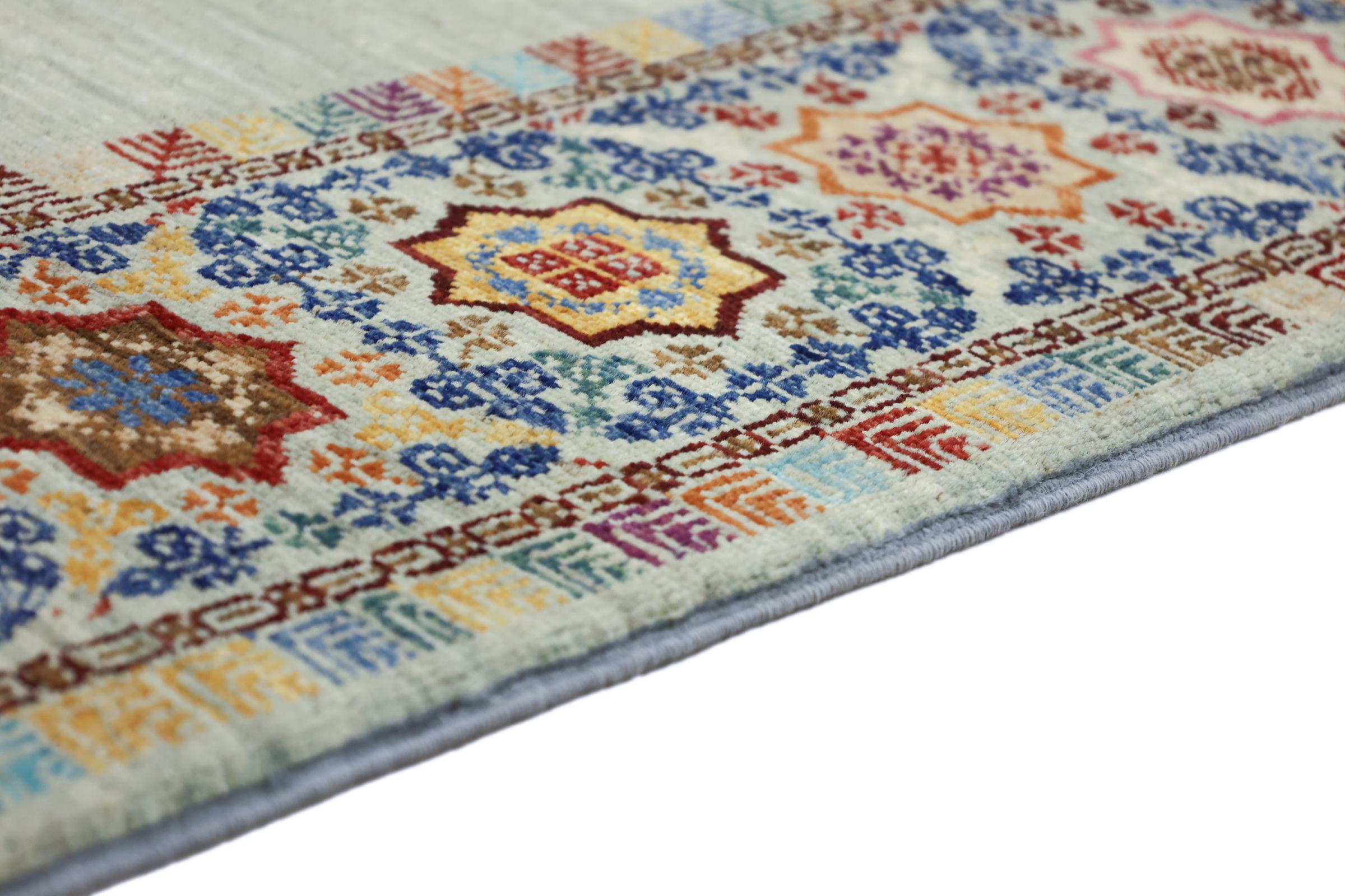 Este tapete é feito de lã de ovelha fiada à mão, da mais alta qualidade. Especialmente no Irão (antiga Pérsia), Afeganistão e Paquistão, a lã ainda é fiada à mão antes do início do nó do tapete. A lã tem provado ser um material natural e extremamente resistente ao longo dos séculos. Entre outras coisas, tem propriedades repelentes de impurezas e isolantes térmicos. Ao mesmo tempo, a lã é incomparavelmente macia e tem um brilho natural.