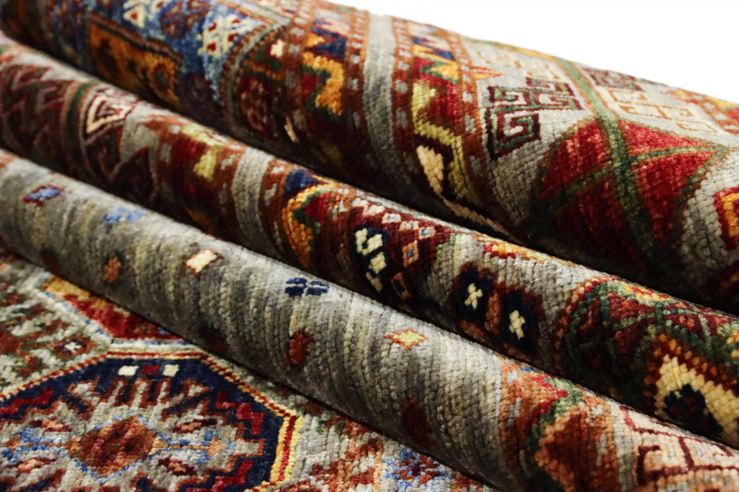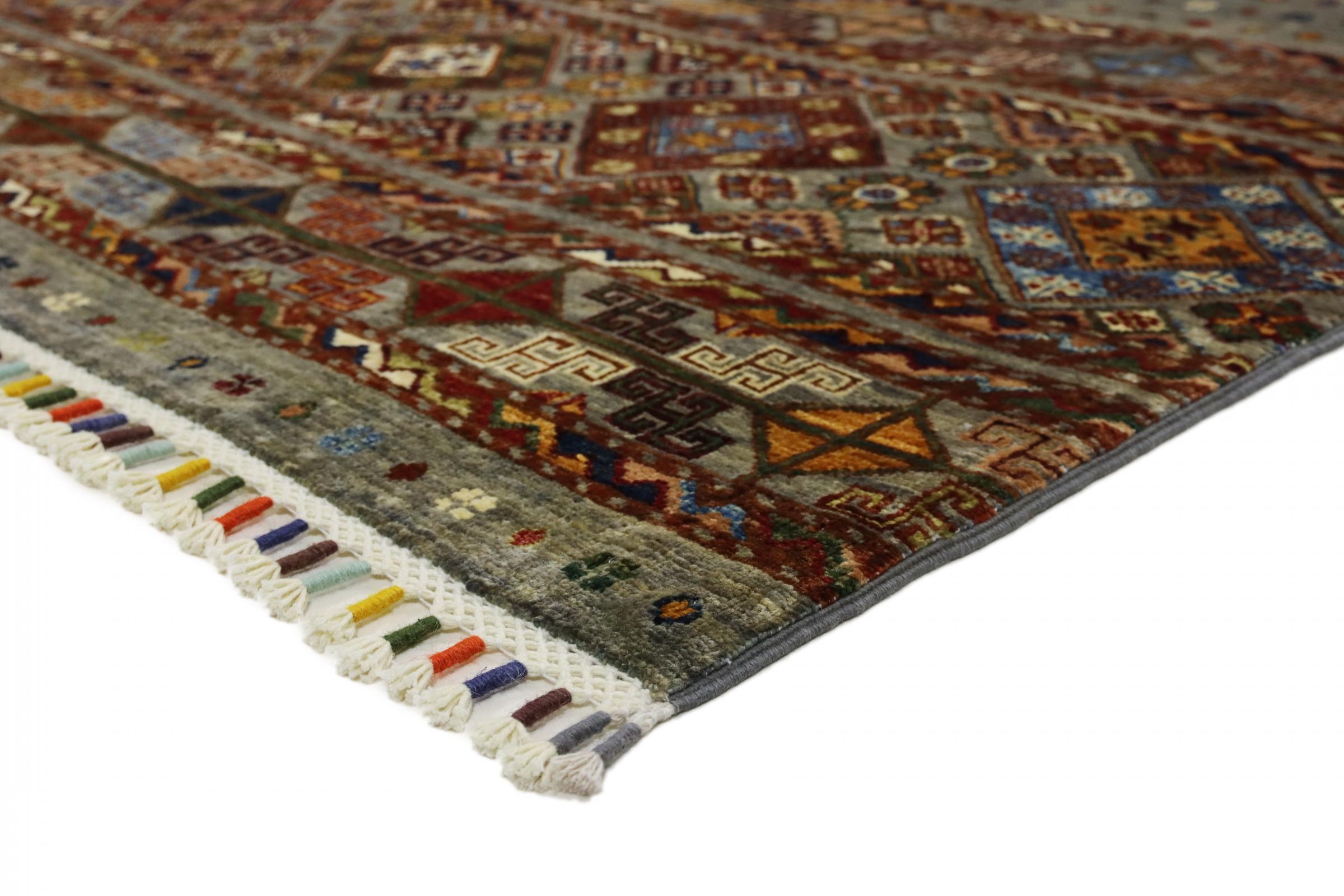 Este tapete é feito de lã de ovelha fiada à mão, da mais alta qualidade. Especialmente no Irão (antiga Pérsia), Afeganistão e Paquistão, a lã ainda é fiada à mão antes do início do nó do tapete. A lã tem provado ser um material natural e extremamente resistente ao longo dos séculos. Entre outras coisas, tem propriedades repelentes de impurezas e isolantes térmicos. Ao mesmo tempo, a lã é incomparavelmente macia e tem um brilho natural.
