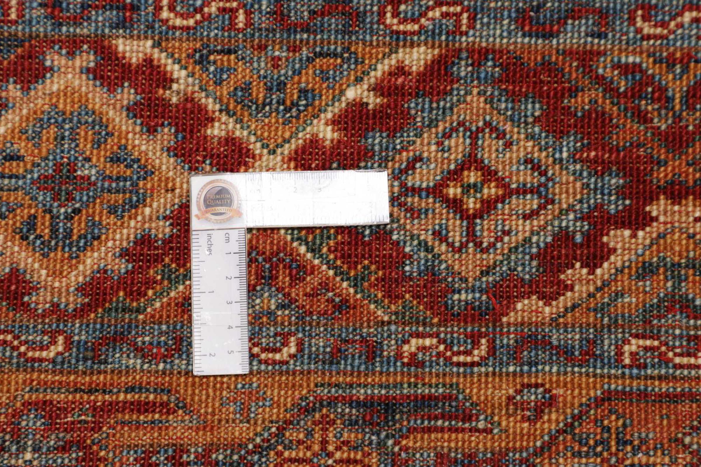Este tapete é feito de lã de ovelha fiada à mão, da mais alta qualidade. Especialmente no Irão (antiga Pérsia), Afeganistão e Paquistão, a lã ainda é fiada à mão antes do início do nó do tapete. A lã tem provado ser um material natural e extremamente resistente ao longo dos séculos. Entre outras coisas, tem propriedades repelentes de impurezas e isolantes térmicos. Ao mesmo tempo, a lã é incomparavelmente macia e tem um brilho natural.
