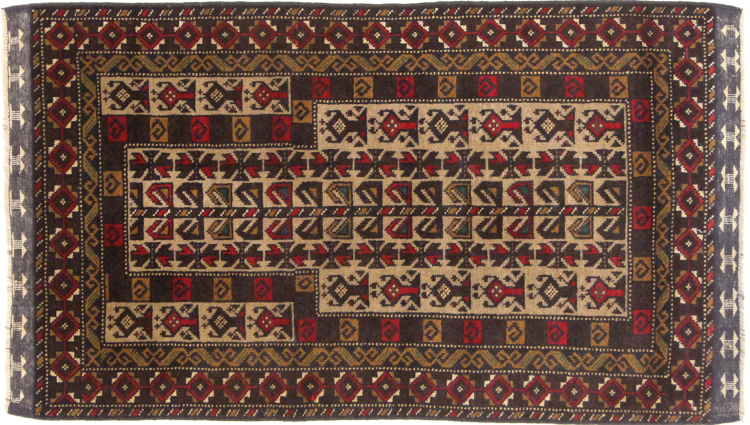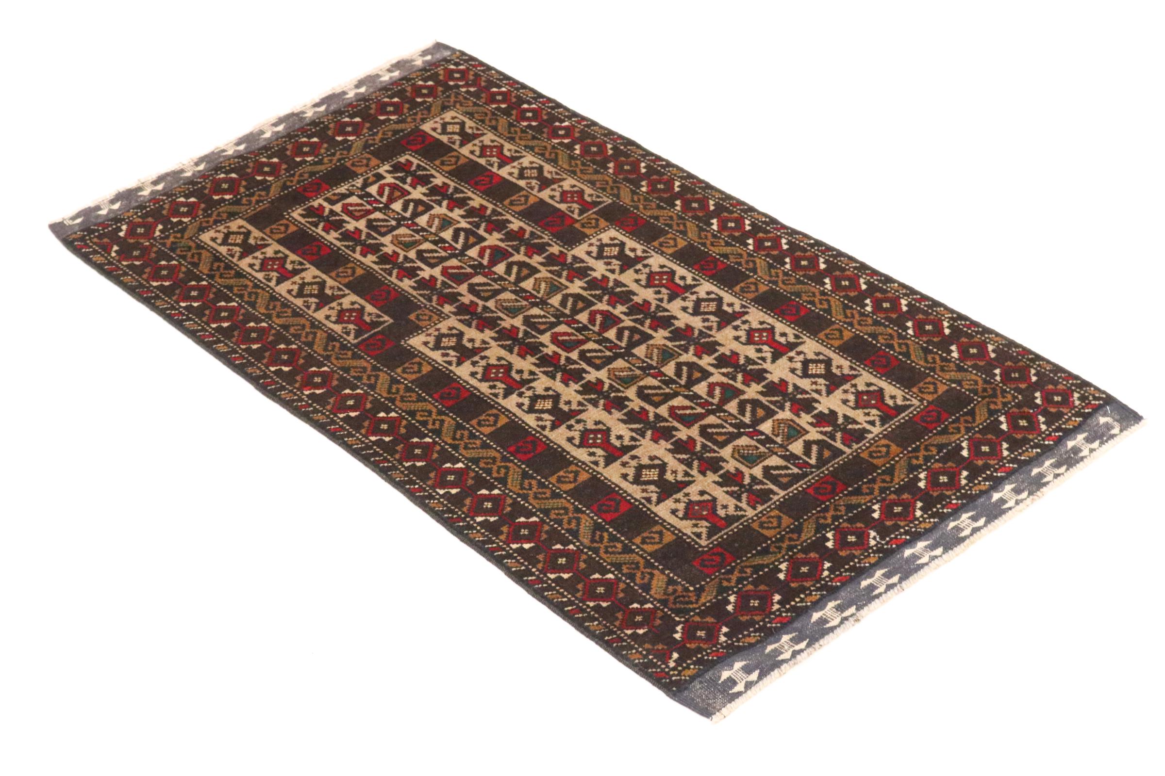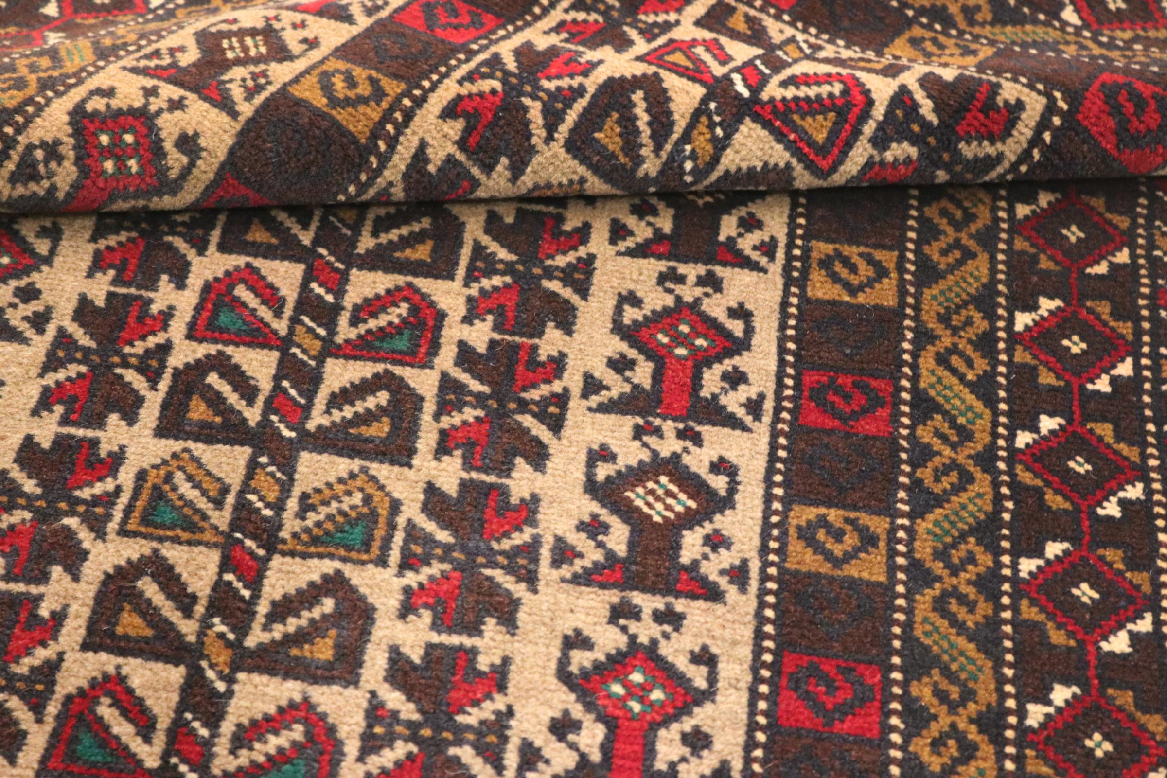 Este tapete Balúchi é um exemplo maravilhoso de arte nómada genuína. Fabricado na região fronteiriça entre o Irão e o Afeganistão, este tapete persa sabe como impressionar graças à sua trama densa e assimétrica. Os padrões vivos fazem dele um verdadeiro banquete para os olhos. Os tons escuros são típicos, espalhando um calor agradável. O seu belo fio natural transmite qualidade e torna-o extremamente durável. Típicos deste tapete são os padrões rectos que fazem dele um tapete nómada distinto.