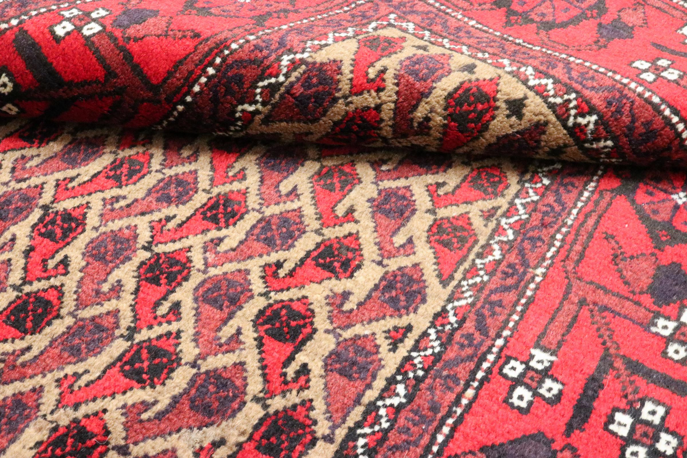 Este tapete Balúchi é um exemplo maravilhoso de arte nómada genuína. Fabricado na região fronteiriça entre o Irão e o Afeganistão, este tapete persa sabe como impressionar graças à sua trama densa e assimétrica. Os padrões vivos fazem dele um verdadeiro banquete para os olhos. Os tons escuros são típicos, espalhando um calor agradável. O seu belo fio natural transmite qualidade e torna-o extremamente durável. Típicos deste tapete são os padrões rectos que fazem dele um tapete nómada distinto.