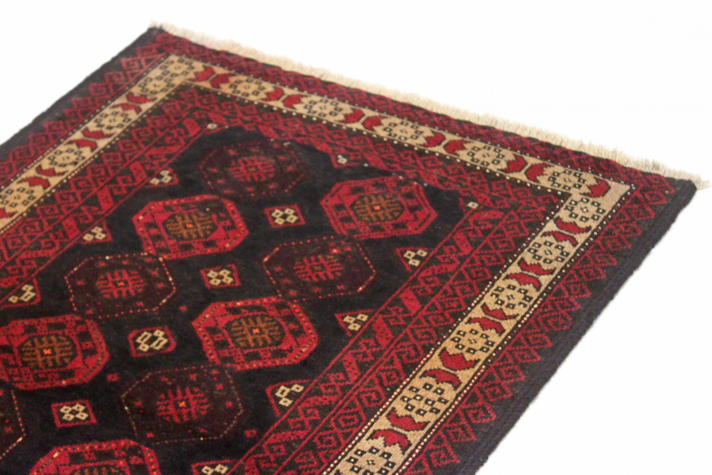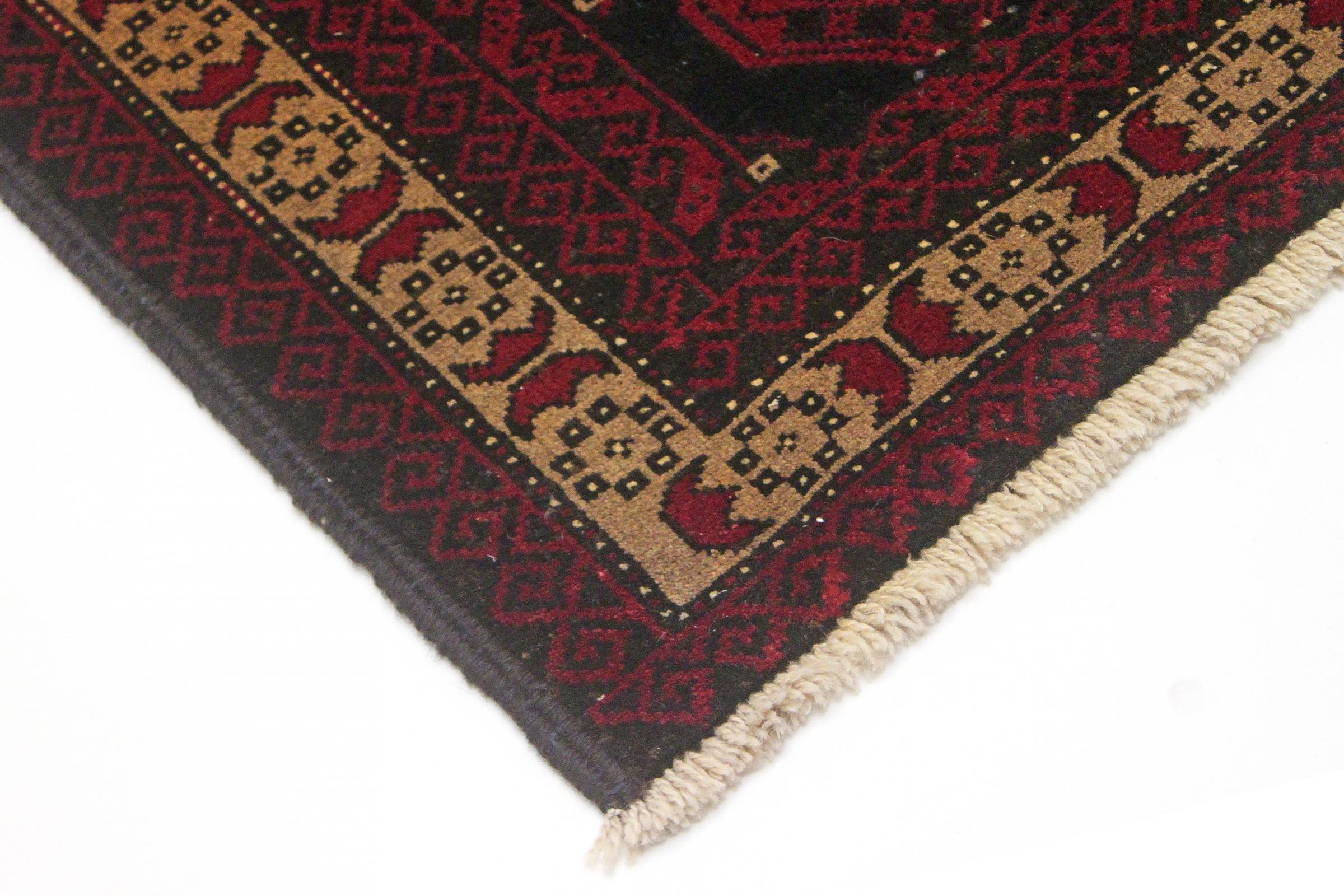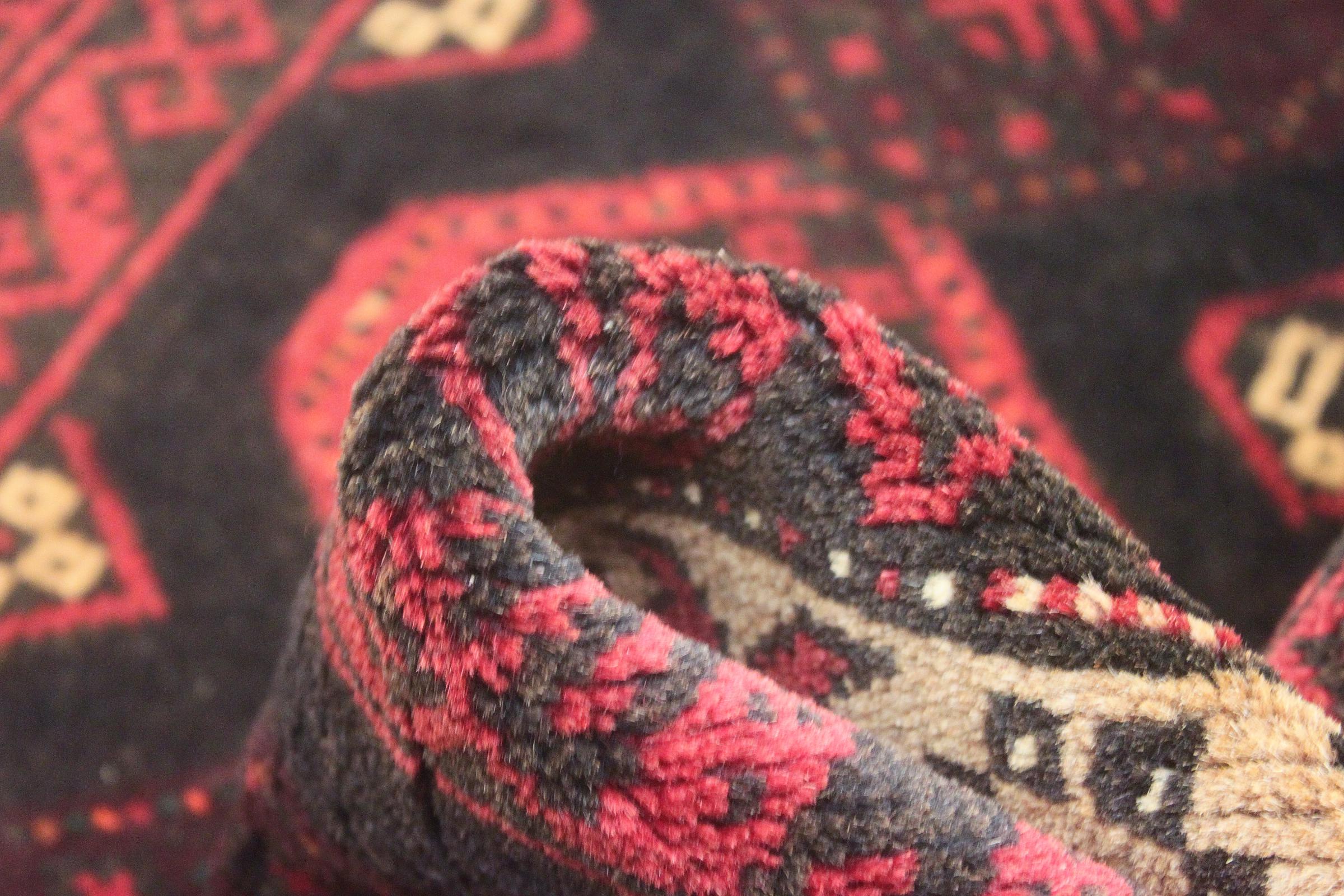 Este tapete Balúchi é um exemplo maravilhoso de arte nómada genuína. Fabricado na região fronteiriça entre o Irão e o Afeganistão, este tapete persa sabe como impressionar graças à sua trama densa e assimétrica. Os padrões vivos fazem dele um verdadeiro banquete para os olhos. Os tons escuros são típicos, espalhando um calor agradável. O seu belo fio natural transmite qualidade e torna-o extremamente durável. Típicos deste tapete são os padrões rectos que fazem dele um tapete nómada distinto.