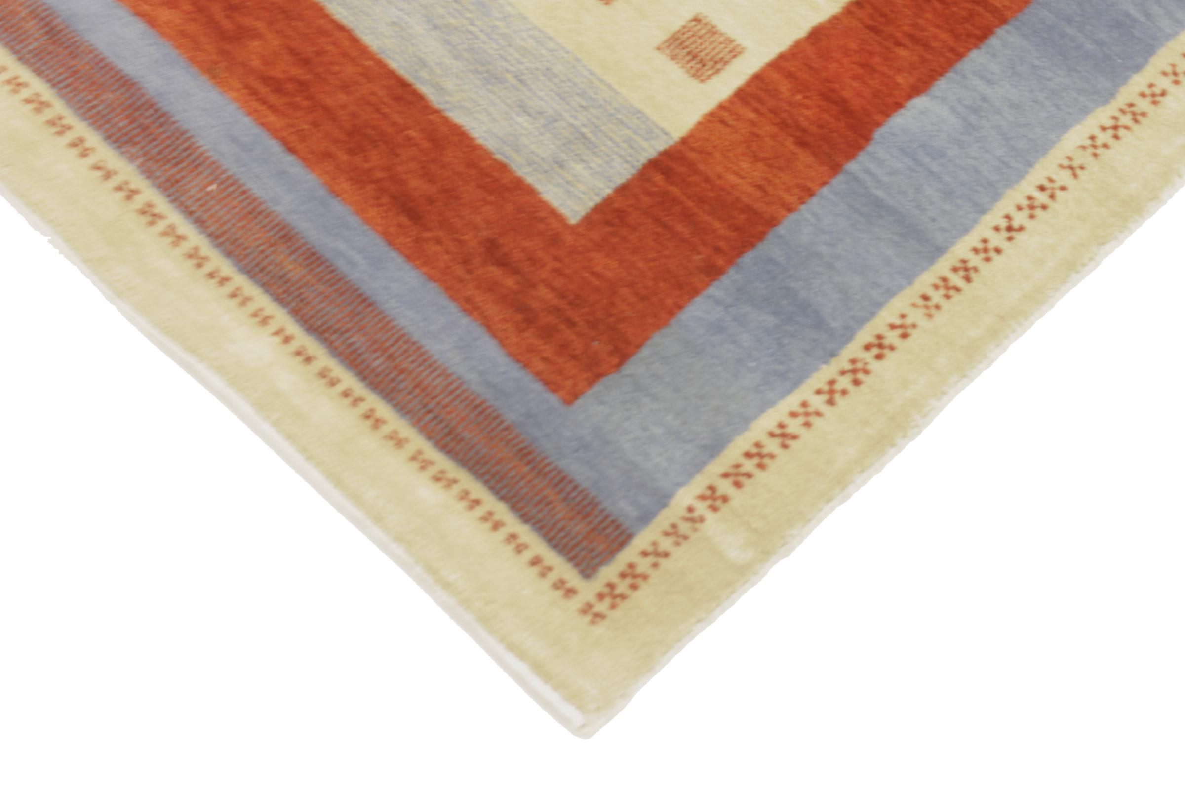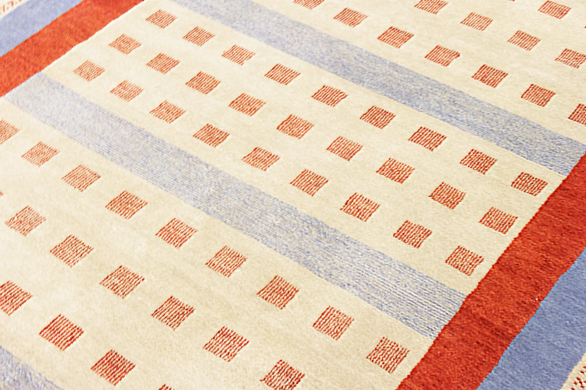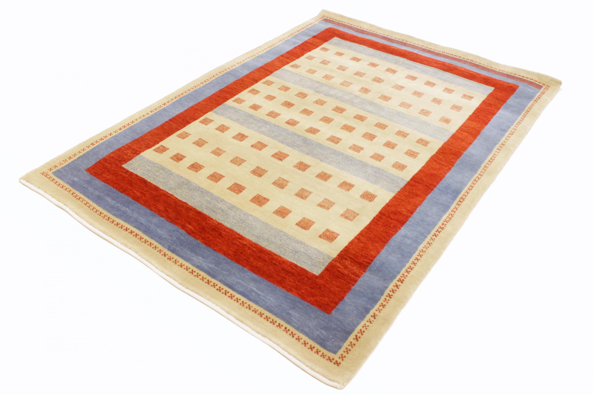 Este belo tapete Gabbeh foi atado à mão na Índia. Os tapetes indianos Gabbeh são feitos de lã de ovelha macia, são confortáveis nos pés e têm propriedades isolantes térmicas. Na sua maioria, os seus designs são simples e modernos e intemporais. Foram inspirados por povos nómadas, que deixaram fluir para os tapetes motivos muito simples do seu ambiente. Os tapetes Gabbeh indianos não se aproximam muito da qualidade de um Gabbeh persa, mas têm uma relação preço-desempenho muito boa. Por isso, são perfeitamente adequados como tapetes para principiantes.