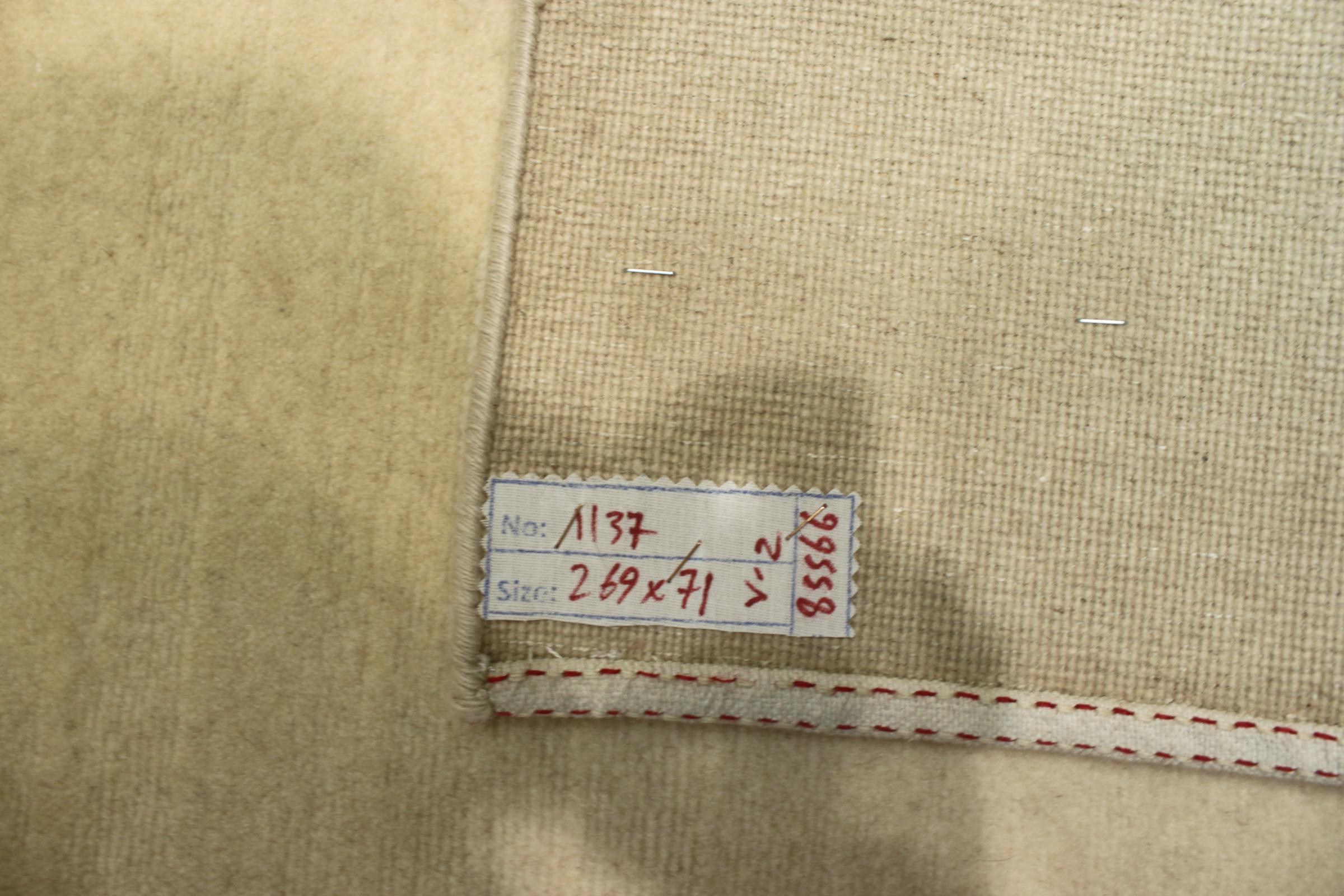 Nº do Tapete: 35111004324838 Tamanho: 270x72 cm Espessura: aproximadamente 10 mm Nós: 160 000 - 200 000 / m² Processamento: Atado à mão Veludo: Lã Natural Urdidura: Algodão Origem: Índia Idade: Novo Peso: aproximadamente 7 kg Em armazém: Único