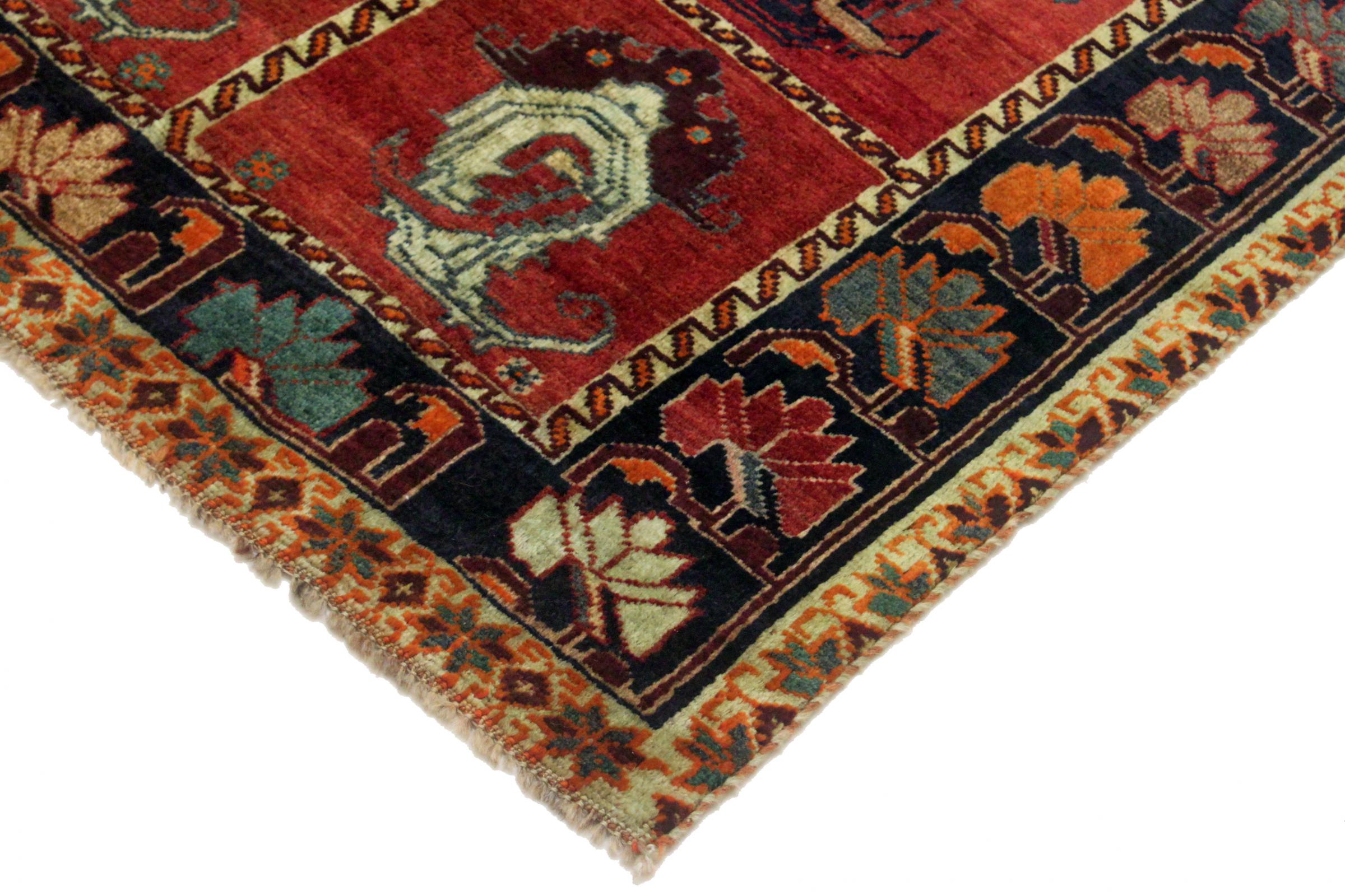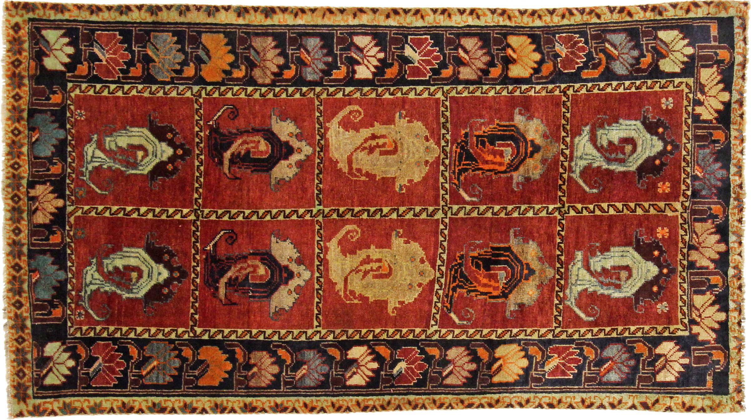 Este ghashghai é um verdadeiro destaque. As suas cores e padrões reflectem a vida dos nómadas ghashghai do Irão. Estas tribos nómadas vivem principalmente nos arredores da cidade de Shiraz. Deixe um pedaço da antiga cultura persa entrar nas suas próprias quatro paredes.