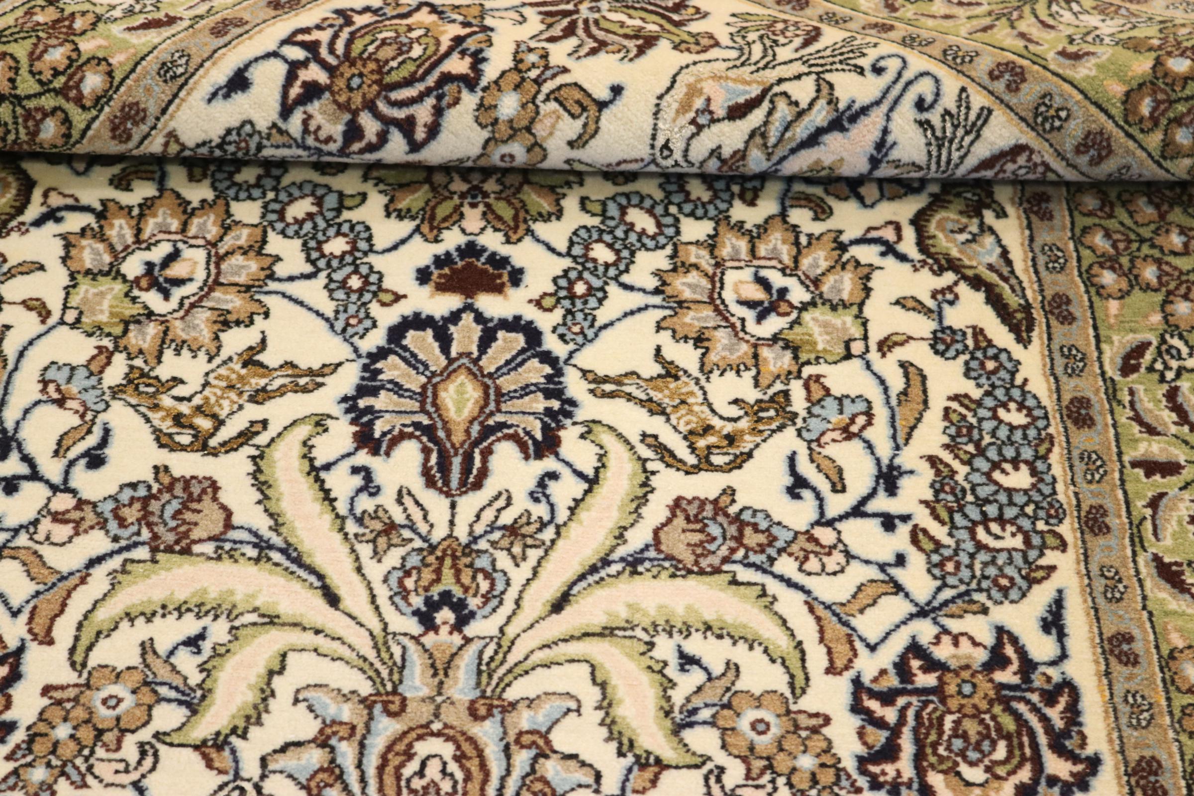 Esta cortiça Ghom é o resultado da mais elevada qualidade artesanal. O seu pelo fino e a sua urdidura convencem mesmo os coleccionadores de tapetes. Este tapete persa foi tricotado à mão na cidade sagrada de Ghom a partir da melhor lã de cortiça. A lã de cortiça é particularmente macia e gordurosa, uma vez que é tosquiada exclusivamente na zona do pescoço da ovelha. Um tapete persa dificilmente poderia ser mais bonito e macio. Esse destaque ganhou sua própria categoria conosco.