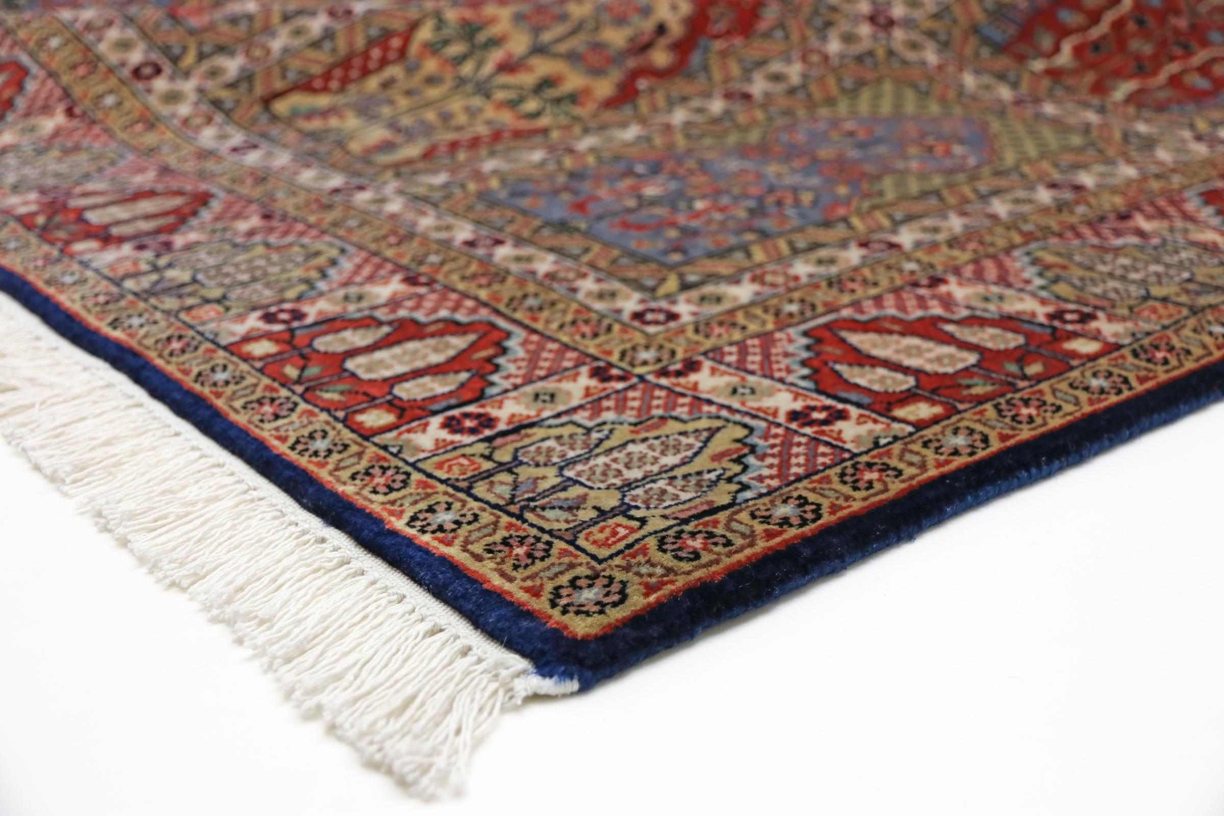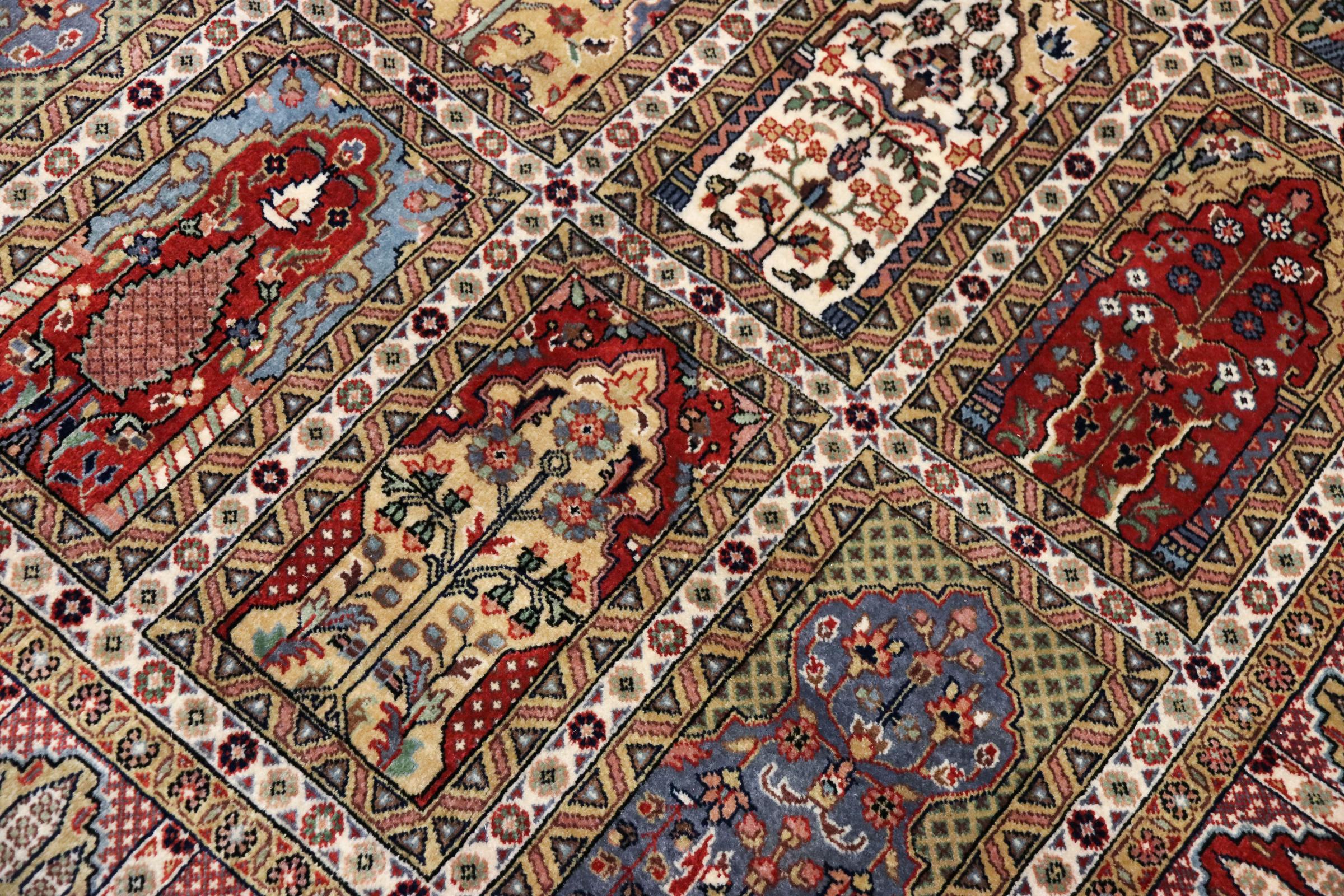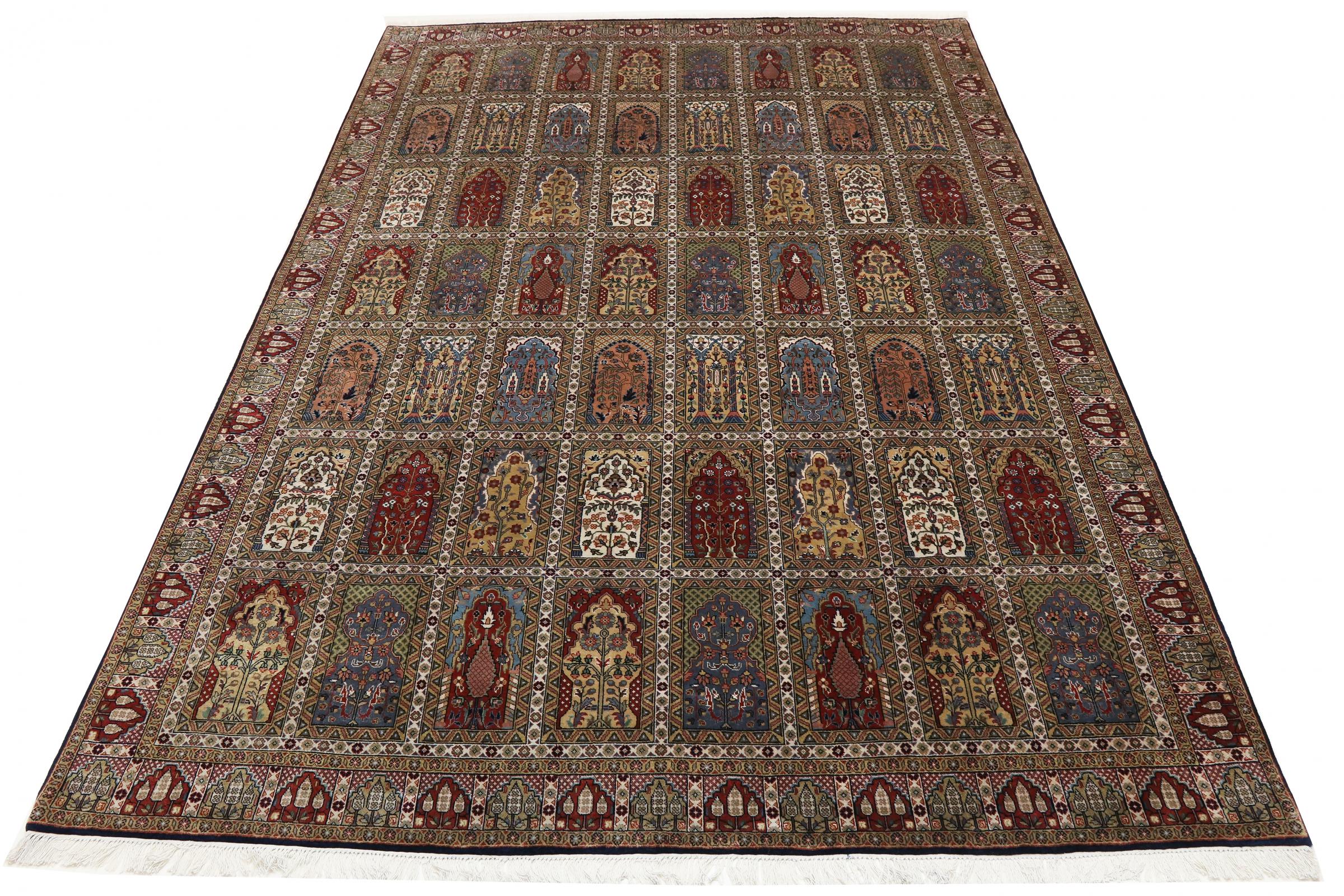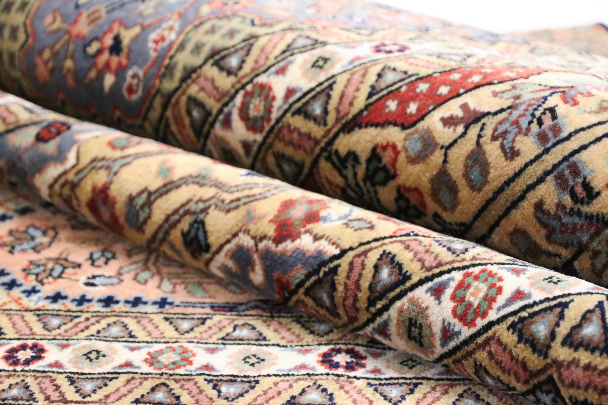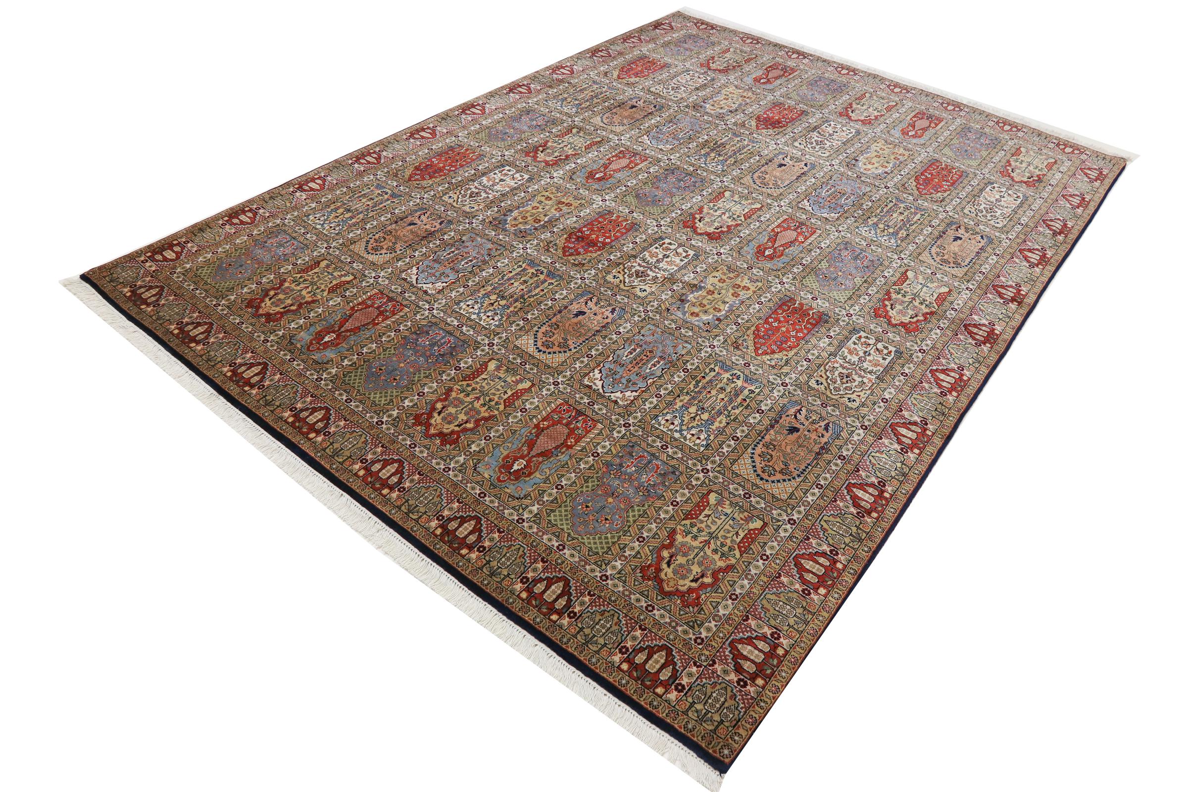 Este tapete Indo Ghom atado à mão é inspirado no design dos famosos tapetes Ghom persas. Oferece uma qualidade soberba feita à mão na arte tradicional indiana de atar.
