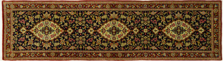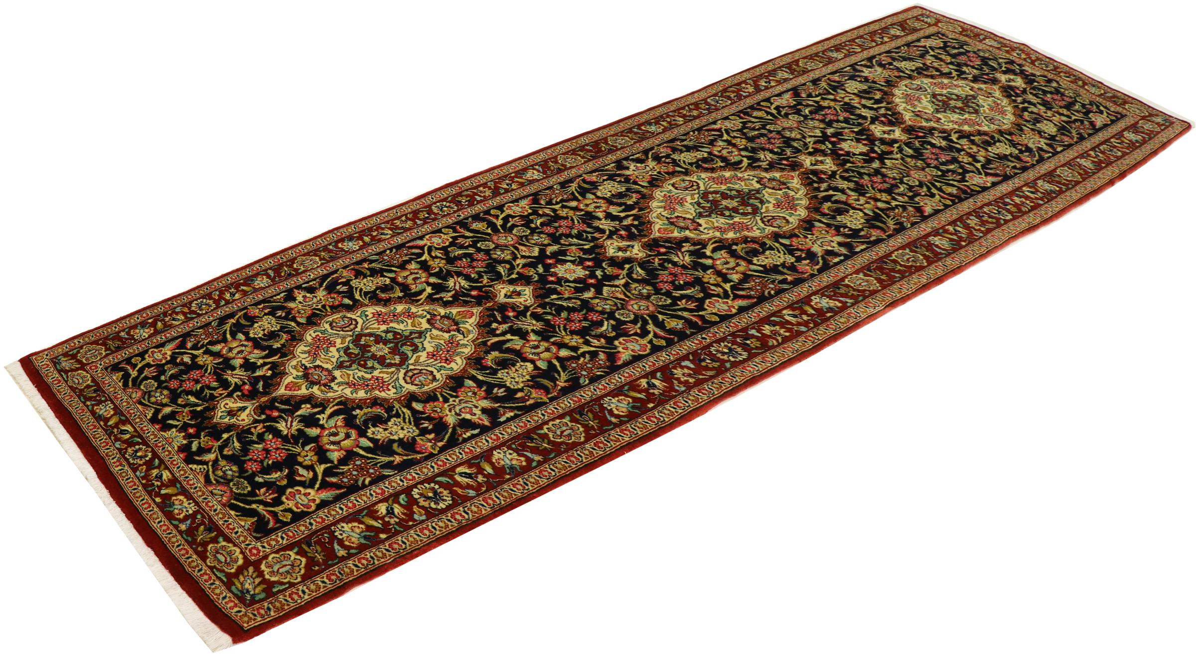 Nº do Tapete: 303912002663779 Tamanho: 306x83 cm Espessura: aproximadamente 5 mm Nós: 440 000 - 490 000 / m² Processamento: Atado à mão Veludo: Lã de cortiça Urdidura: Algodão Origem: Pérsia / Iran Idade: Novo Peso: aproximadamente 9 kg Em armazém: Único - Apenas 1 em stock