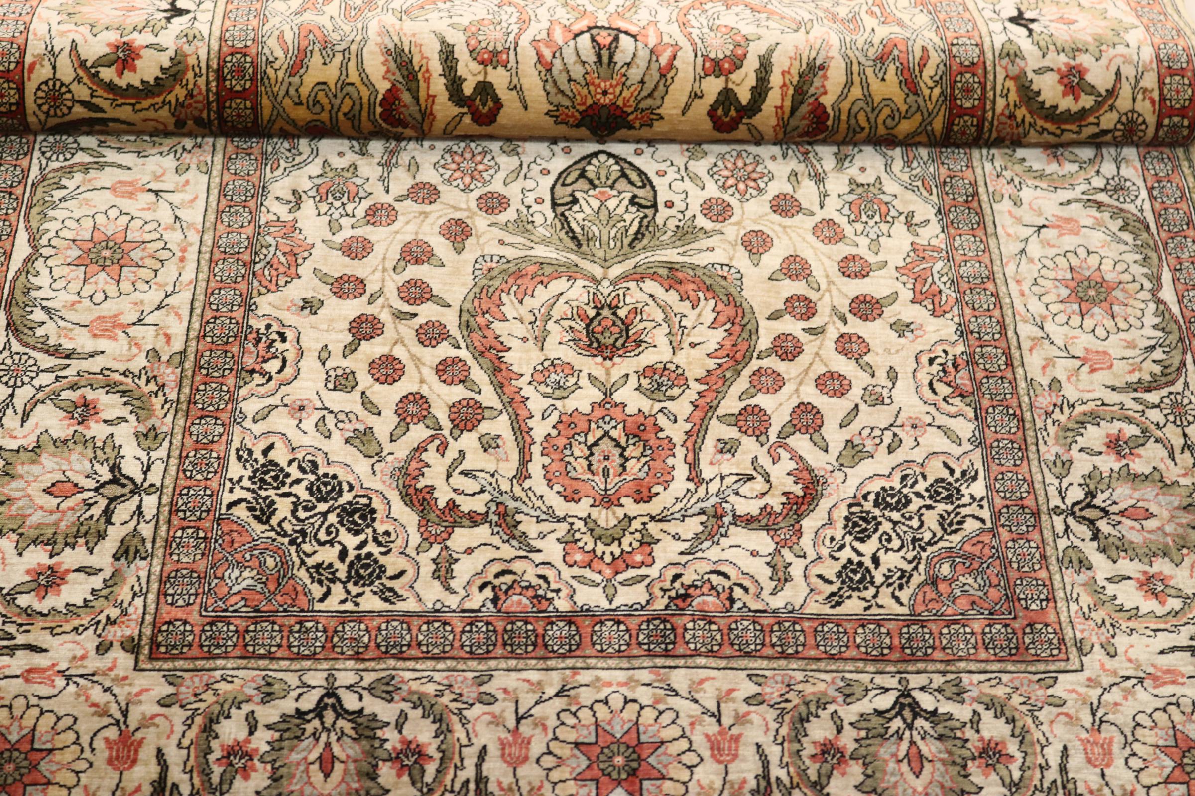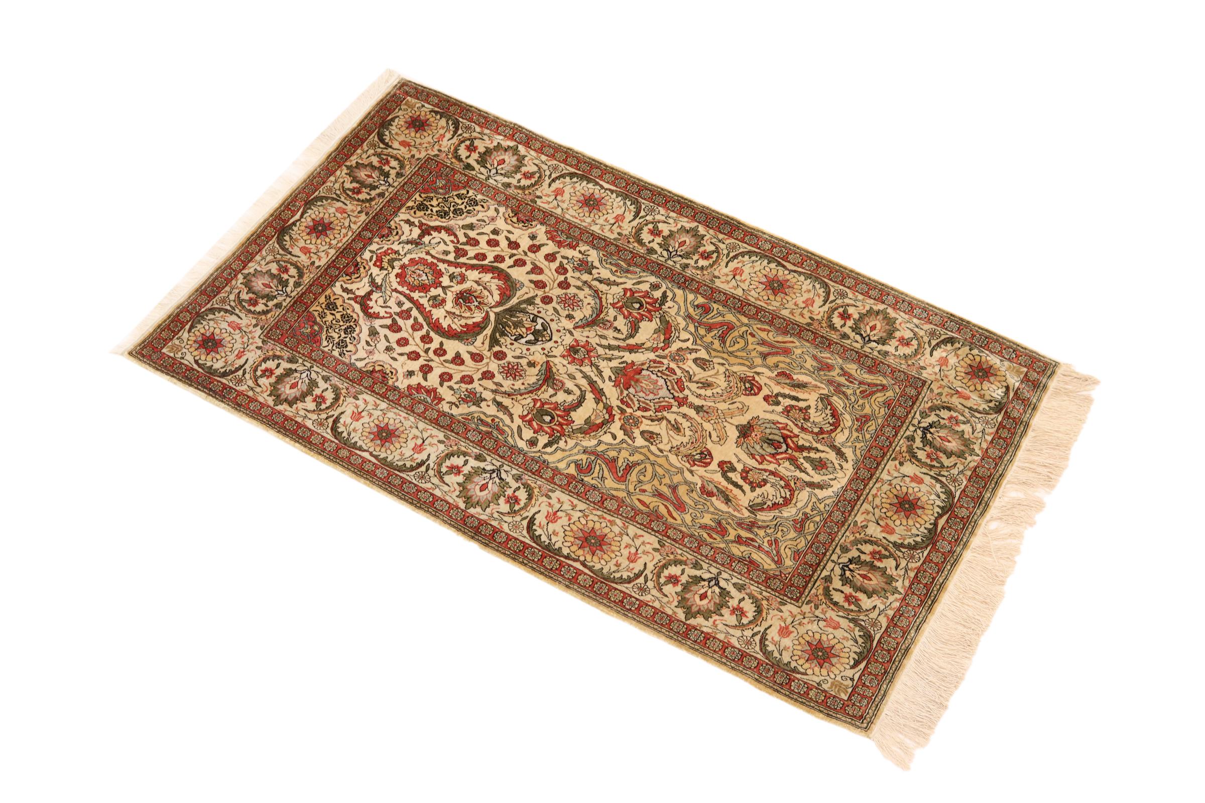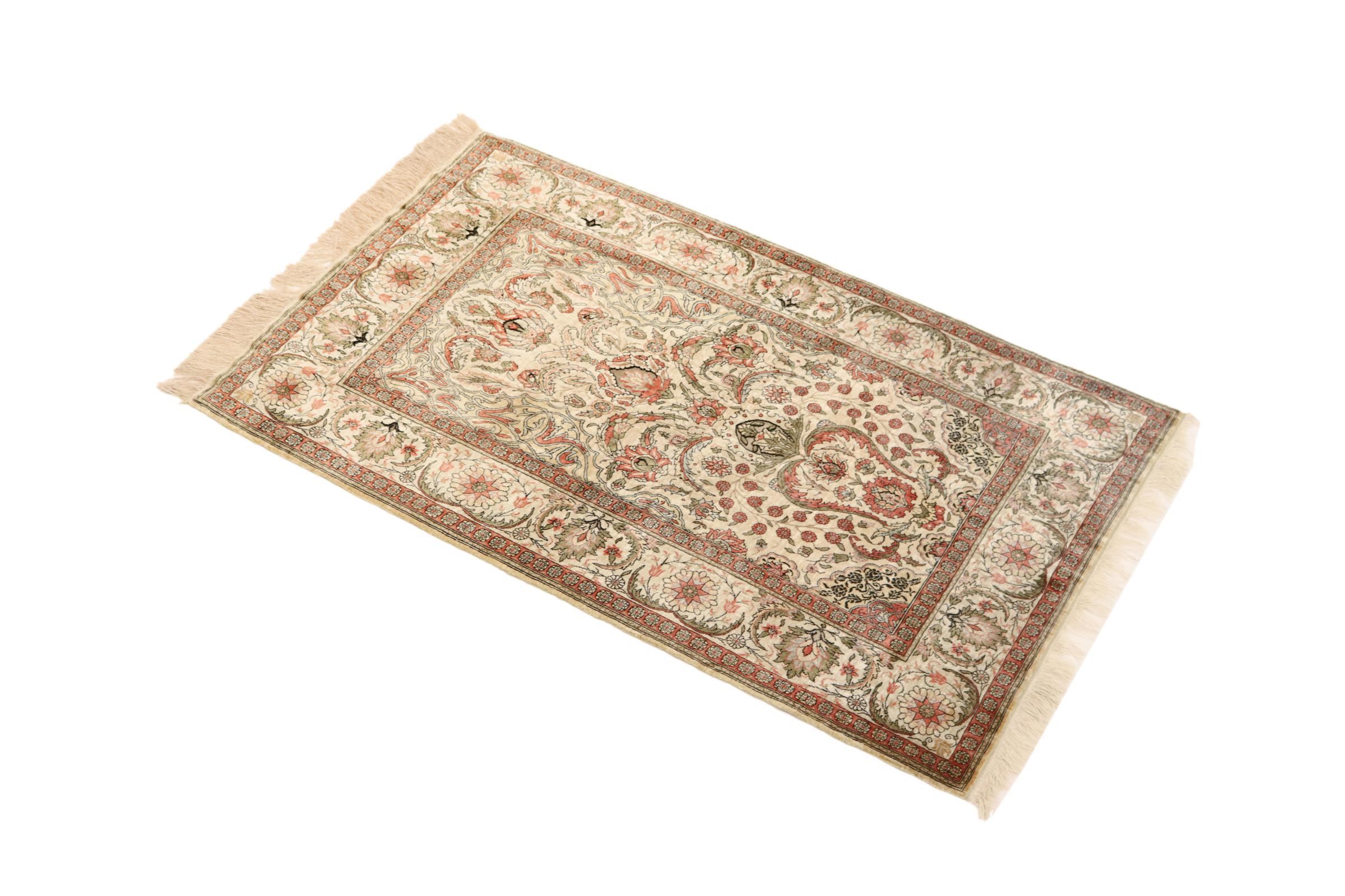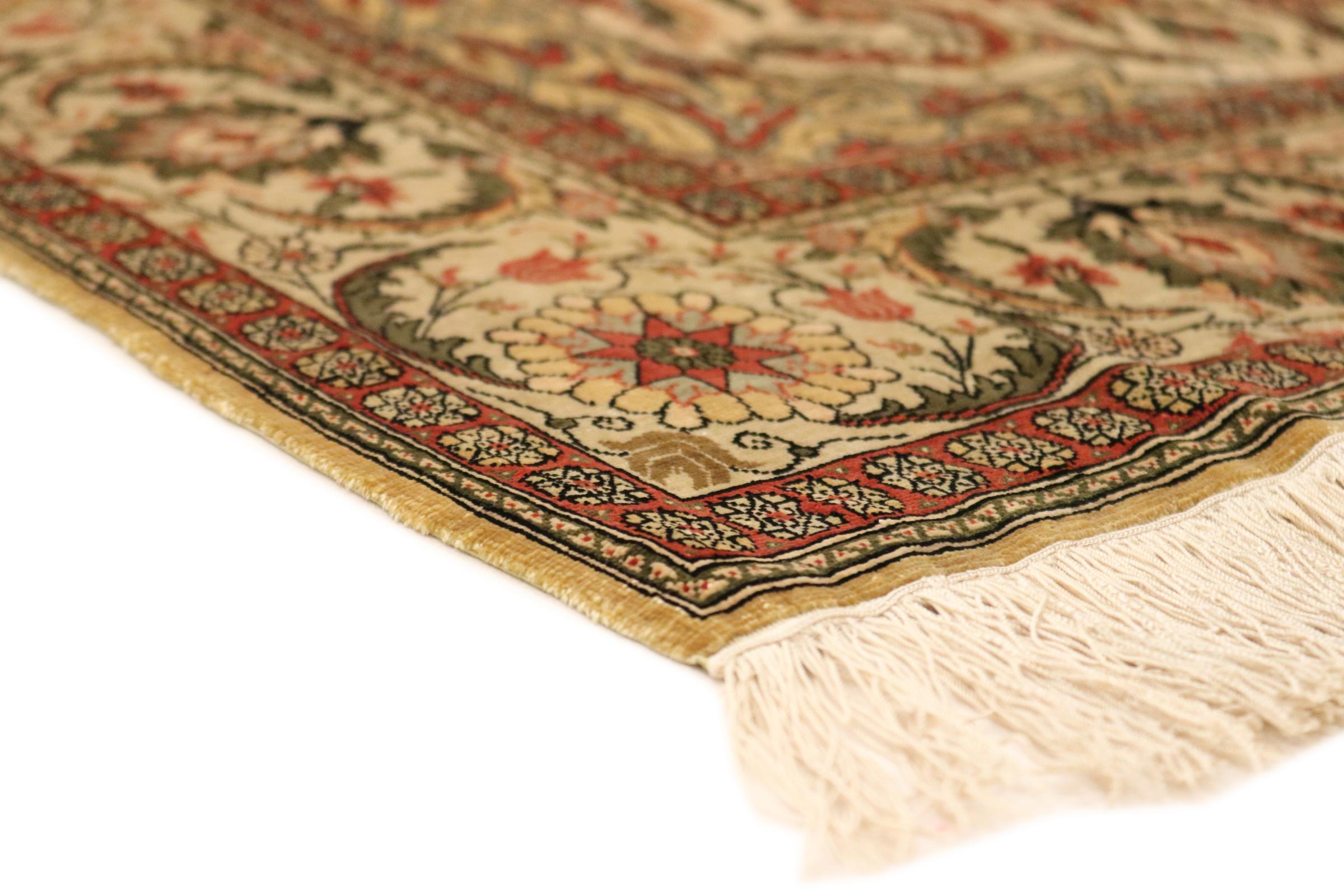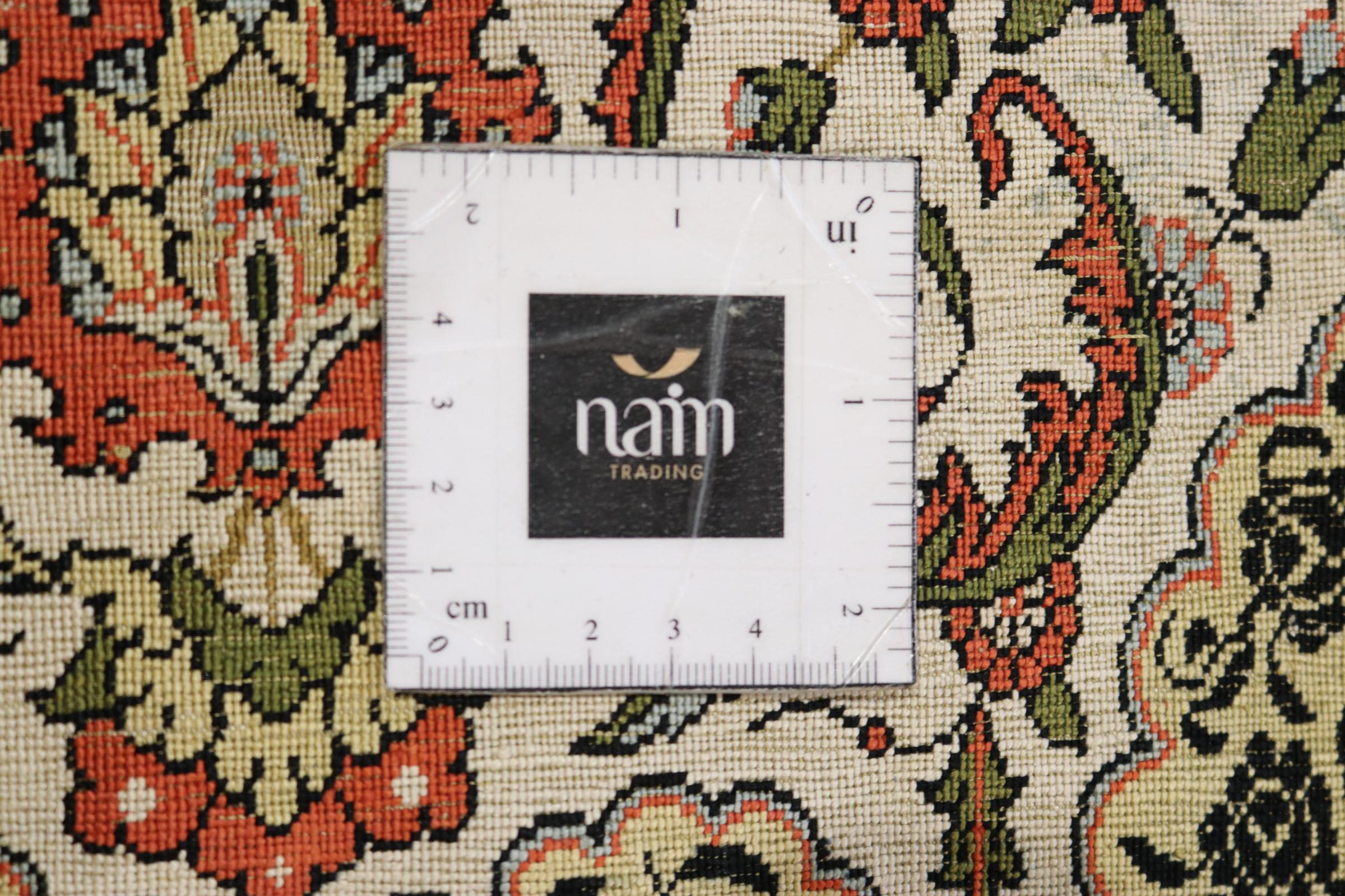 Este tapete de seda Ghom é puro luxo. Os seus ornamentos e a seda natural pura falam por si. Aqui encontrará o Oriente em toda a sua perfeição para a sua casa. Um tapete de seda de Ghom impressiona até os coleccionadores de arte de tapetes persas. Dependendo da incidência da luz, a seda permite que as cores brilhem nas mais diversas facetas. Isso faz deste tapete persa um destaque inesquecível e fará com que seu quarto brilhe num ambiente aconchegante e de altíssima qualidade.