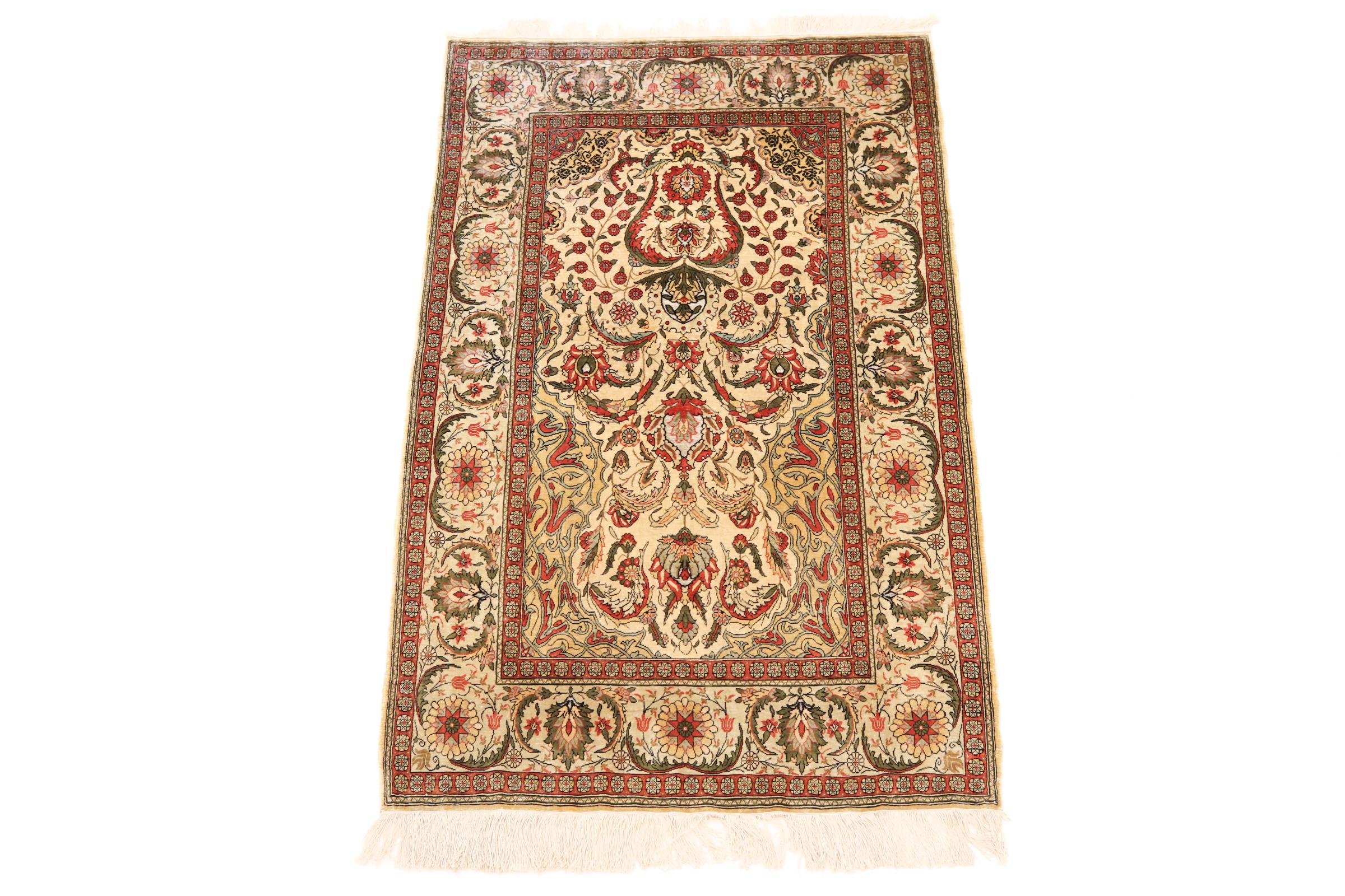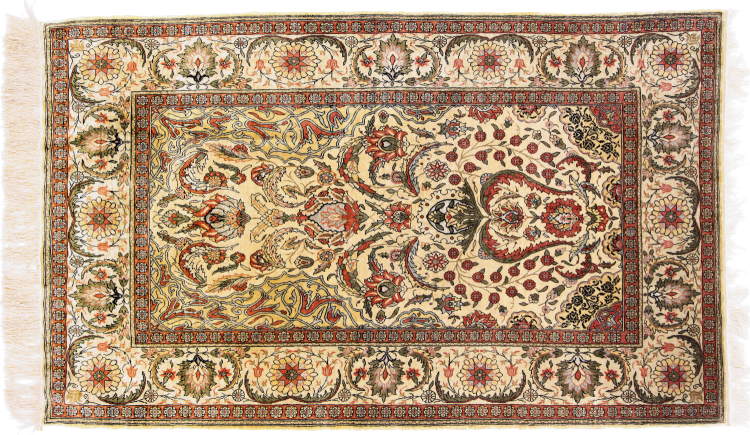 Nº do Tapete: 20221200869281 Tamanho: 119x74 cm Espessura: aproximadamente 3 mm Nós: 900 000 / m² Processamento: Atado à mão Veludo: Seda Urdidura: Seda Origem: Pérsia / Iran Idade: Novo Peso: aproximadamente 2 kg Em armazém: Único - Apenas 1 em stock