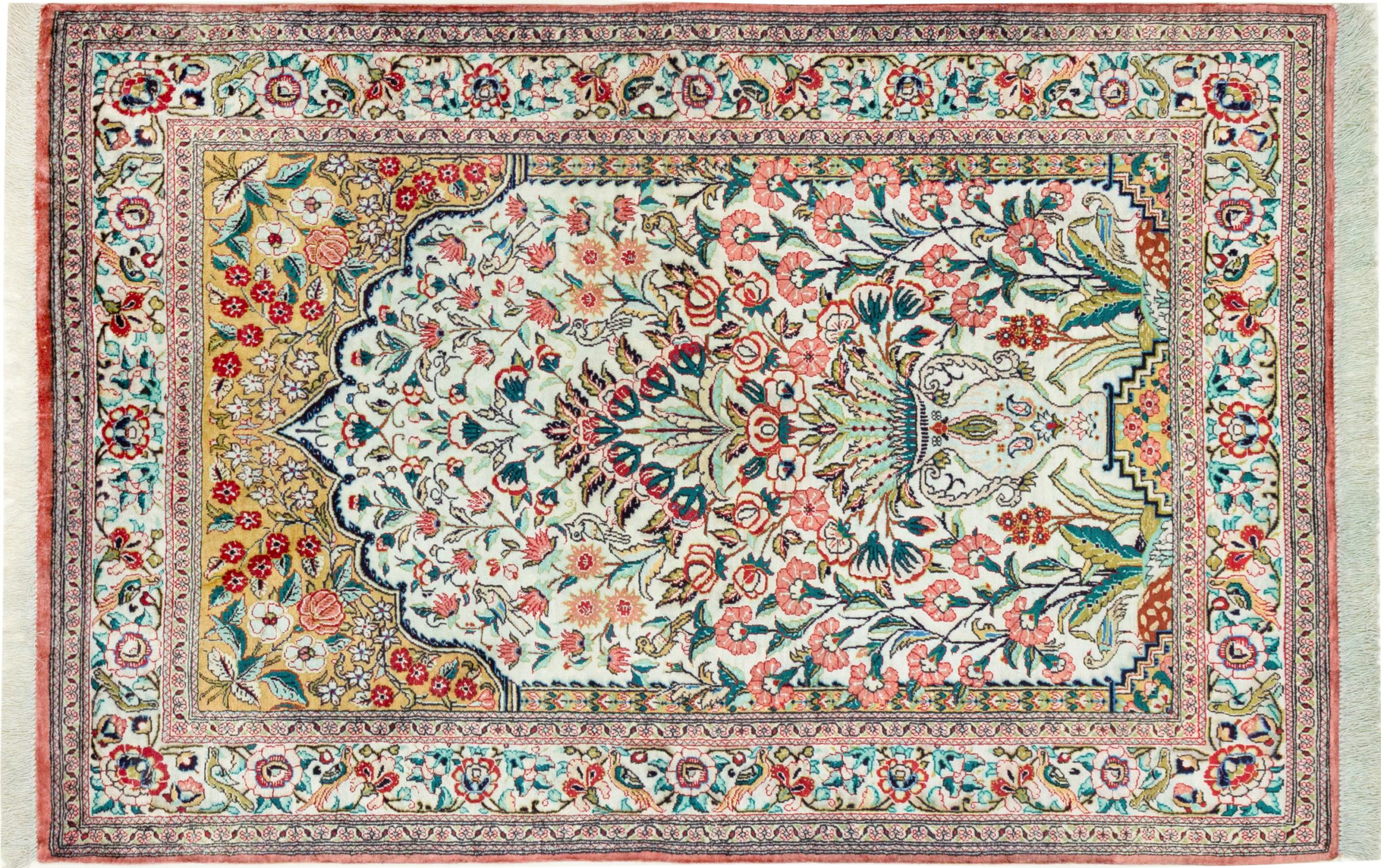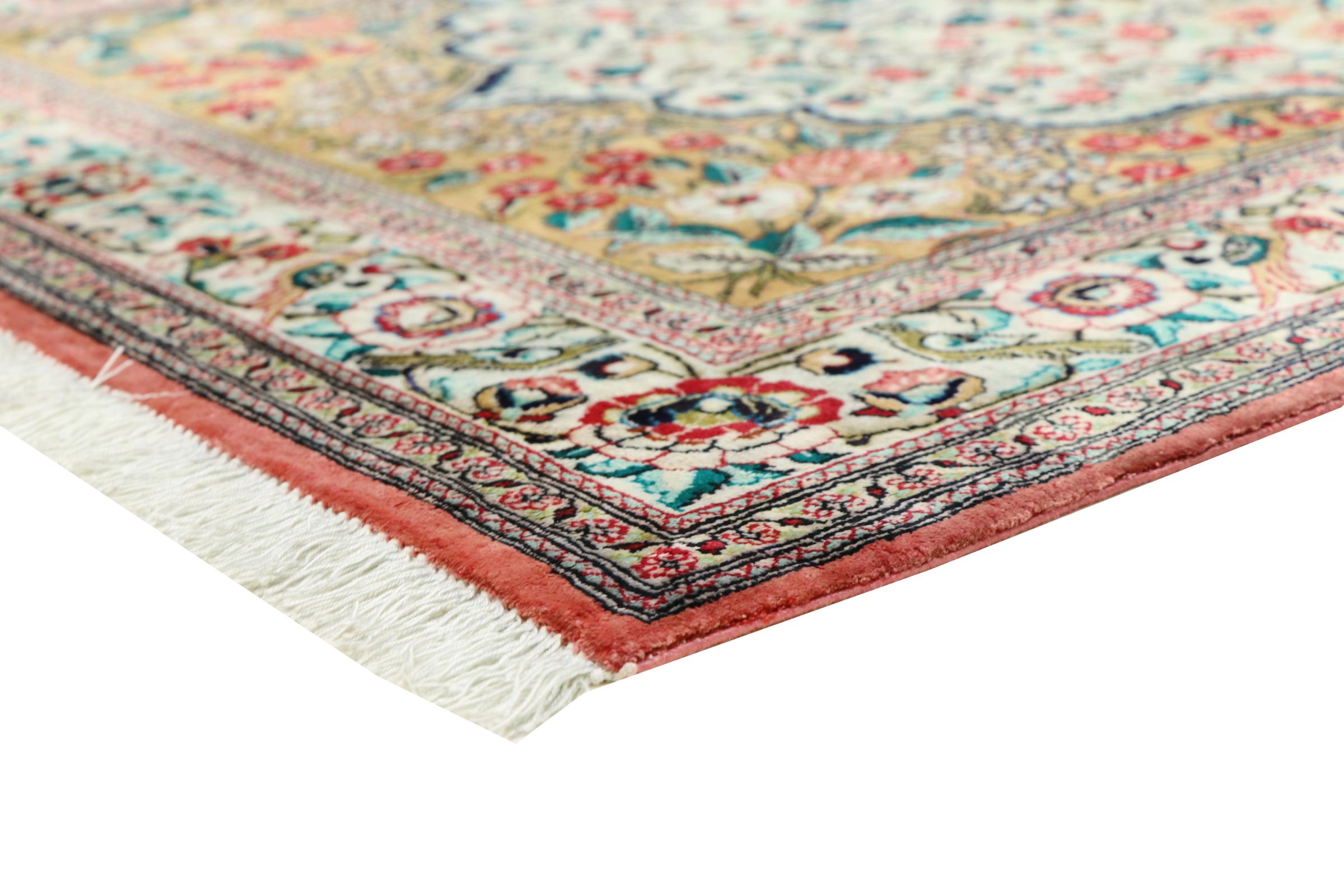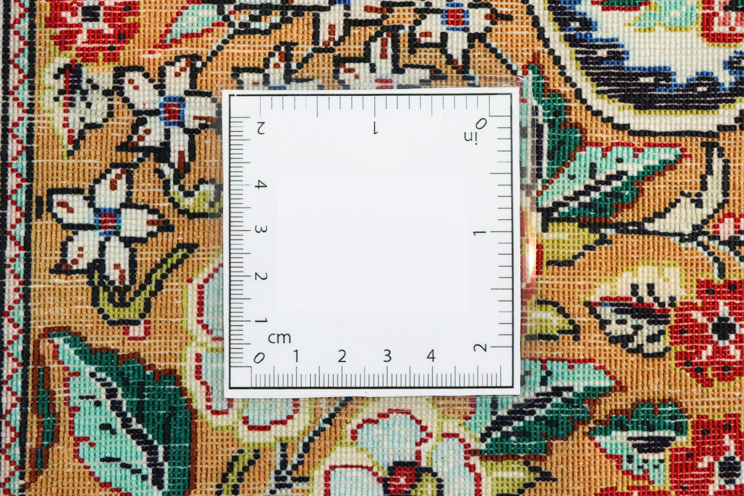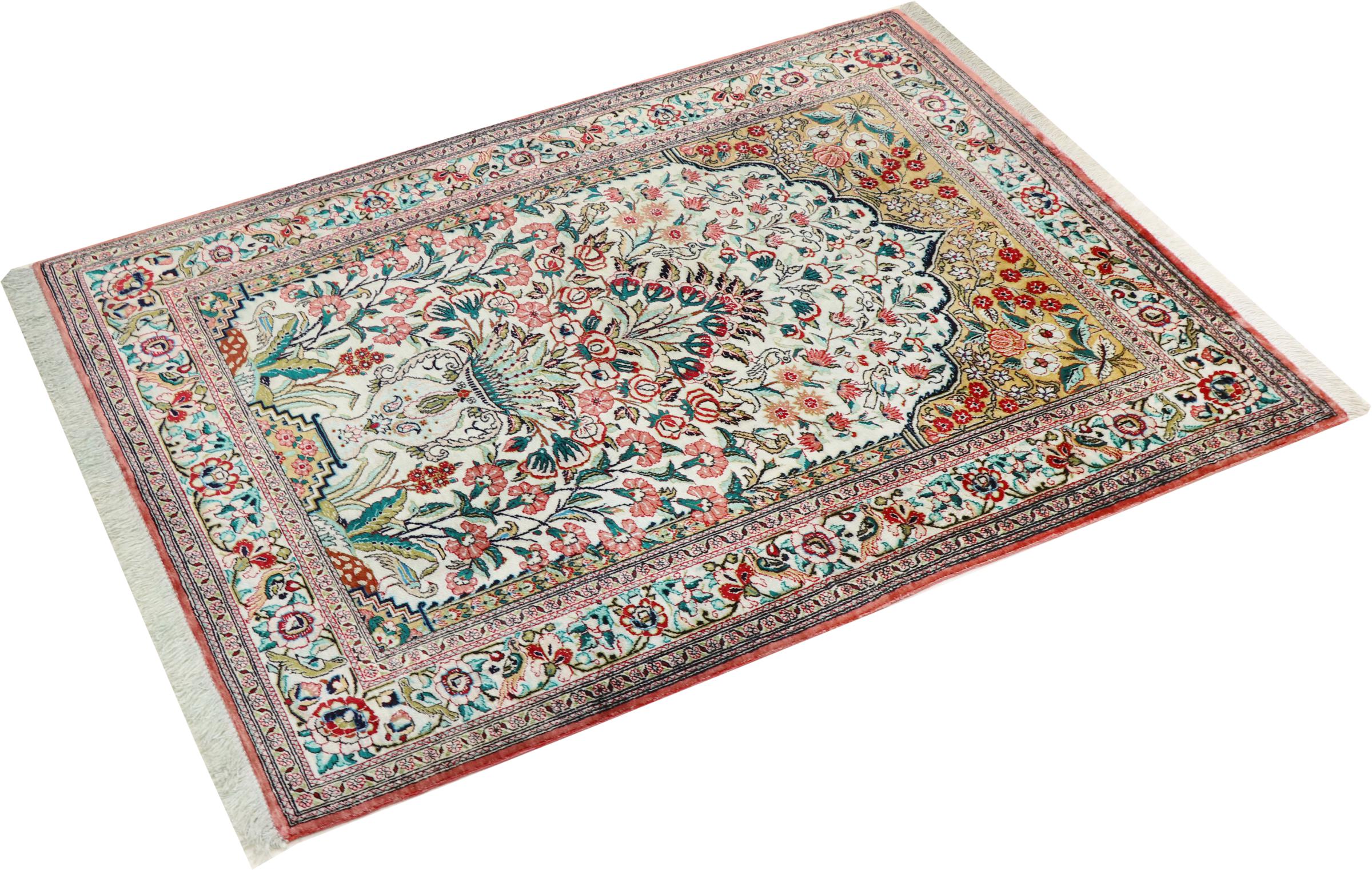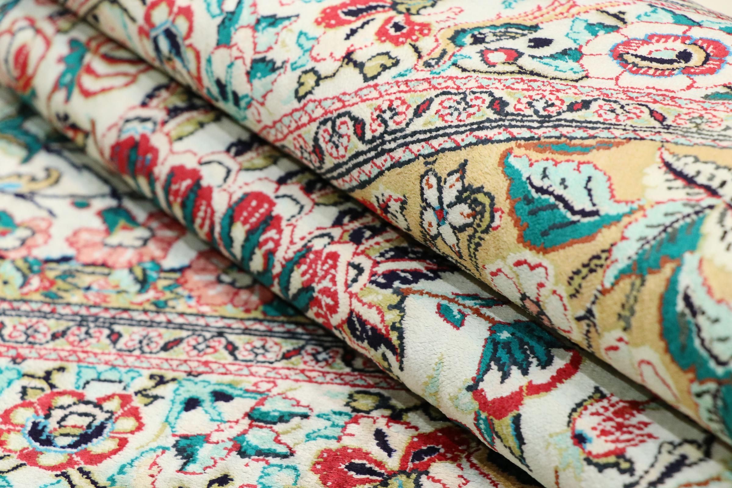 Este tapete de seda Ghom é puro luxo. Os seus ornamentos e a seda natural pura falam por si. Aqui encontrará o Oriente em toda a sua perfeição para a sua casa. Um tapete de seda de Ghom impressiona até os coleccionadores de arte de tapetes persas. Dependendo da incidência da luz, a seda permite que as cores brilhem nas mais diversas facetas. Isso faz deste tapete persa um destaque inesquecível e fará com que seu quarto brilhe num ambiente aconchegante e de altíssima qualidade.
