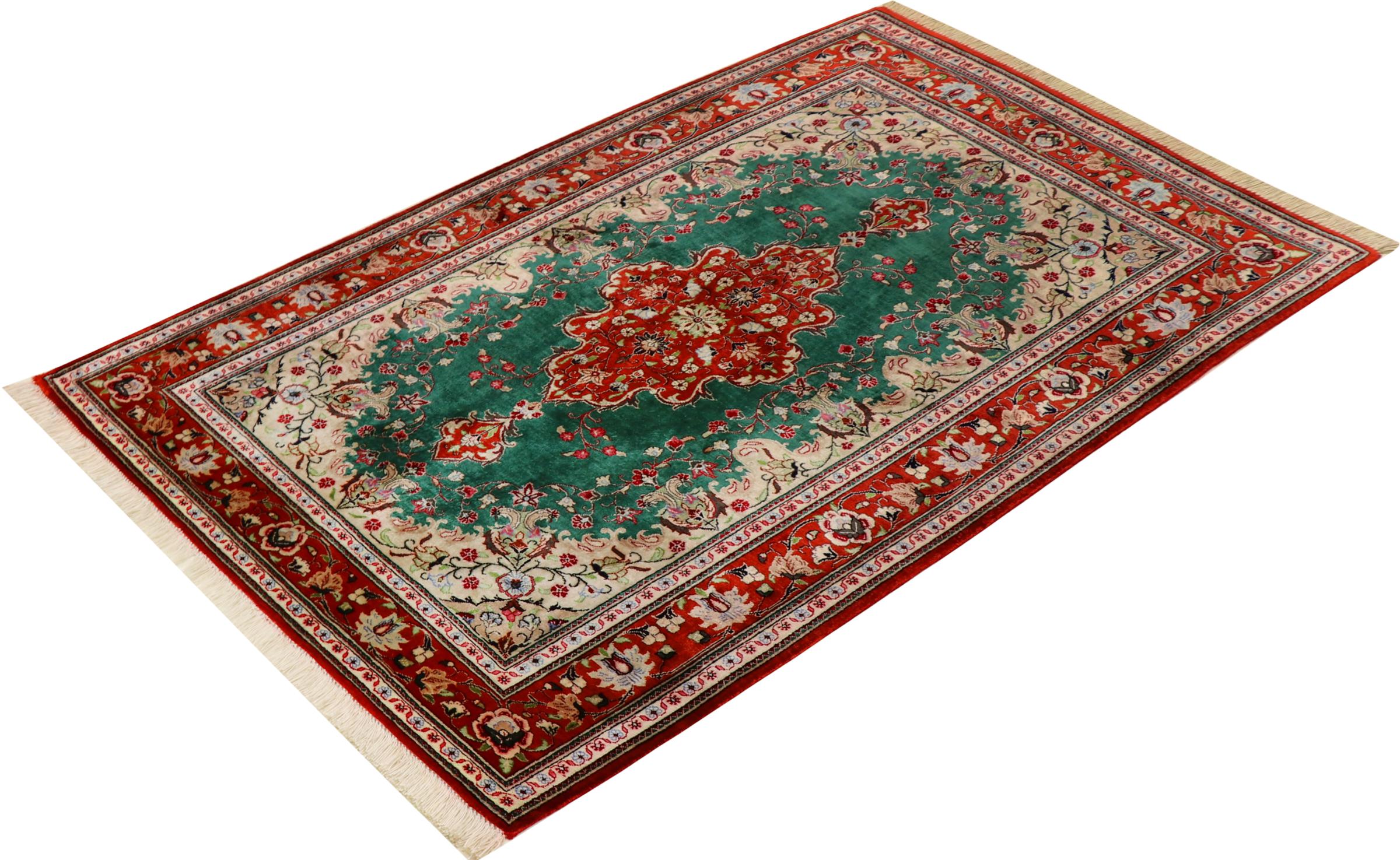 Este tapete de seda Ghom é puro luxo. Os seus ornamentos e a seda natural pura falam por si. Aqui encontrará o Oriente em toda a sua perfeição para a sua casa. Um tapete de seda de Ghom impressiona até os coleccionadores de arte de tapetes persas. Dependendo da incidência da luz, a seda permite que as cores brilhem nas mais diversas facetas. Isso faz deste tapete persa um destaque inesquecível e fará com que seu quarto brilhe num ambiente aconchegante e de altíssima qualidade.
