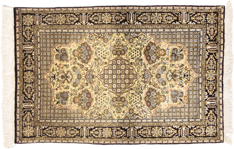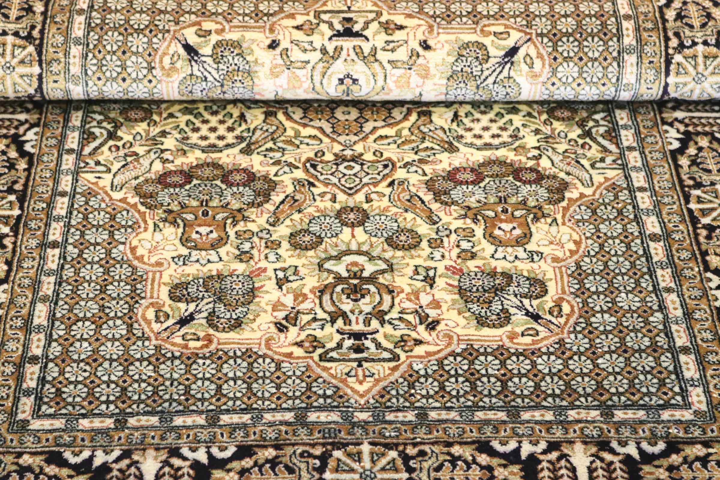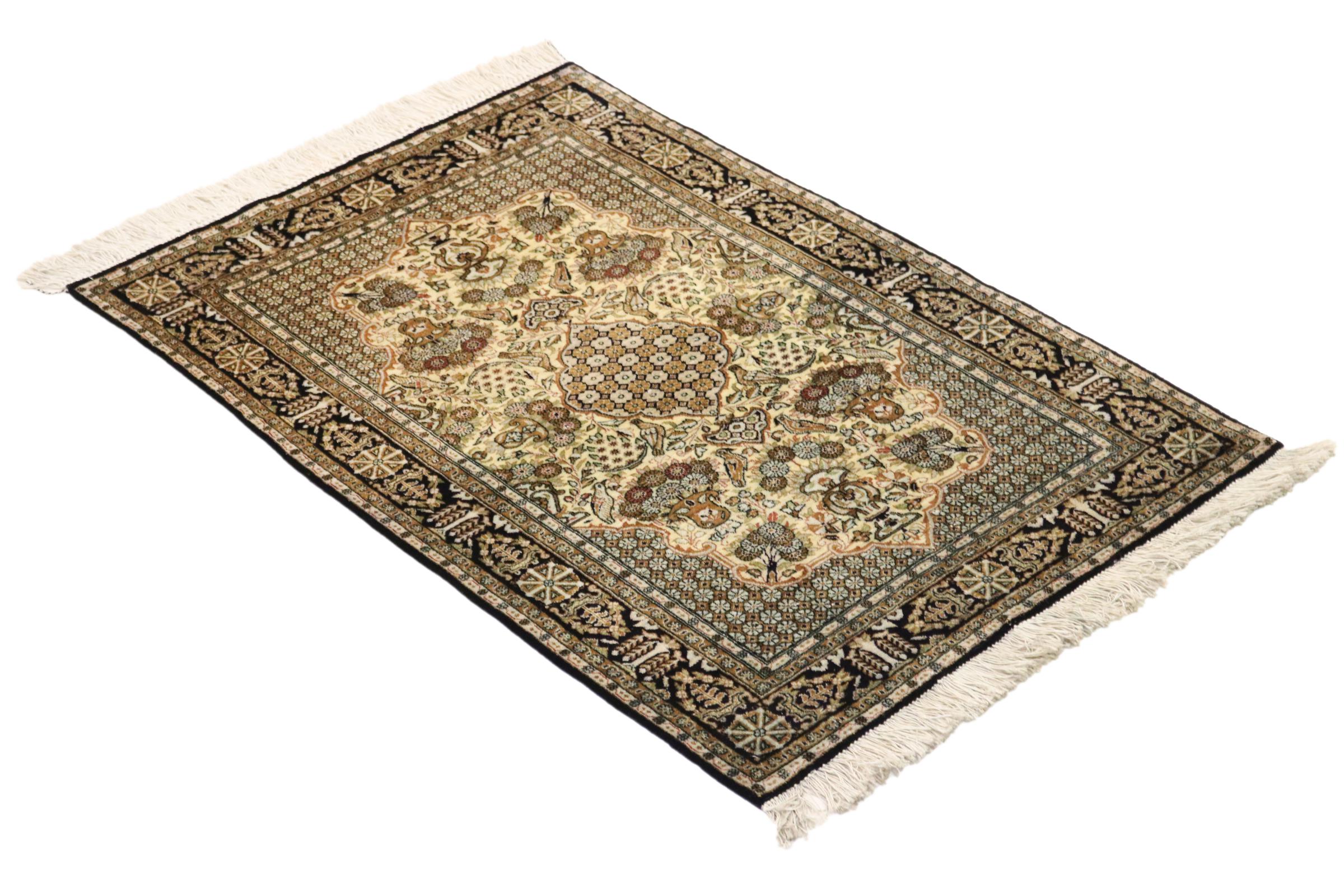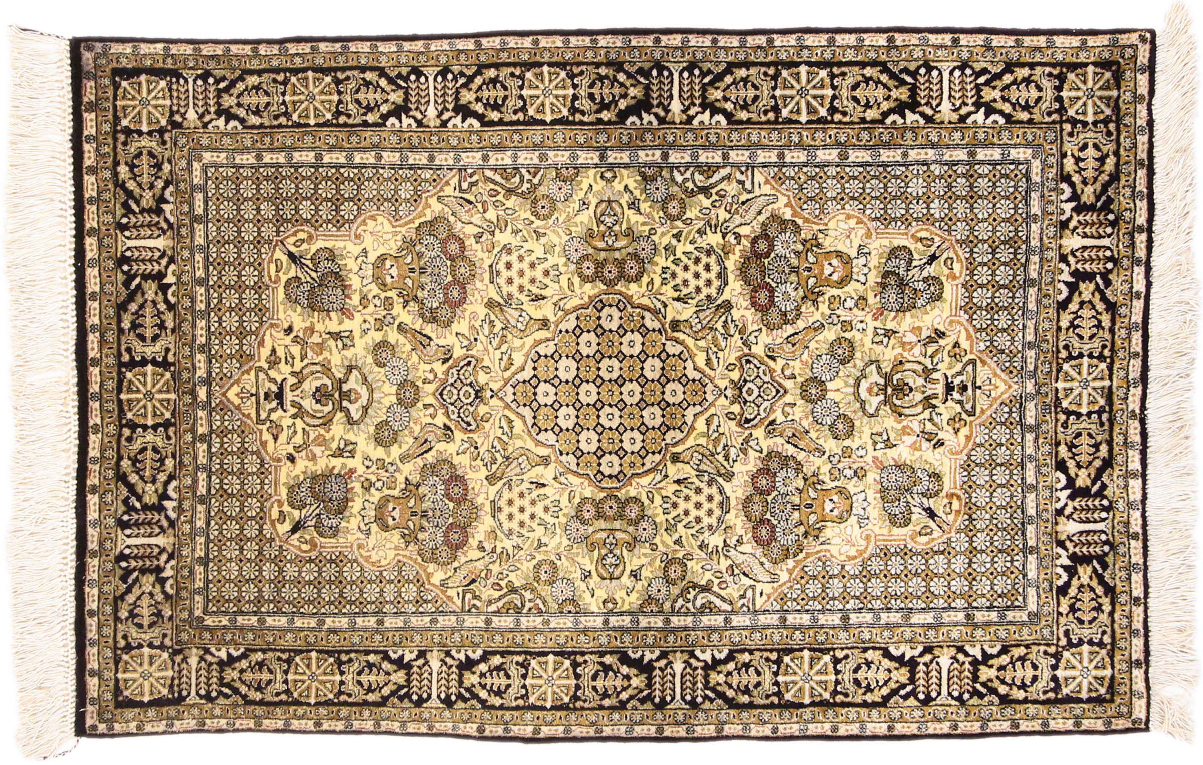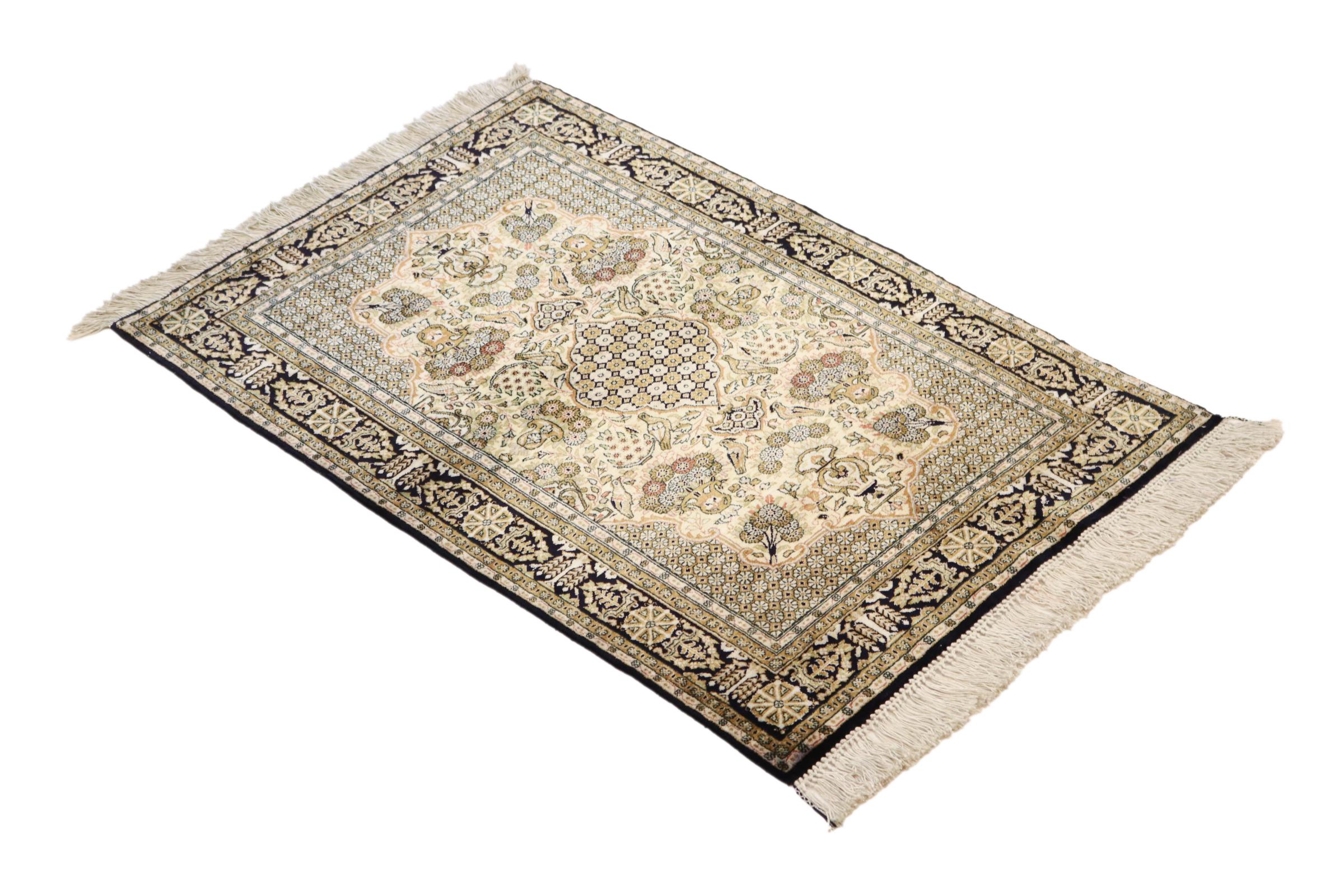 Nº do Tapete: 202239003351844 Tamanho: 126x82 cm Espessura: aproximadamente 3 mm Nós: 1 000 000 / m² Processamento: Atado à mão Veludo: Seda Urdidura: Seda Origem: Pérsia / Iran Idade: Novo Peso: aproximadamente 2 kg Em armazém: Único - Apenas 1 em stock