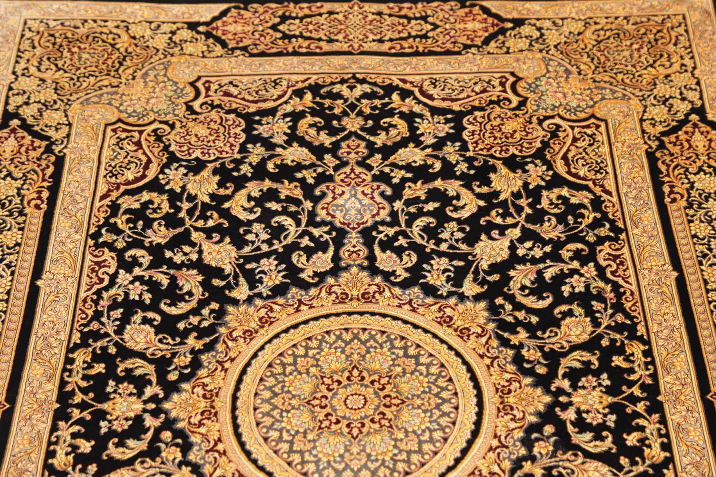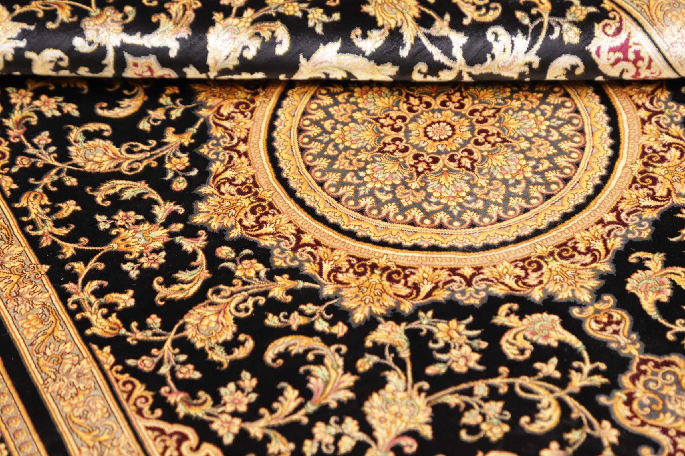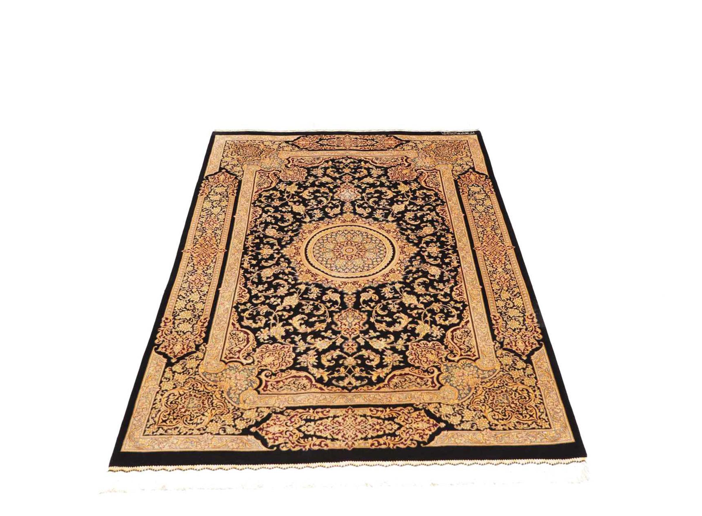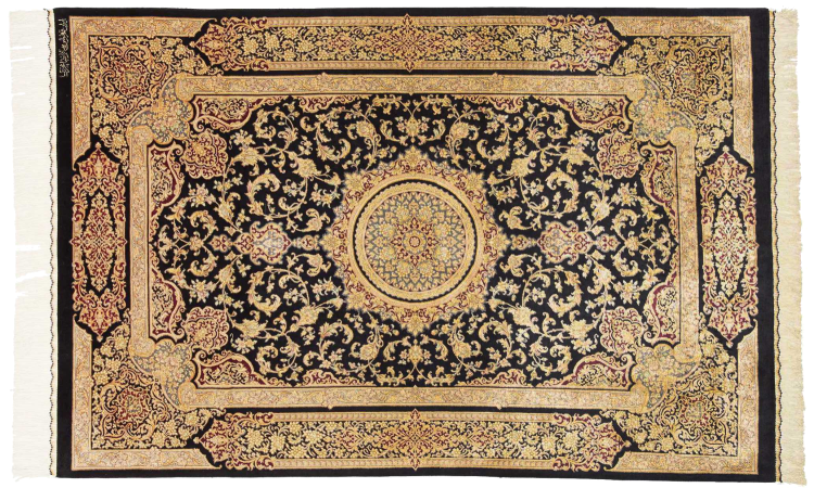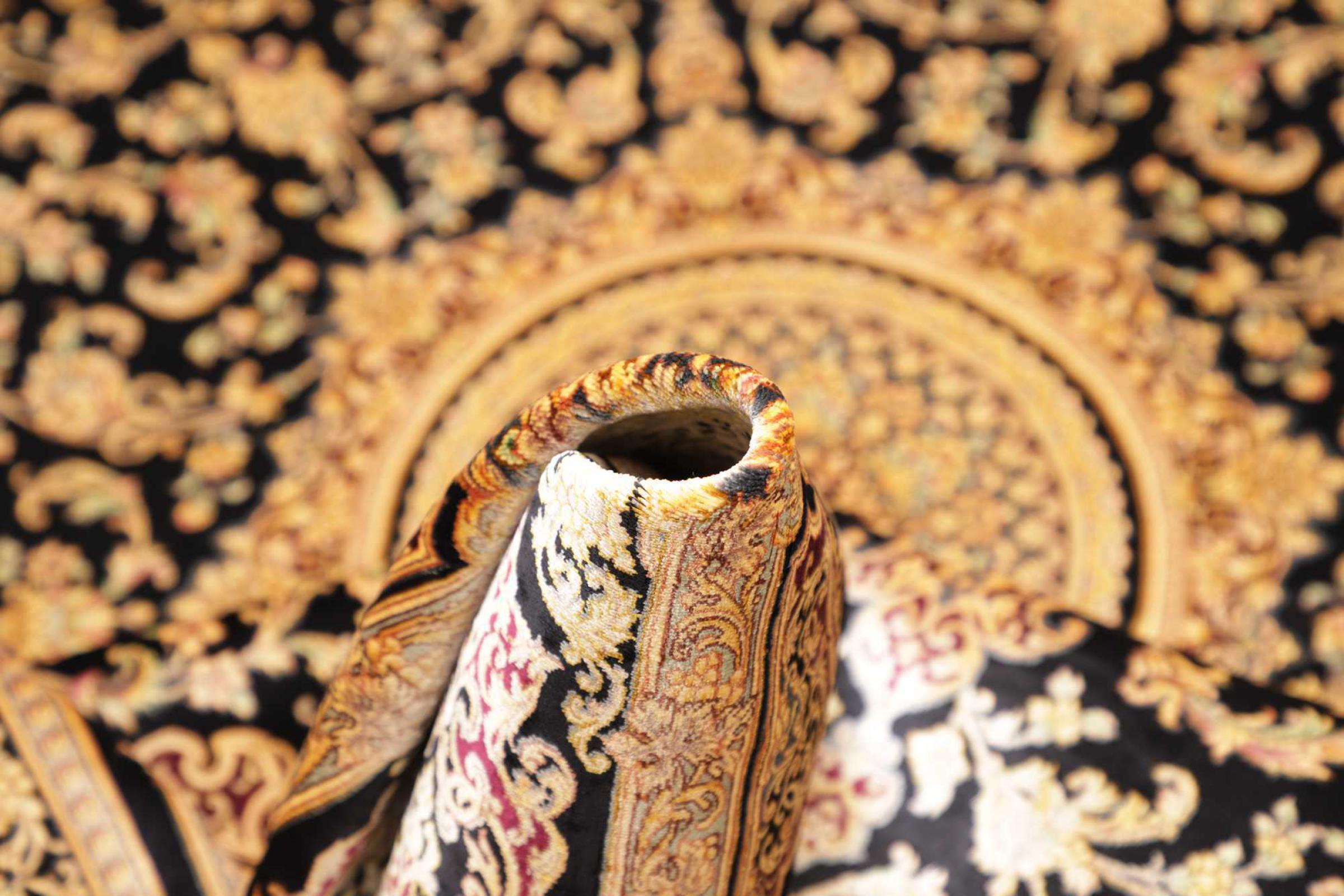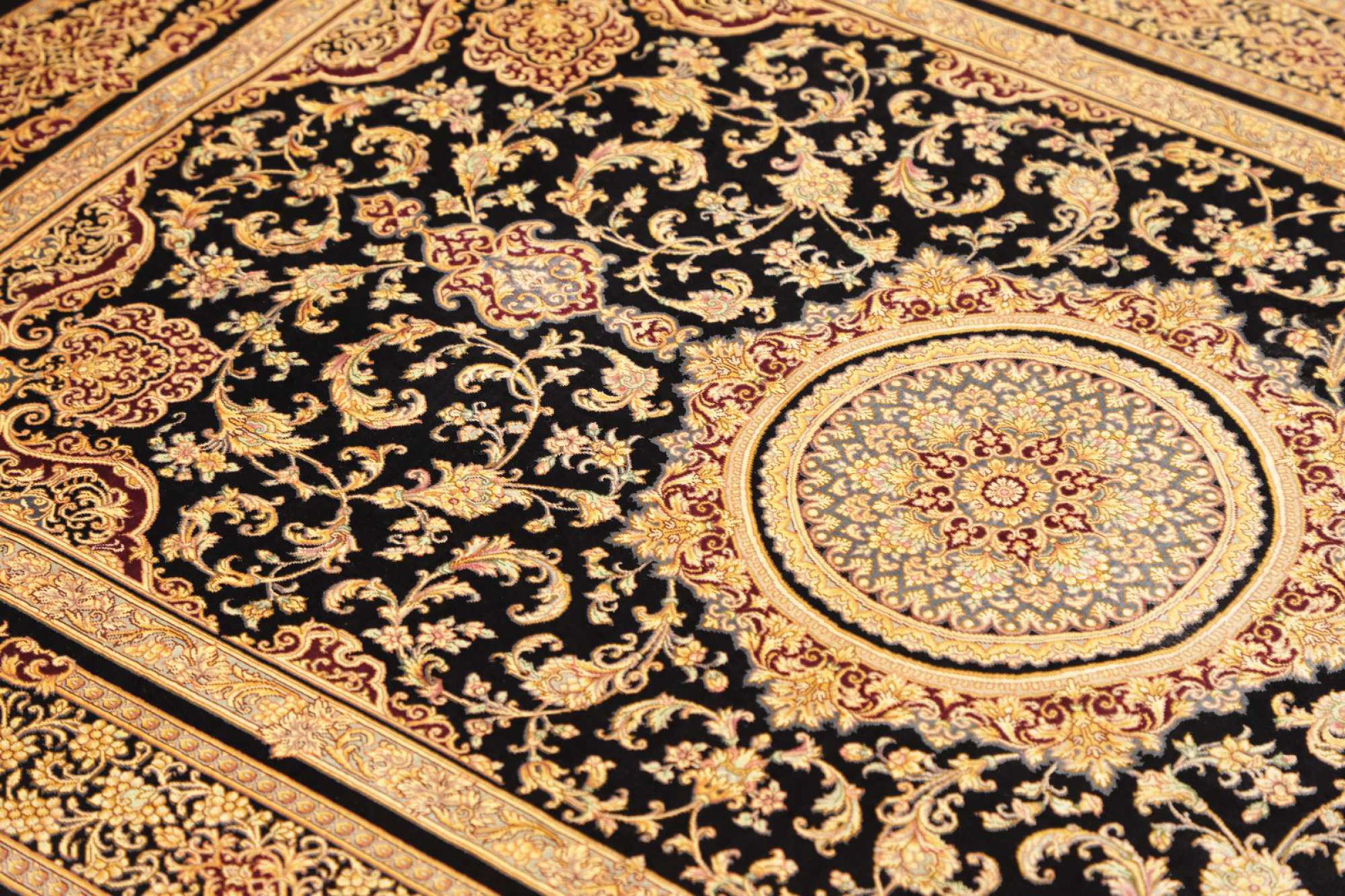 Este tapete de seda Ghom é puro luxo. Os seus ornamentos e a seda natural pura falam por si. Aqui encontrará o Oriente em toda a sua perfeição para a sua casa. Um tapete de seda de Ghom impressiona até os coleccionadores de arte de tapetes persas. Dependendo da incidência da luz, a seda permite que as cores brilhem nas mais diversas facetas. Isso faz deste tapete persa um destaque inesquecível e fará com que seu quarto brilhe num ambiente aconchegante e de altíssima qualidade.