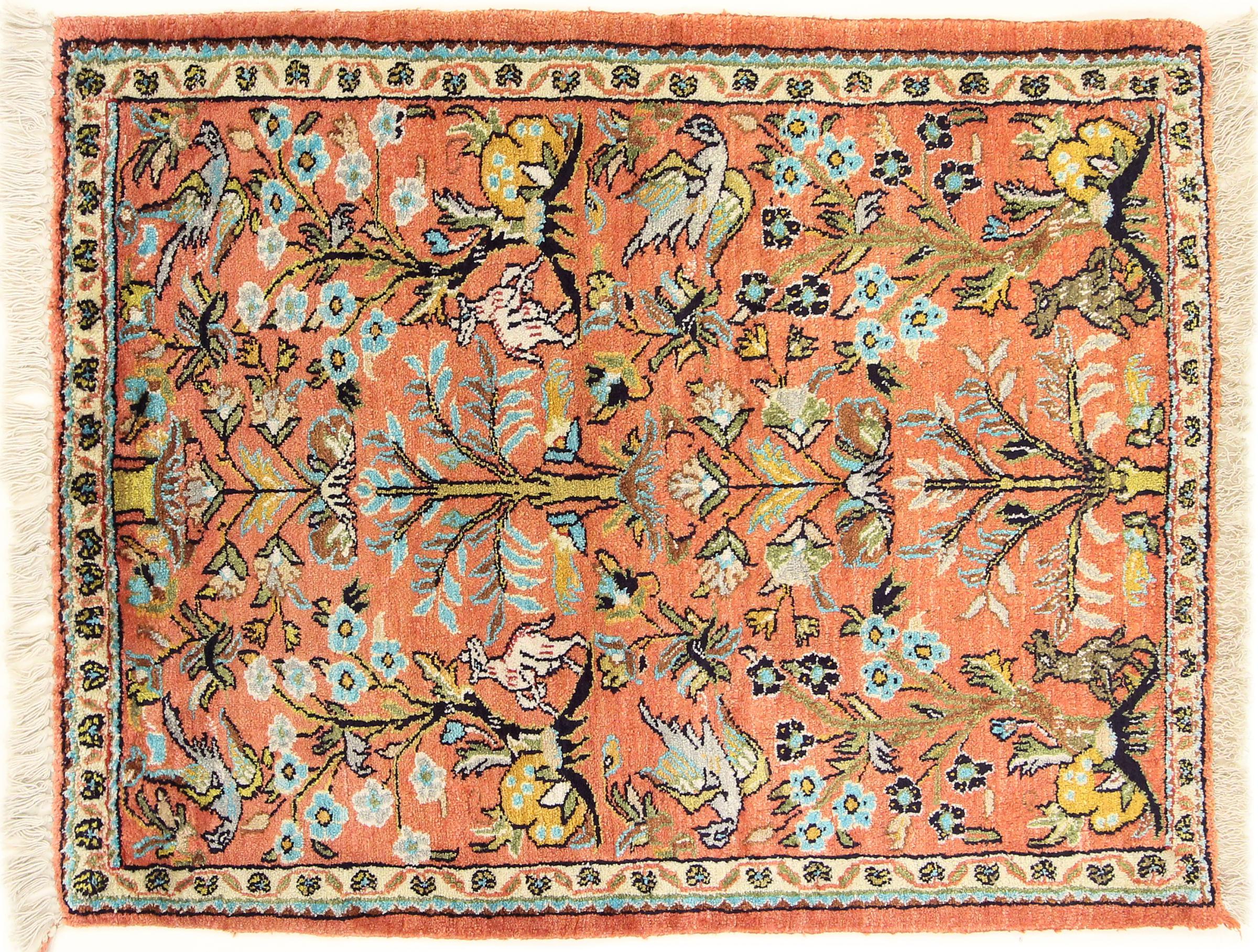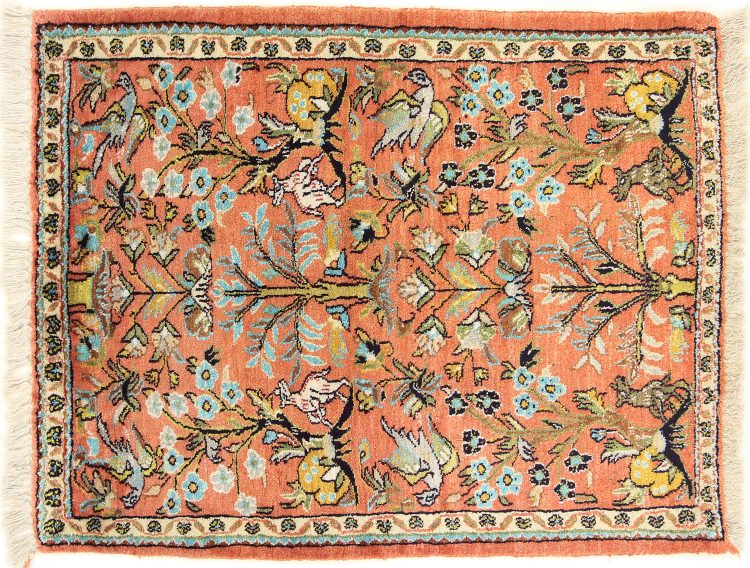 Nº do Tapete: 167991008342722 Tamanho: 77x61 cm Espessura: aproximadamente 3 mm Nós: 900 000 / m² Processamento: Atado à mão Veludo: Seda Urdidura: Seda Origem: Pérsia / Iran Idade: Novo Peso: aproximadamente 1 kg Em armazém: Único - Apenas 1 em stock