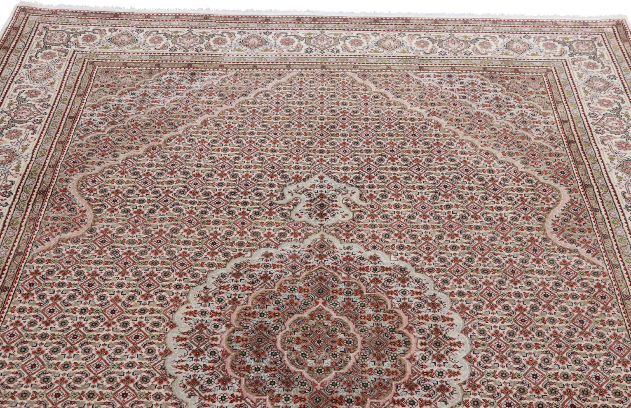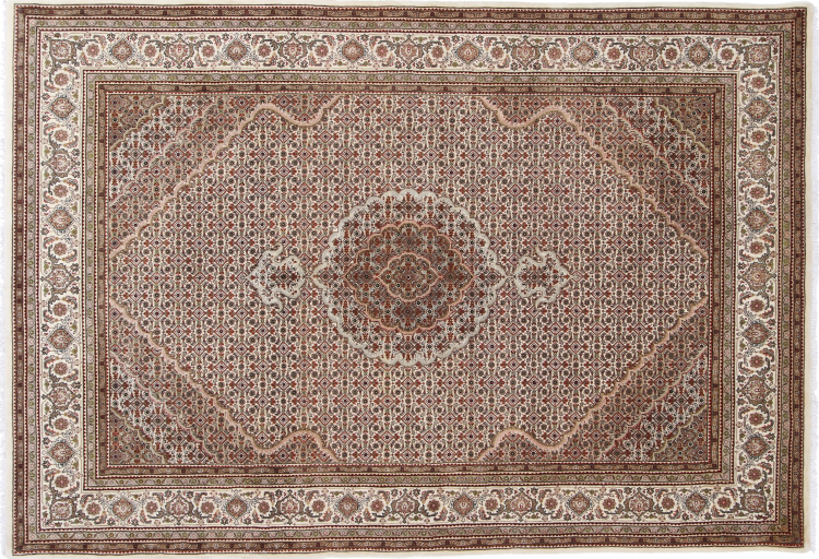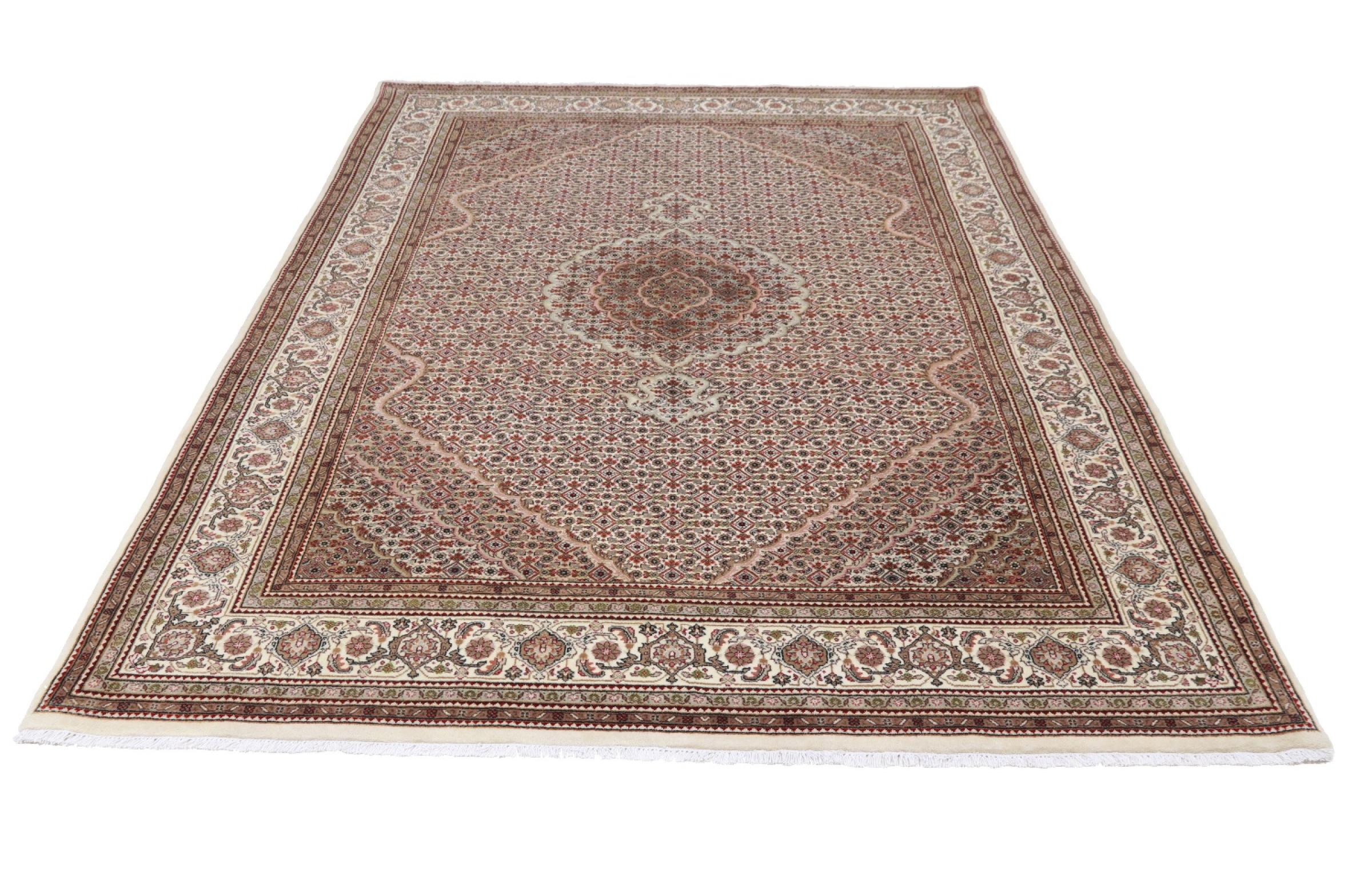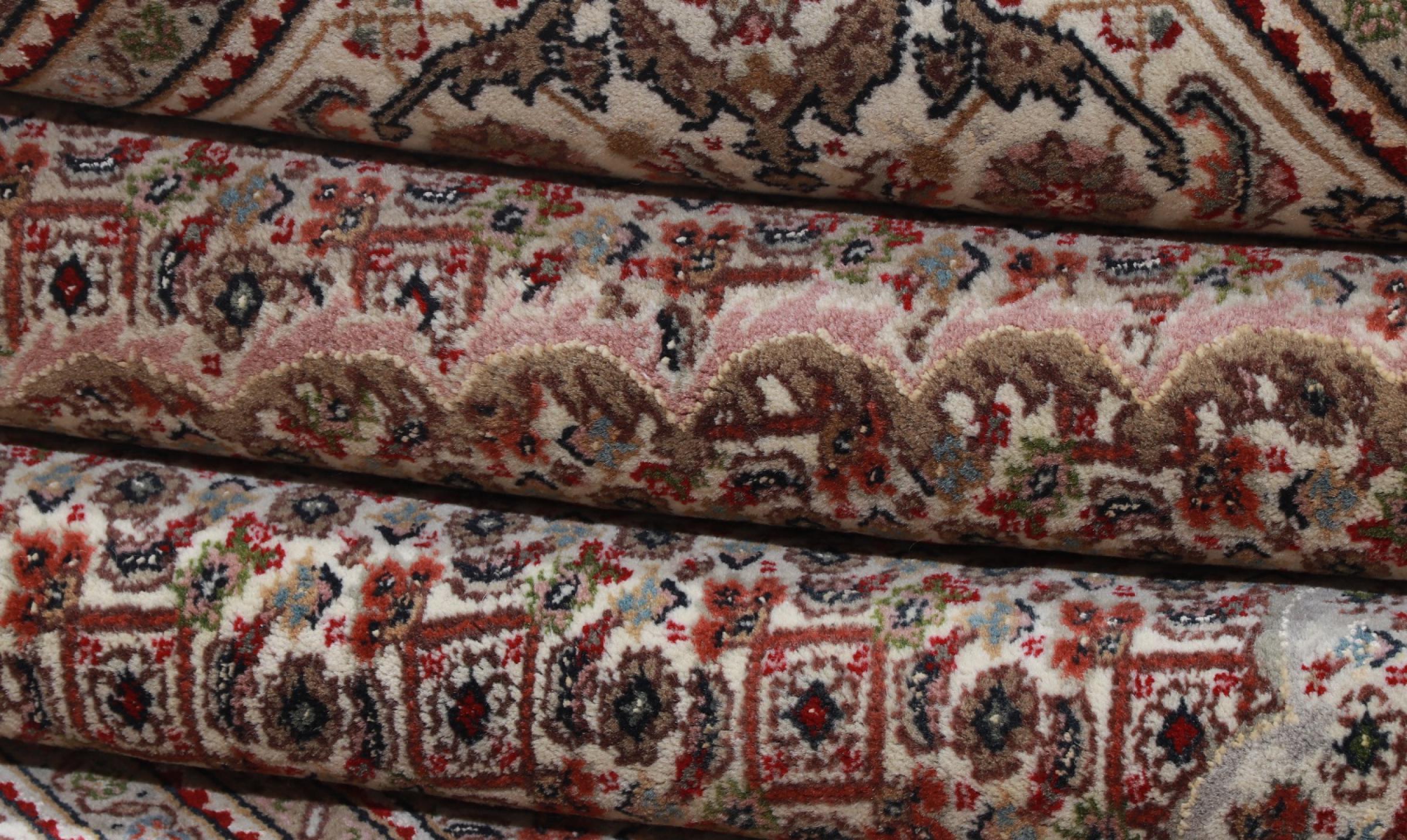 Belas flores formam o desenho deste tapete Golestan. De cor reduzida, o esplendor floral joga todos os seus trunfos. As flores têm um efeito tridimensional graças a um método especial de produção alto/baixo e à seda de bambu luminosa. Graças à tecelagem manual, este tapete chega até si com a melhor qualidade. Foi inspirado no famoso design Tabriz Farahan.
