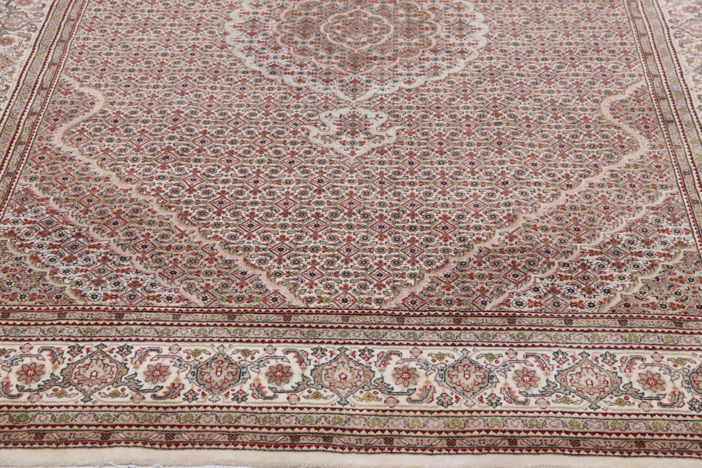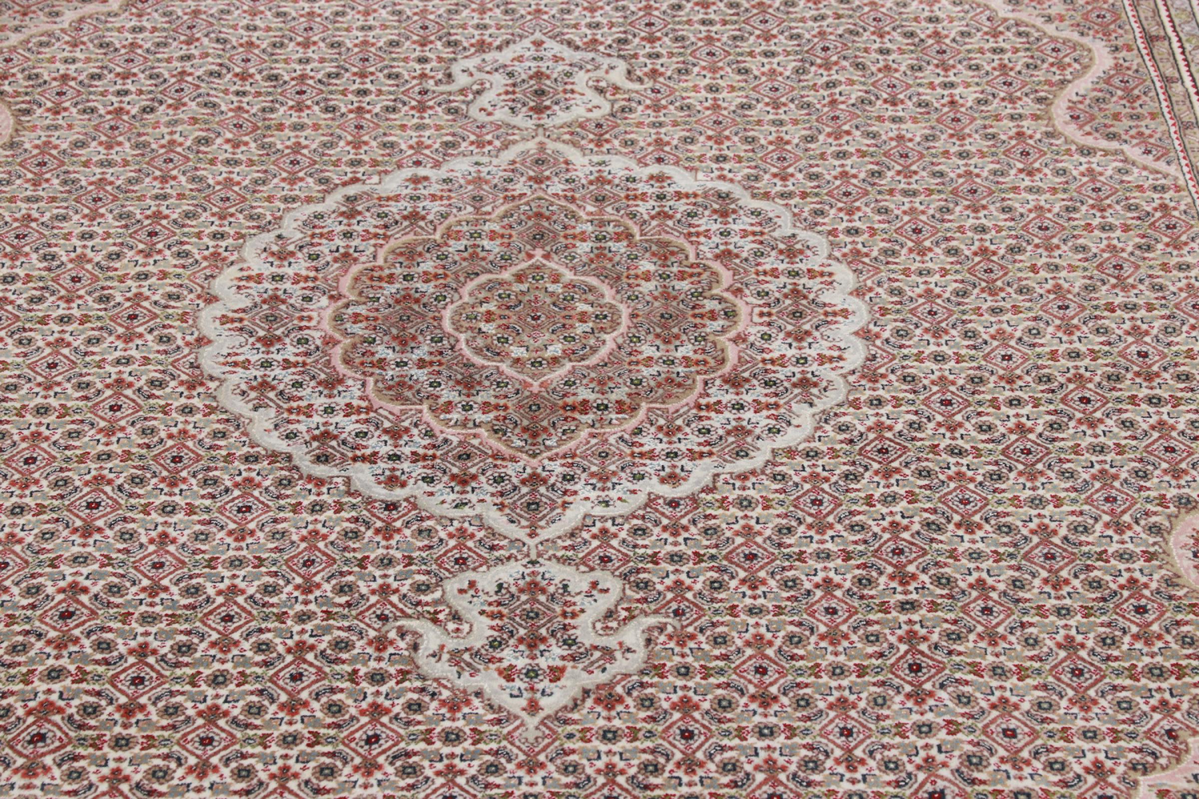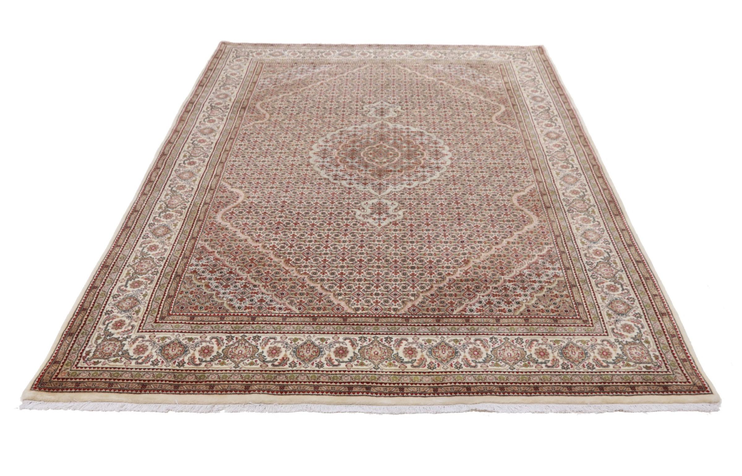Belas flores formam o desenho deste tapete Golestan. De cor reduzida, o esplendor floral joga todos os seus trunfos. As flores têm um efeito tridimensional graças a um método especial de produção alto/baixo e à seda de bambu luminosa. Graças à tecelagem manual, este tapete chega até si com a melhor qualidade. Foi inspirado no famoso design Tabriz Farahan.
