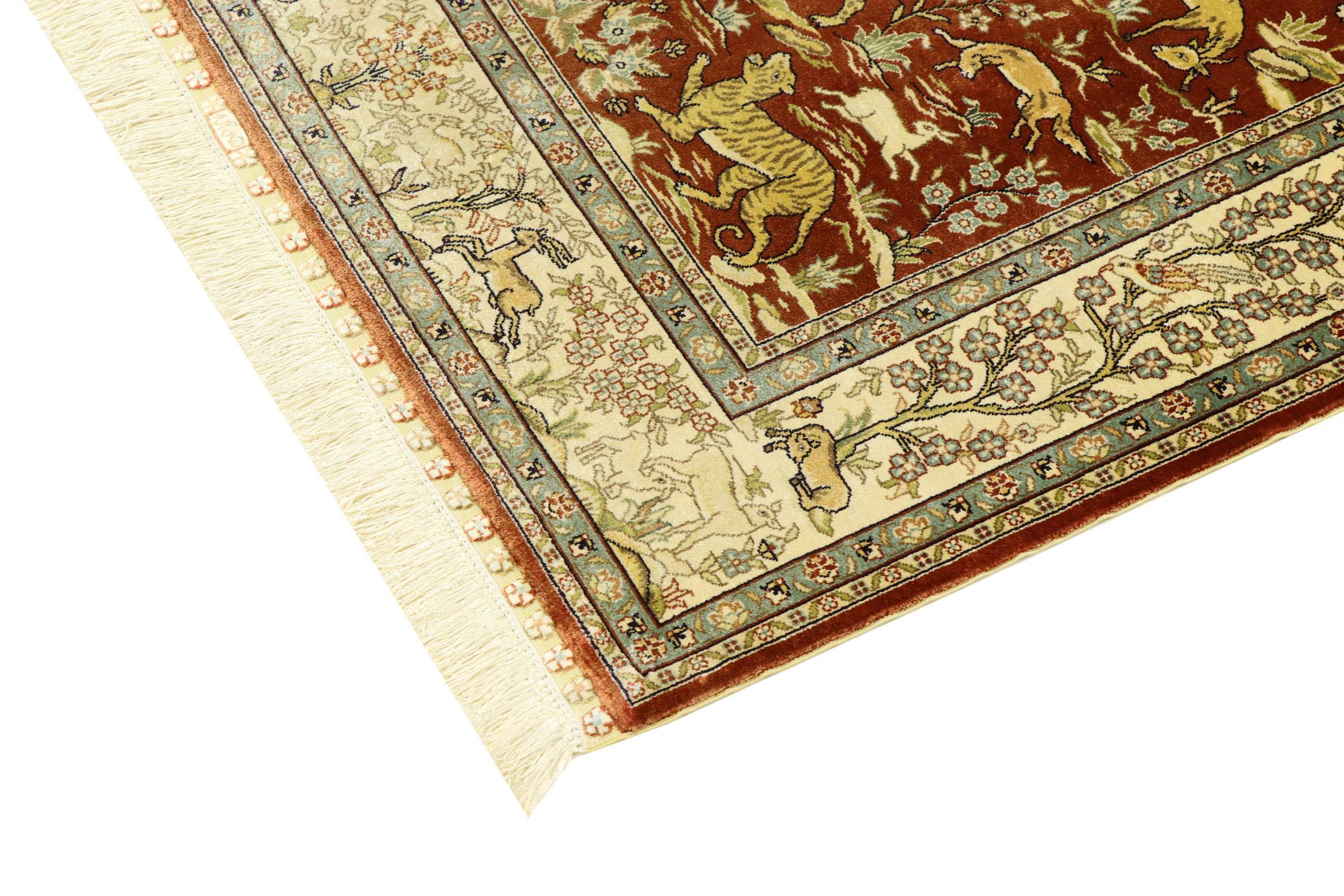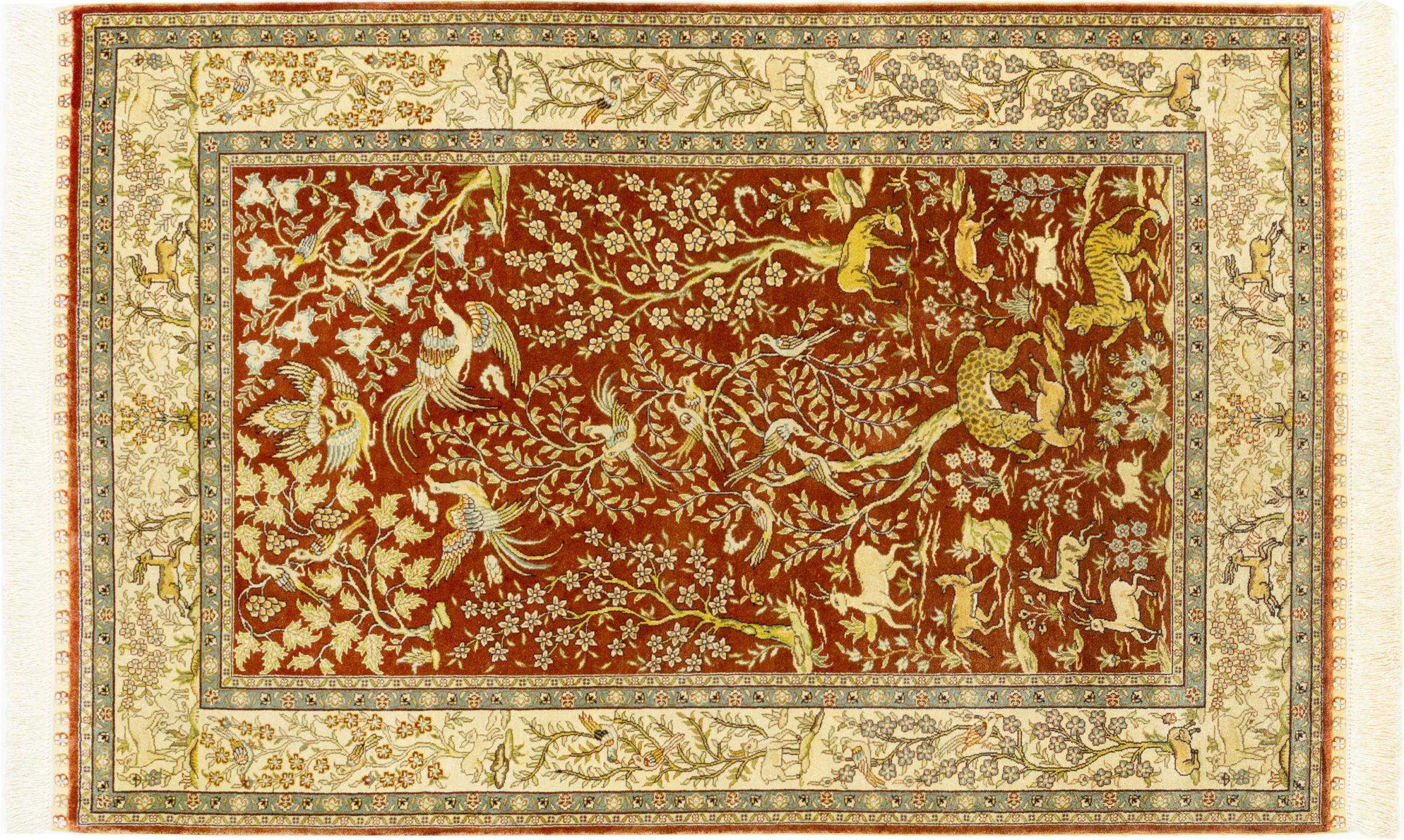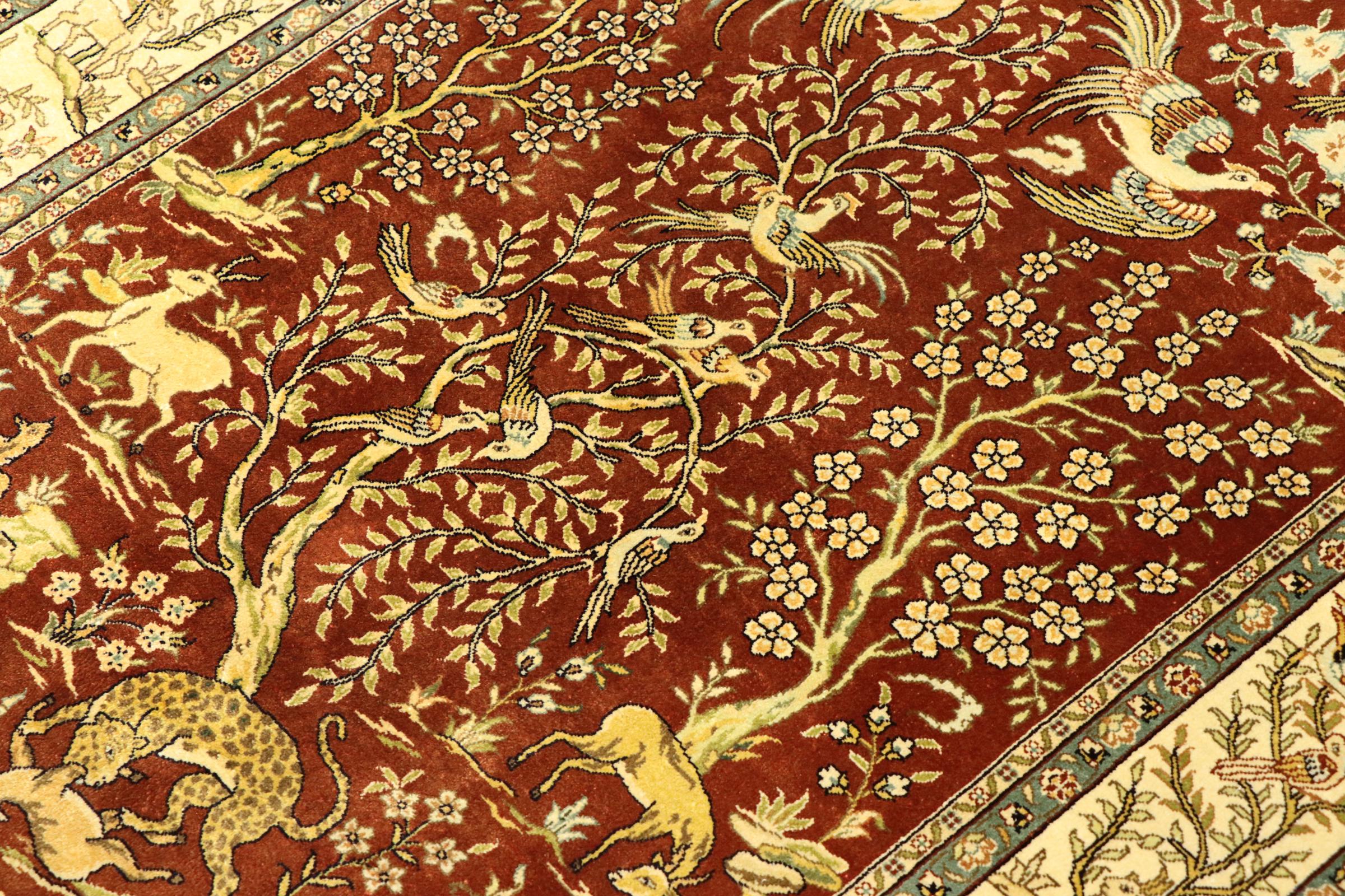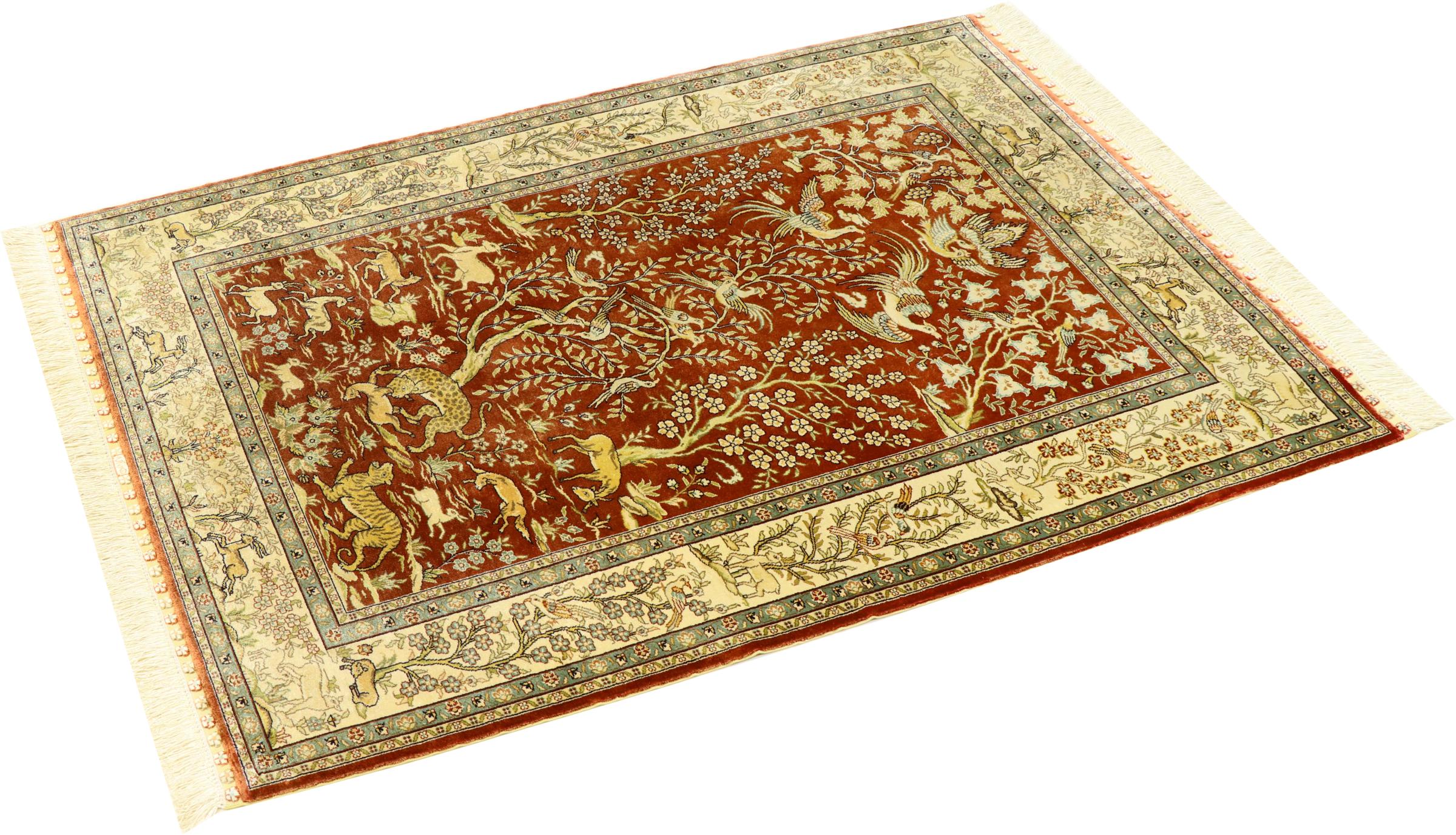 Este tapete Hereke feito à mão é uma magnífica adição ao seu espaço de vida. Outrora destinado a palácios imperiais, esta obra de arte detalhada adorna agora a sua casa. Apenas materiais naturais são utilizados para criar esta peça única, que é tecida por mãos talentosas de mestres num design tradicional com um brilho fino.