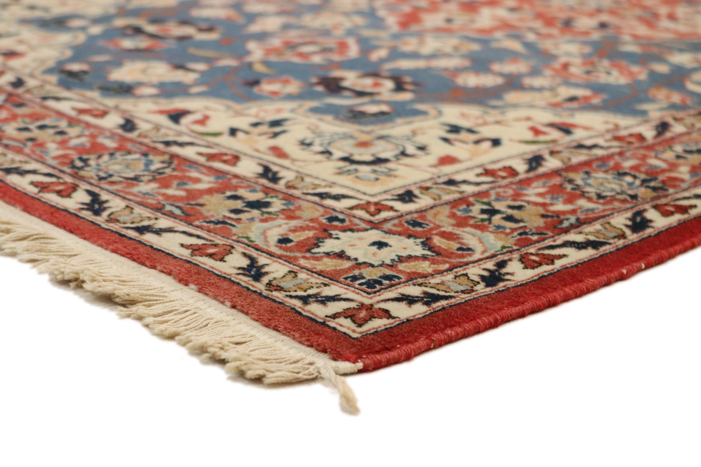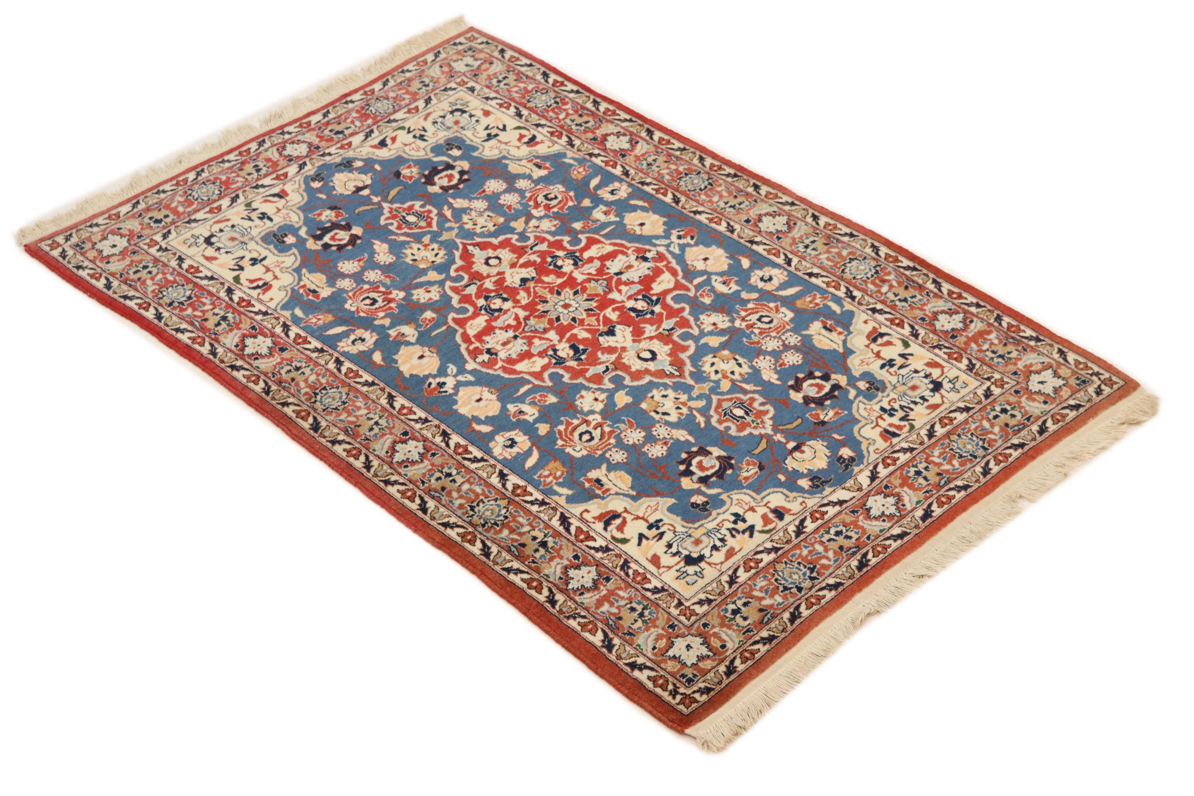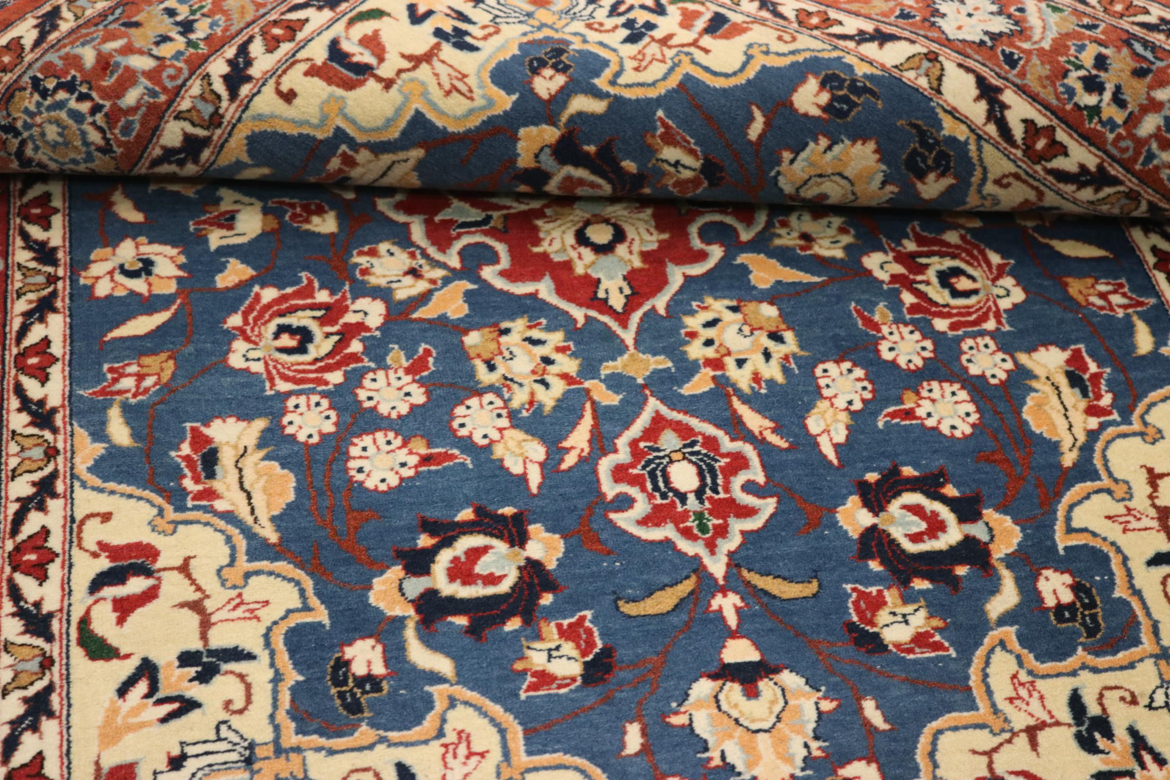 Este tapete de Isfahan é feito a partir da arte tradicional e mais elevada de atar. Foi magistralmente trabalhado e decorado com ornamentos fascinantes. O tapete persa foi feito à mão em Isfahan, provavelmente a mais bela cidade do Irão, com os melhores fios. Os tapetes de Isfahan estão entre os persas mais valiosos e podem ser um verdadeiro investimento.