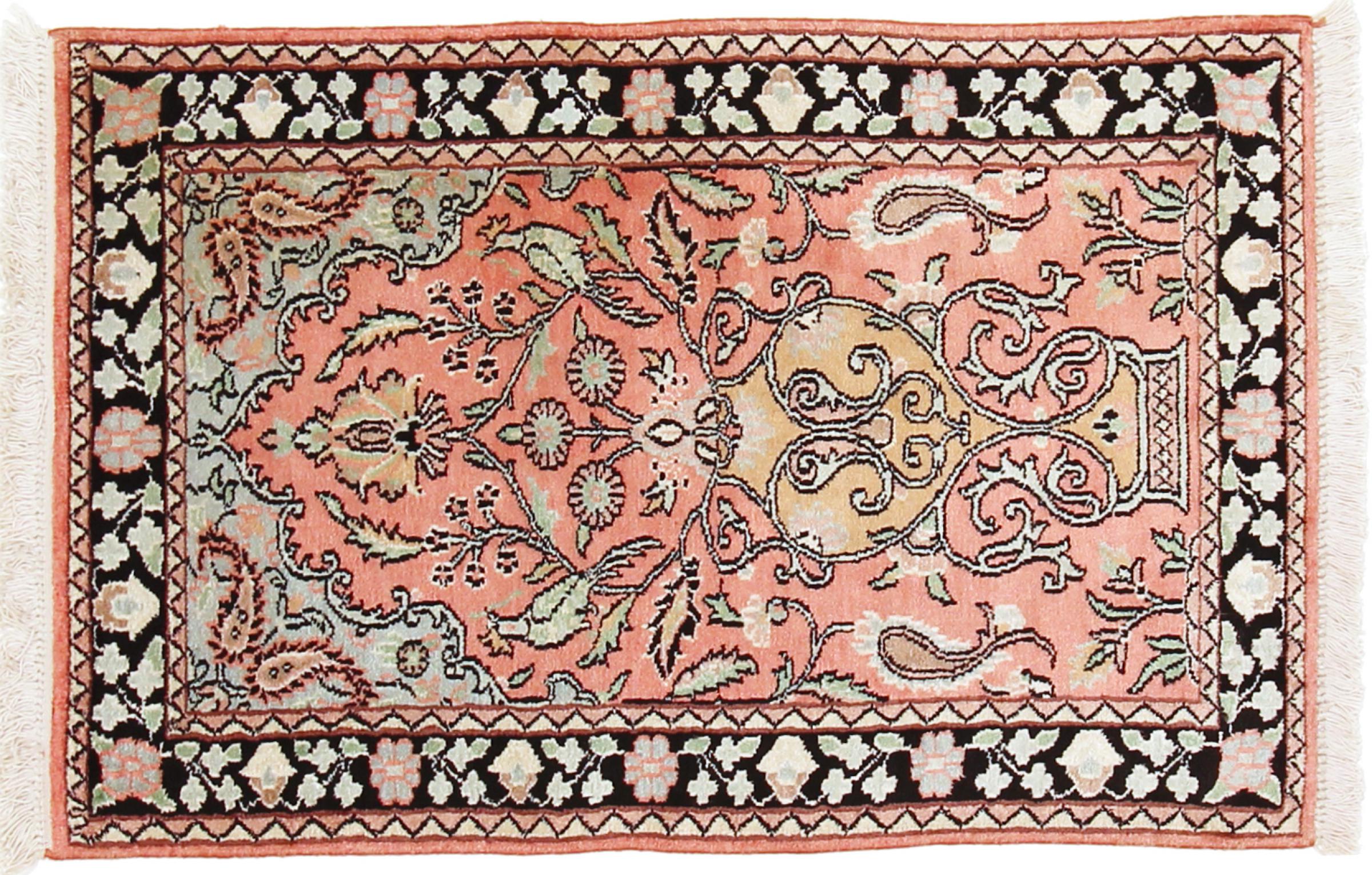 Este tapete de seda de Caxemira, feito à mão, reflecte a habilidade dos tecelões de tapetes indianos. Não só é feito de seda pura, como a densidade dos nós é tão fina que só tecelões muito experientes conseguem criar uma obra deste género. A seda natural fina é um destaque fascinante. Não só é particularmente suave, como também permite que as suas cores brilhem nas mais diversas facetas. Dependendo da incidência da luz, surgem pormenores e cores completamente novos que continuarão a impressionar durante anos. É possível olhar para um tapete como este durante horas e esquecer o tempo - uma experiência que não pode ser captada numa fotografia.