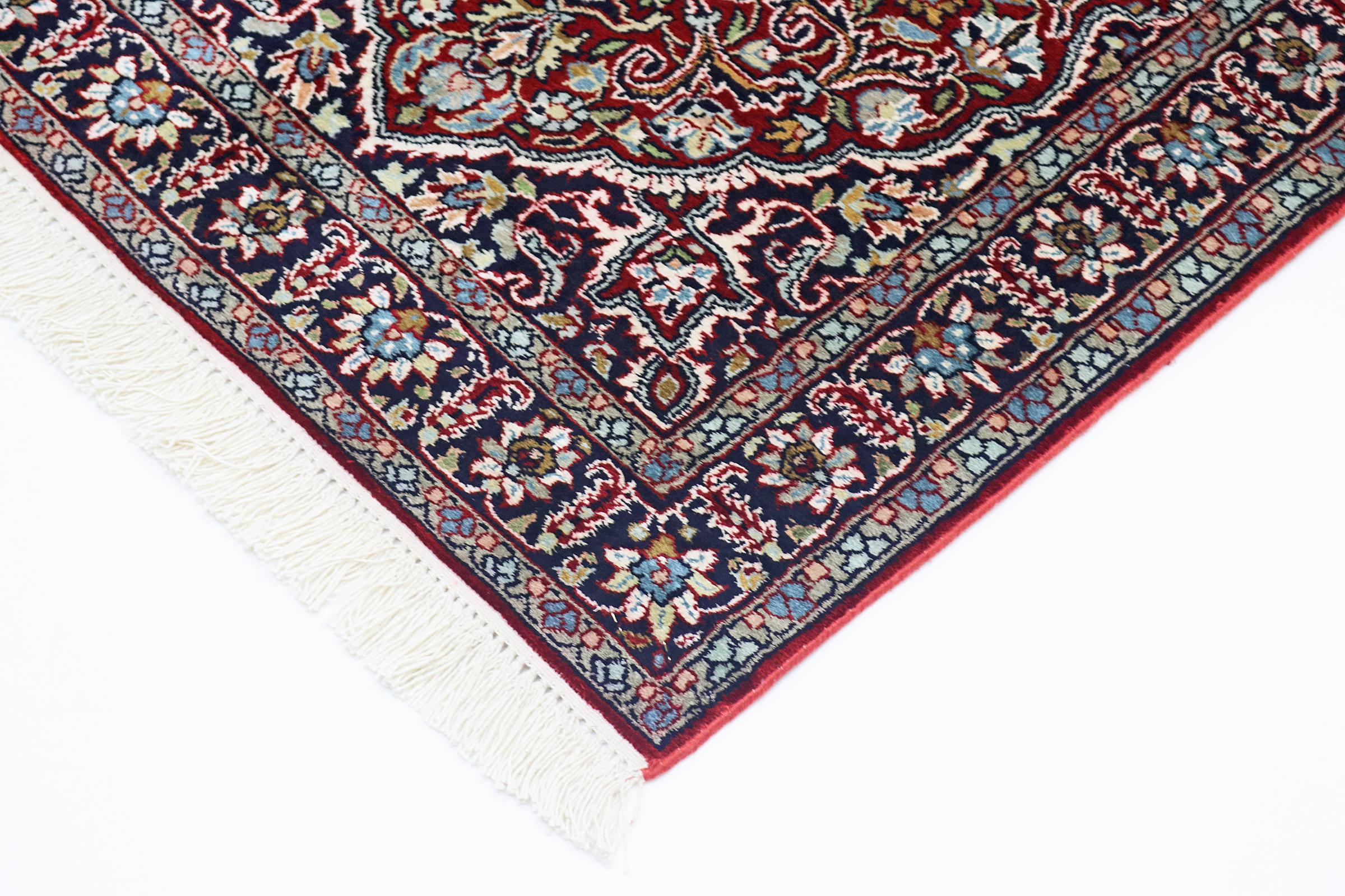 Este tapete de seda de Caxemira, feito à mão, reflecte a habilidade dos tecelões de tapetes indianos. Não só é feito de seda pura, como a densidade dos nós é tão fina que só tecelões muito experientes conseguem criar uma obra deste género. A seda natural fina é um destaque fascinante. Não só é particularmente suave, como também permite que as suas cores brilhem nas mais diversas facetas. Dependendo da incidência da luz, surgem pormenores e cores completamente novos que continuarão a impressionar durante anos. É possível olhar para um tapete como este durante horas e esquecer o tempo - uma experiência que não pode ser captada numa fotografia.