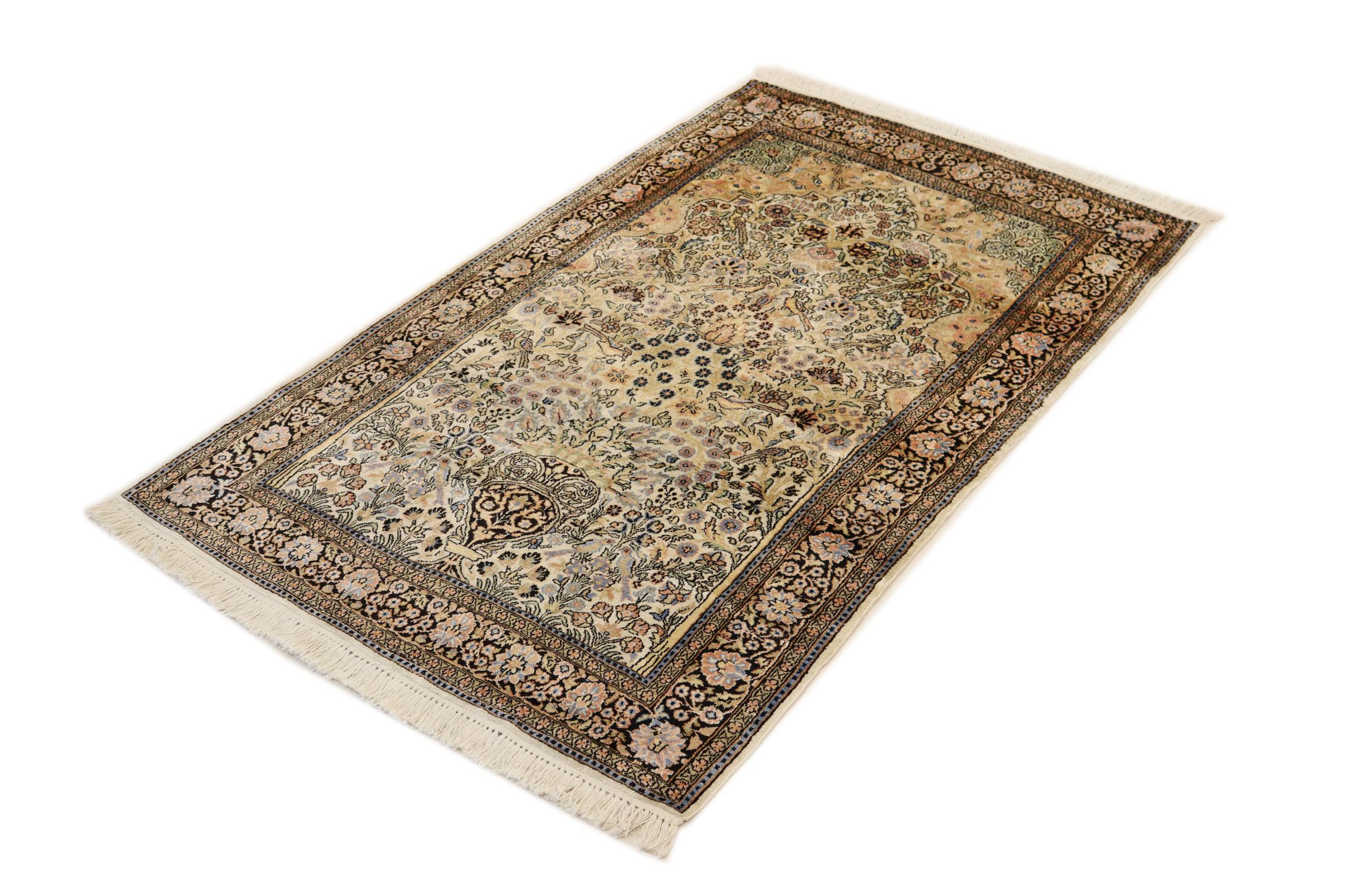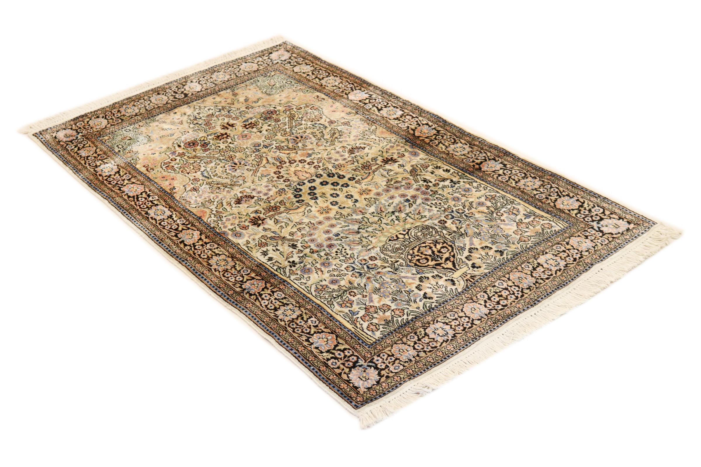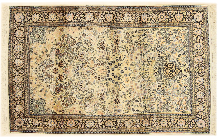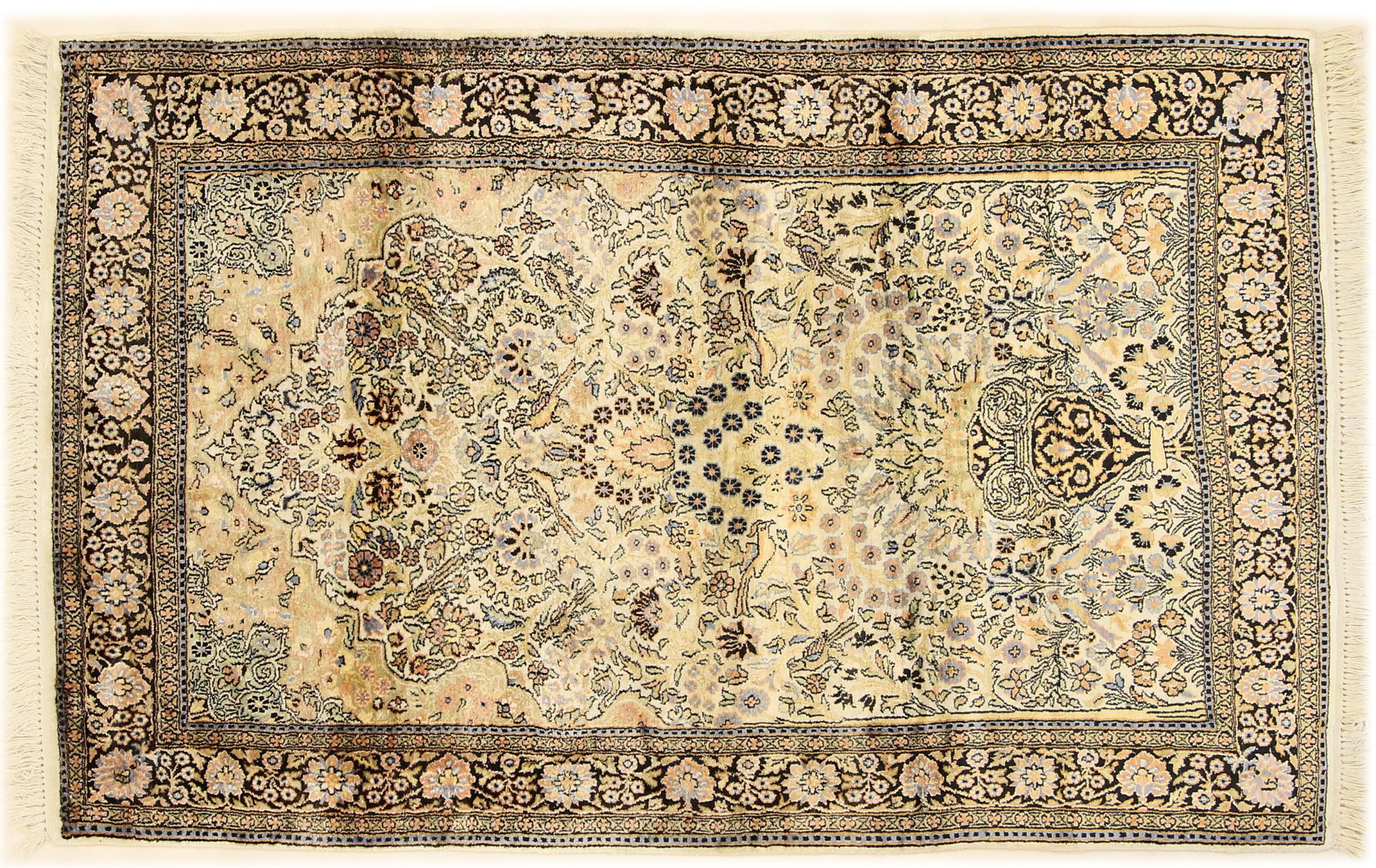 Nº do Tapete: 167915005488277 Tamanho: 181x119 cm Espessura: aproximadamente 4 mm Nós: 450 000 - 500 000 / m² Processamento: Atado à mão Veludo: Seda Urdidura: Algodão Origem: Índia Idade: Novo Peso: aproximadamente 4 kg Em armazém: Único - Apenas 1 em stock