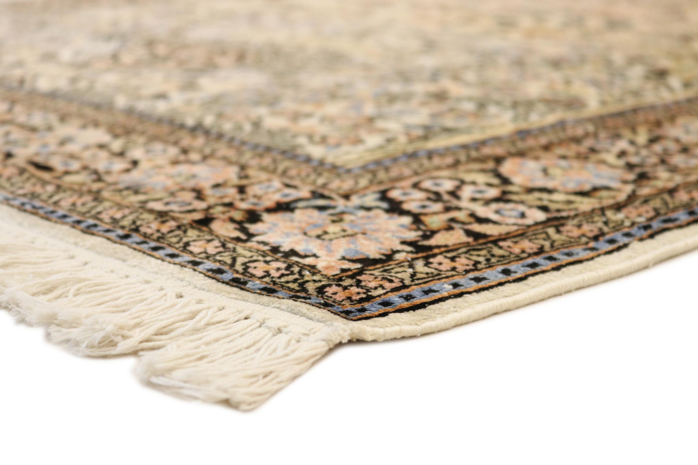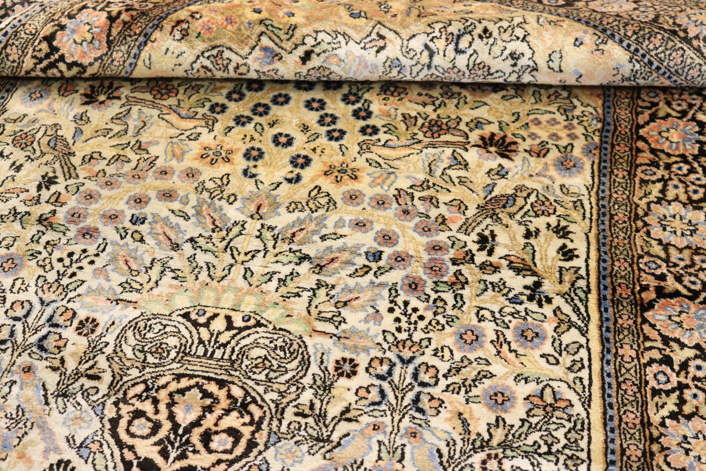 Este tapete de seda de Caxemira, feito à mão, reflecte a habilidade dos tecelões de tapetes indianos. Não só é feito de seda pura, como a densidade dos nós é tão fina que só tecelões muito experientes conseguem criar uma obra deste género. A seda natural fina é um destaque fascinante. Não só é particularmente suave, como também permite que as suas cores brilhem nas mais diversas facetas. Dependendo da incidência da luz, surgem pormenores e cores completamente novos que continuarão a impressionar durante anos. É possível olhar para um tapete como este durante horas e esquecer o tempo - uma experiência que não pode ser captada numa fotografia.