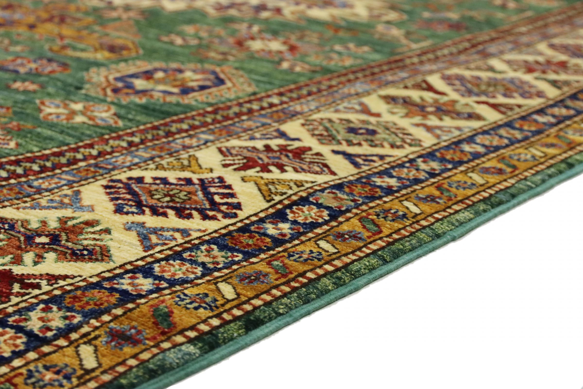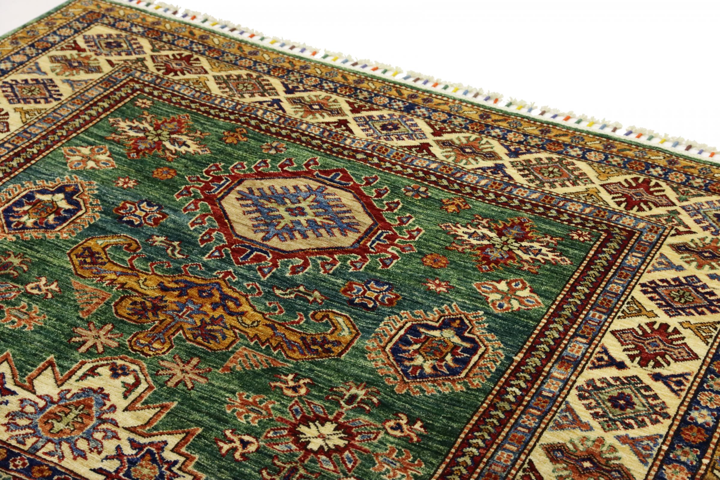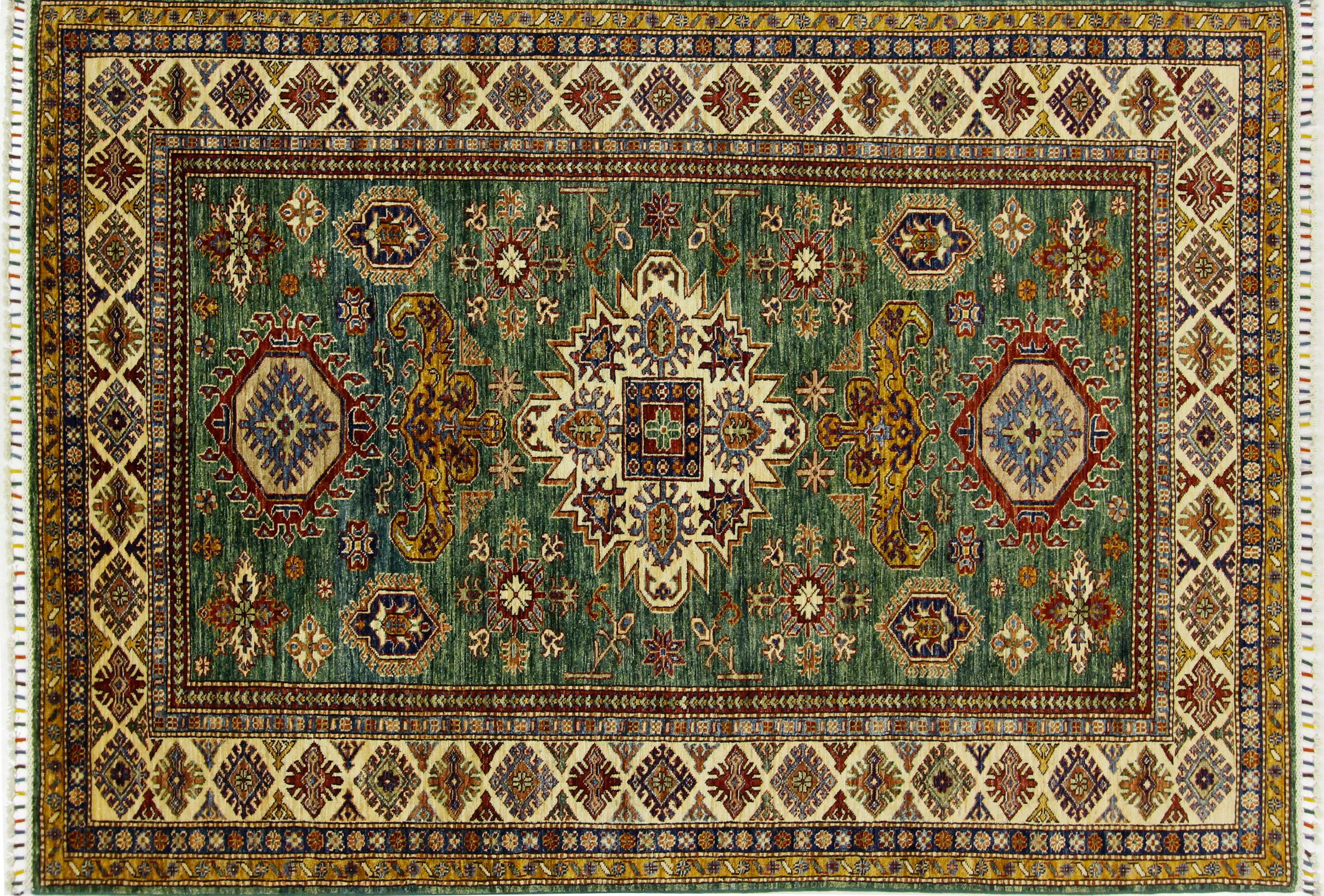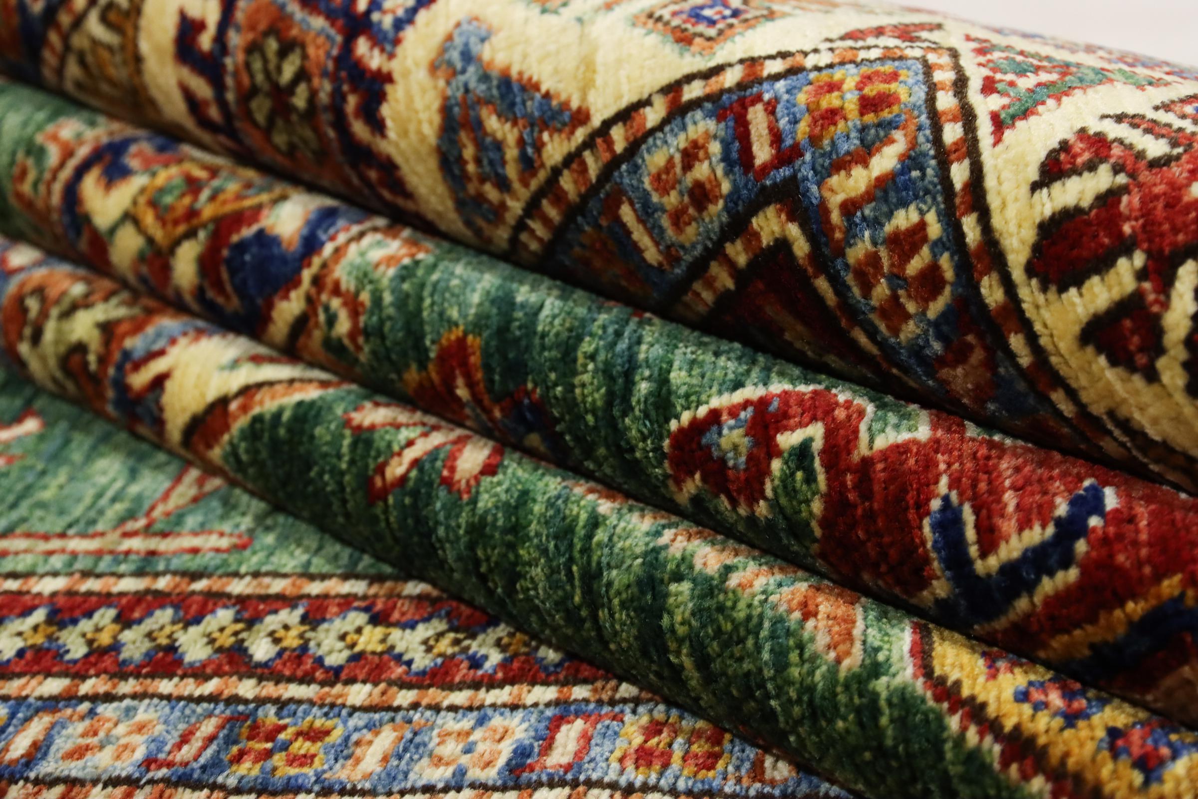 Os tapetes Kazak são originalmente tapetes caucasianos e são considerados os melhores de sua espécie. Eles são feitos à mão com lã de alta qualidade e são caracterizados por seu design com cores naturais quentes e formas geométricas retas.