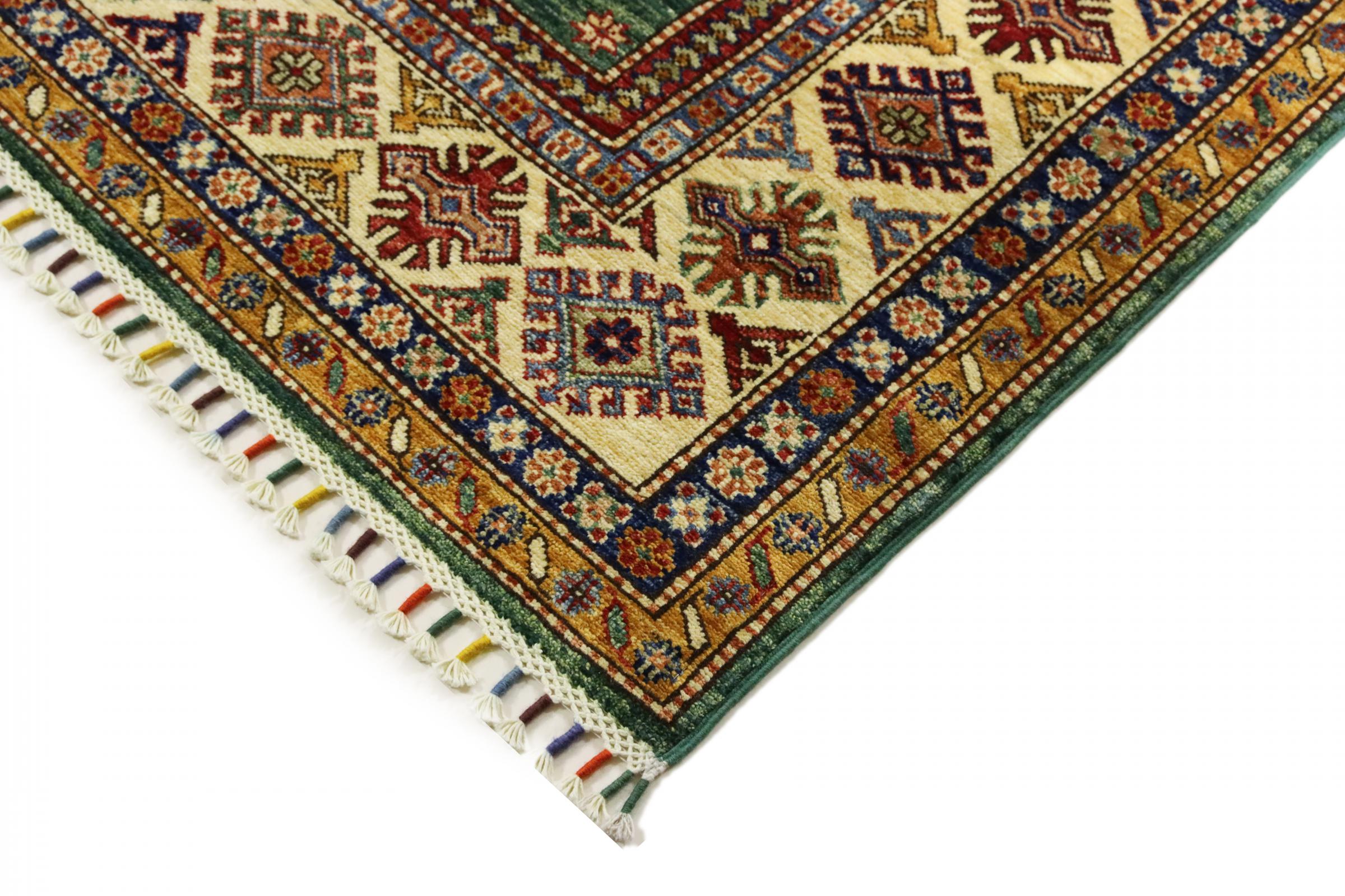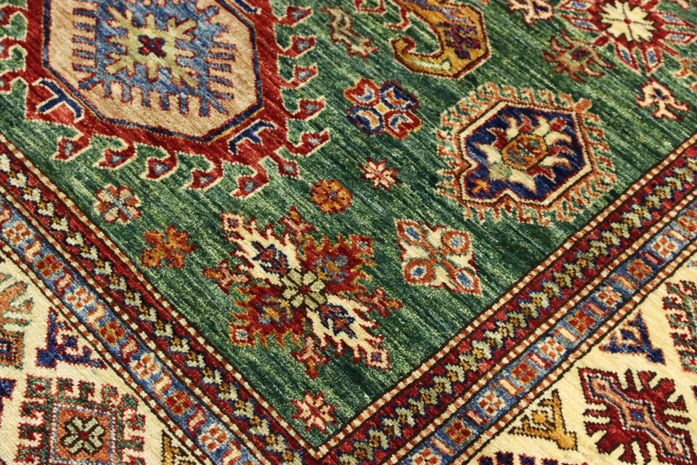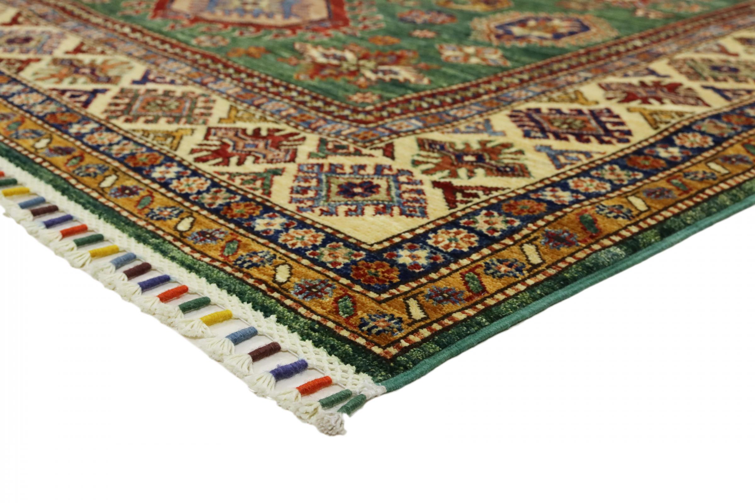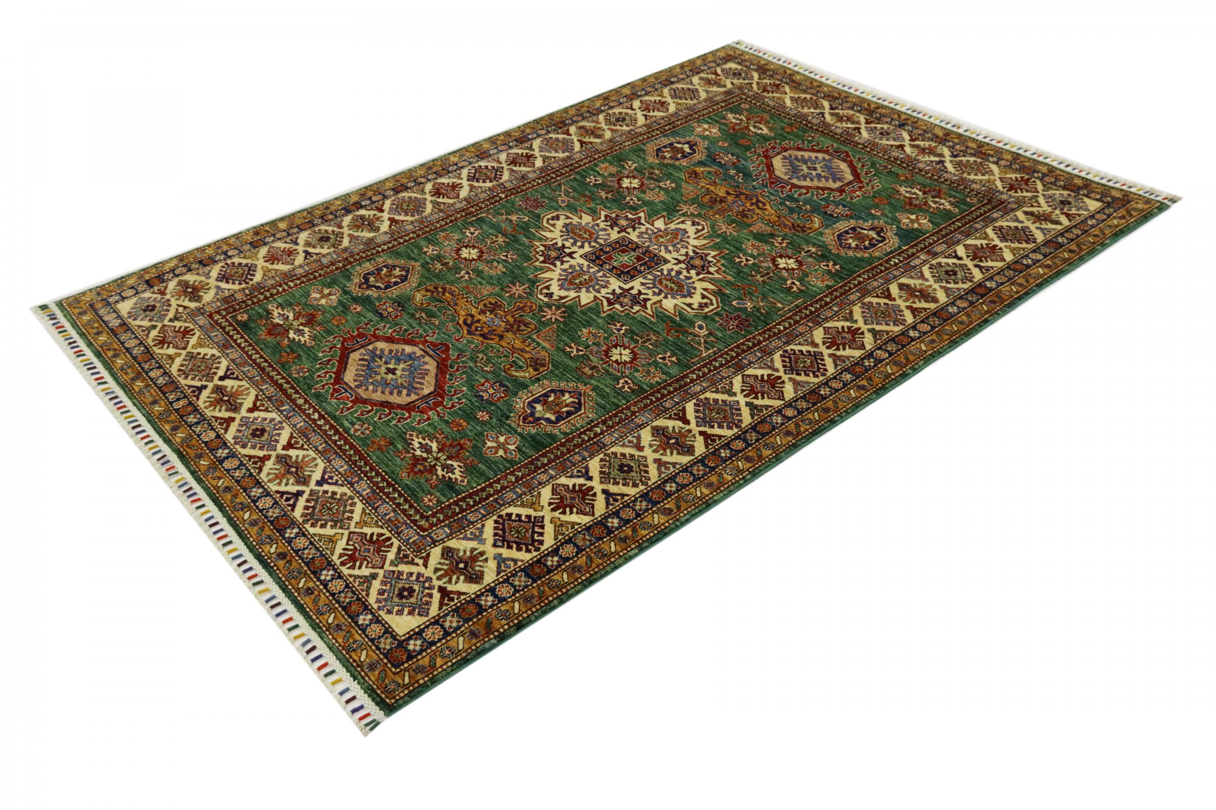Os tapetes Kazak são originalmente tapetes caucasianos e são considerados os melhores de sua espécie. Eles são feitos à mão com lã de alta qualidade e são caracterizados por seu design com cores naturais quentes e formas geométricas retas.