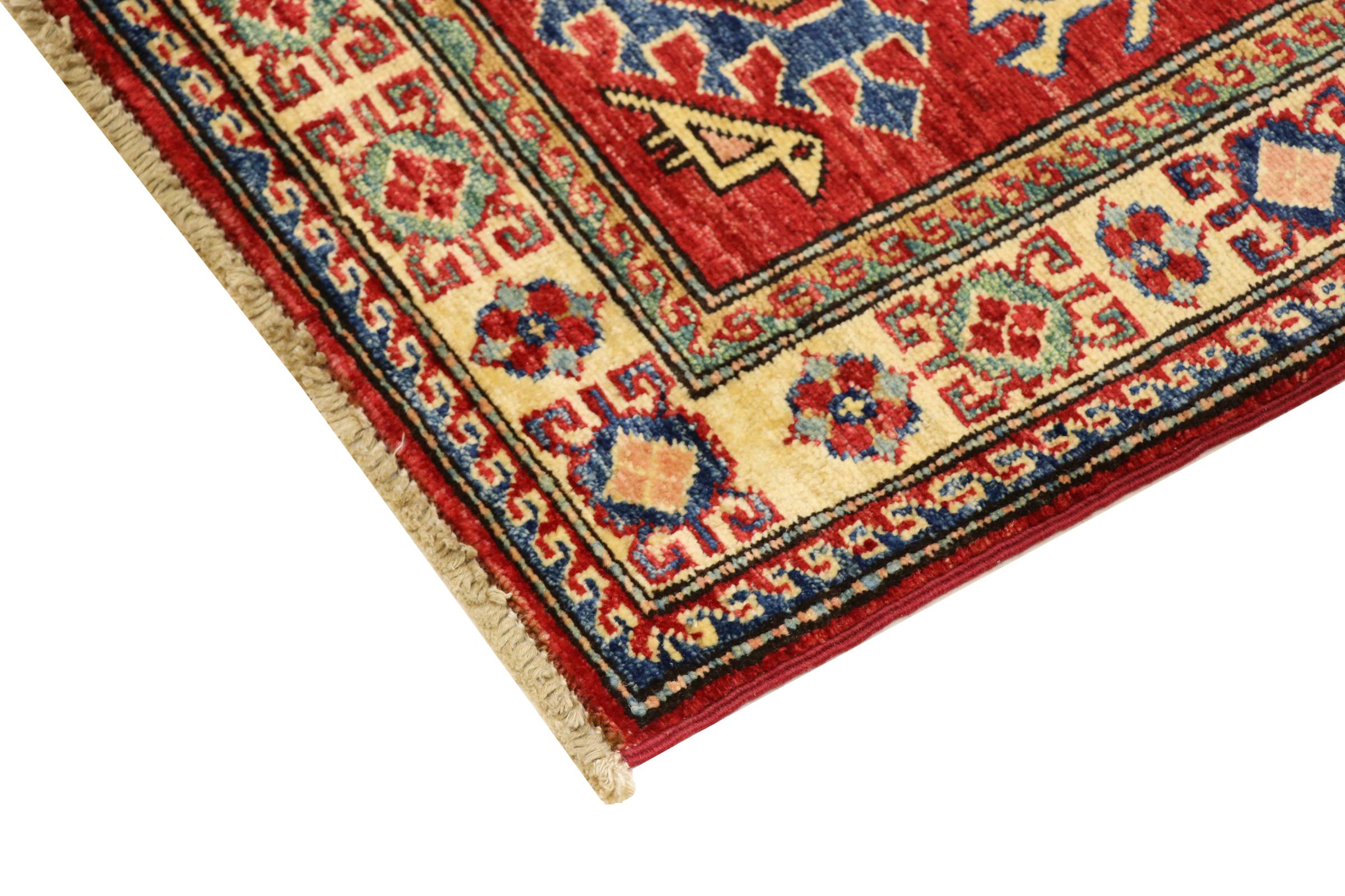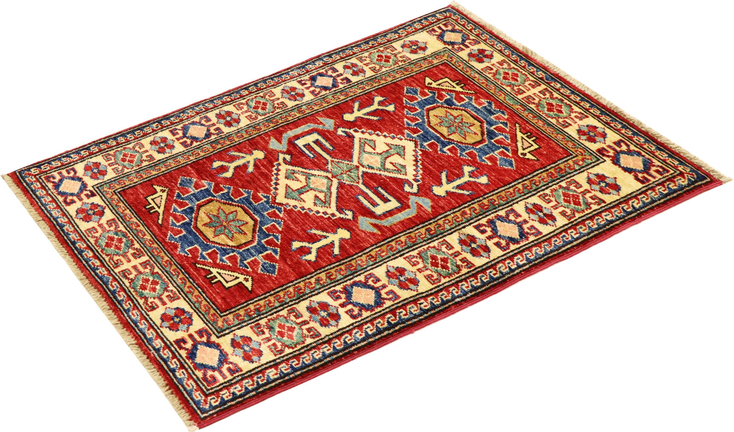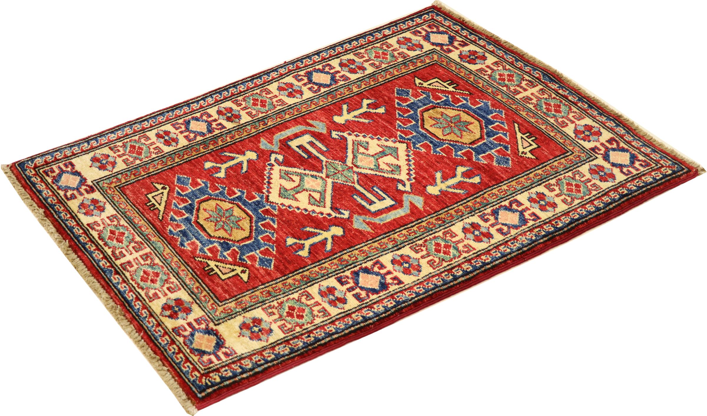 Os tapetes Kazak são originalmente tapetes caucasianos e são considerados os melhores de sua espécie. Eles são feitos à mão com lã de alta qualidade e são caracterizados por seu design com cores naturais quentes e formas geométricas retas.