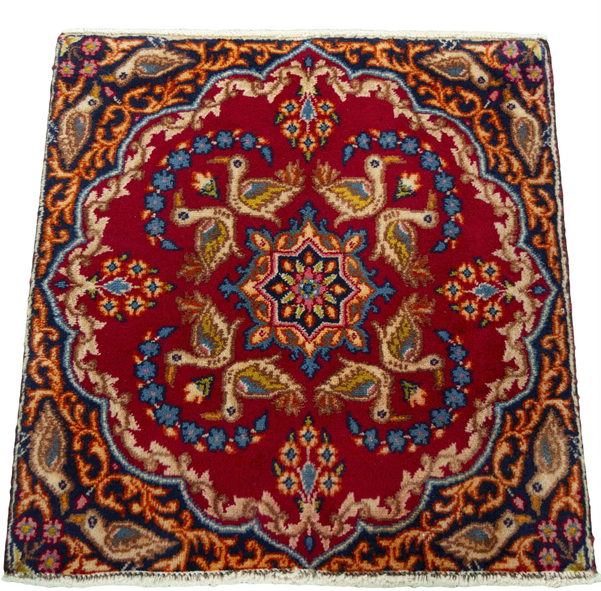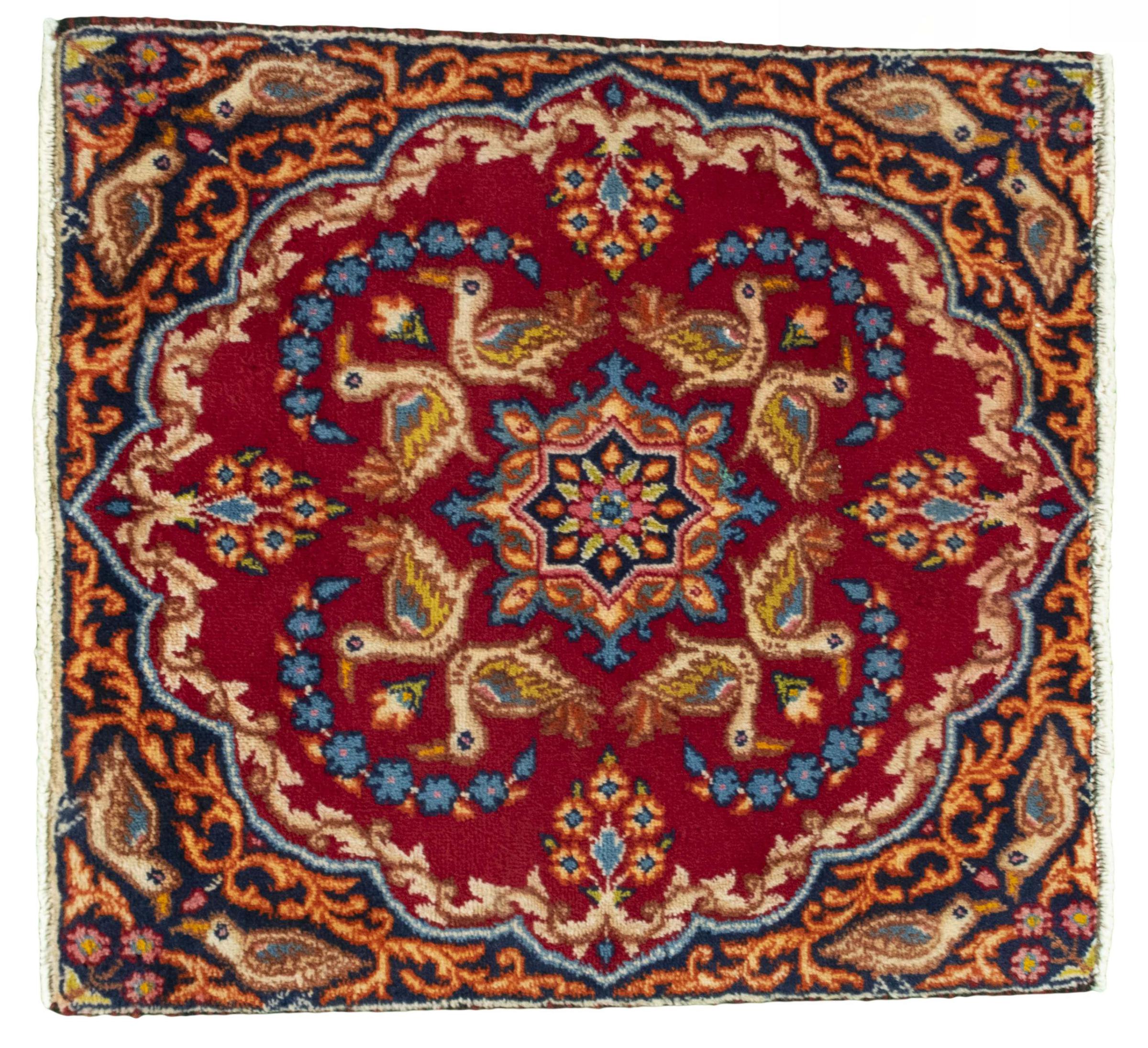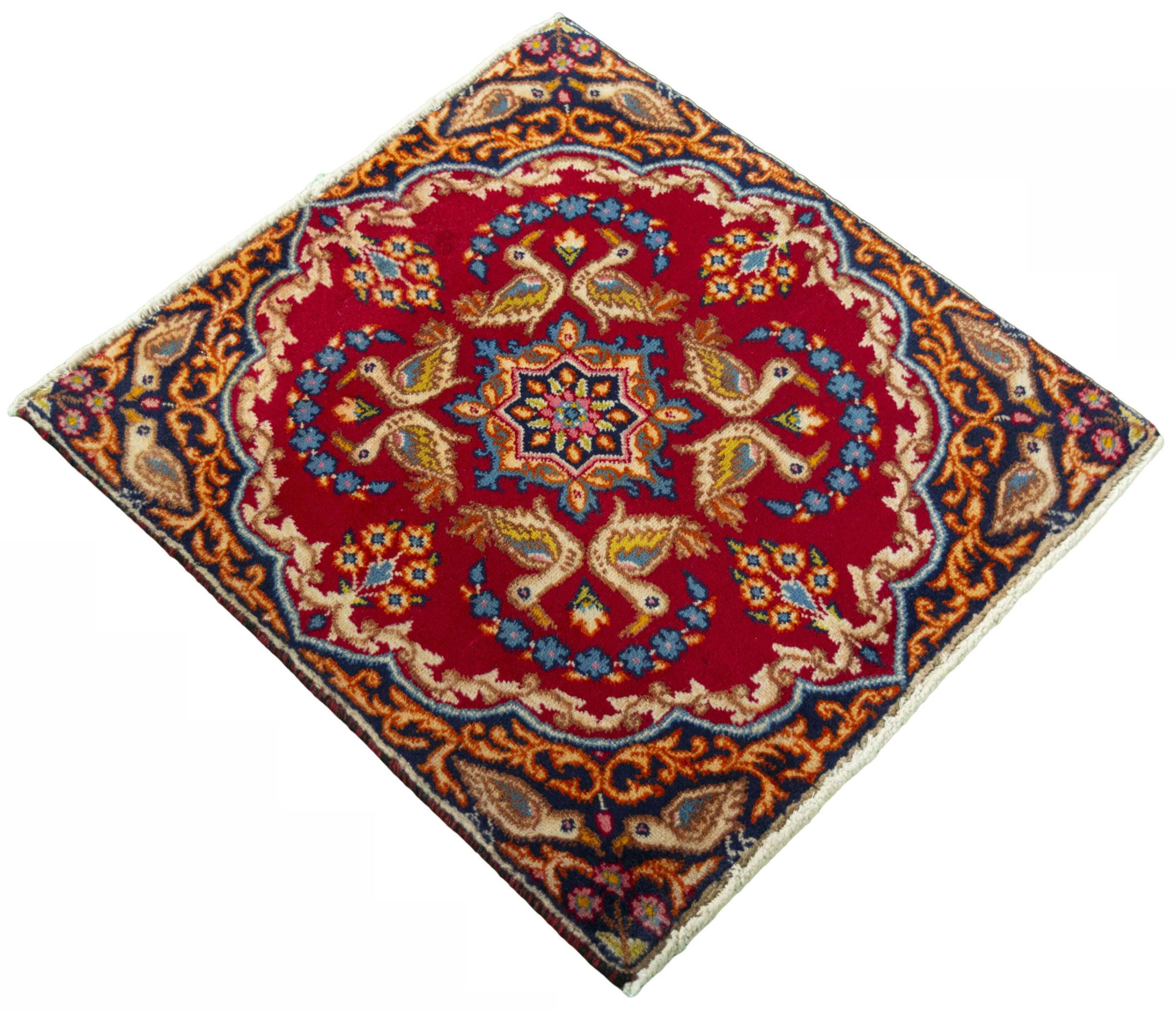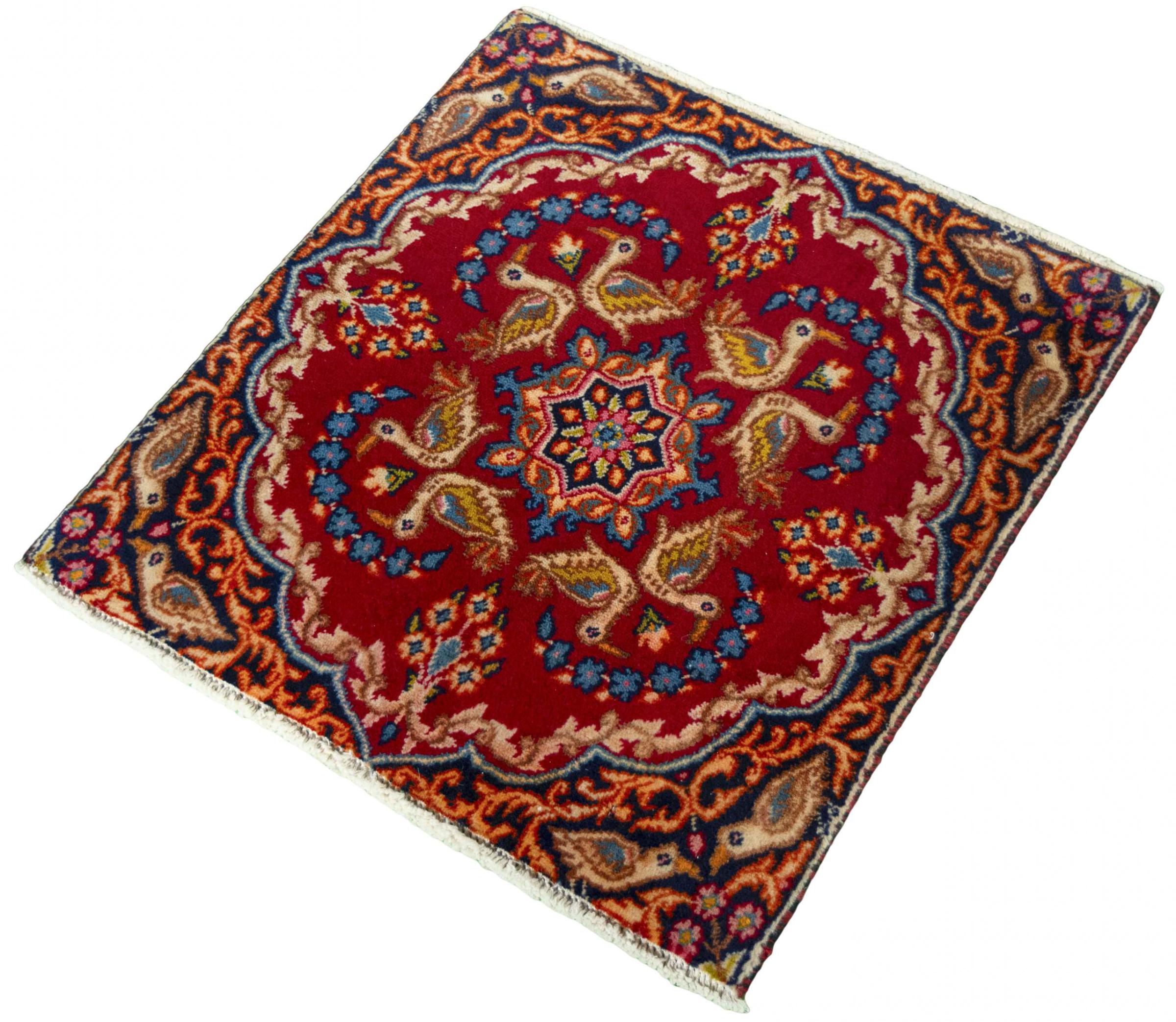 Nº do Tapete: 300174007091962 Tamanho: 59x56 cm Espessura: aproximadamente 12 mm Nós: 120 000 - 150 000 / m² Processamento: Atado à mão Veludo: Lã tecida à mão Urdidura: Algodão Estado / Conservação: O tapete tem uma forma irregular Origem: Pérsia / Iran Idade: Novo Peso: aproximadamente 1 kg Em armazém: Único - Apenas 1 em stock
