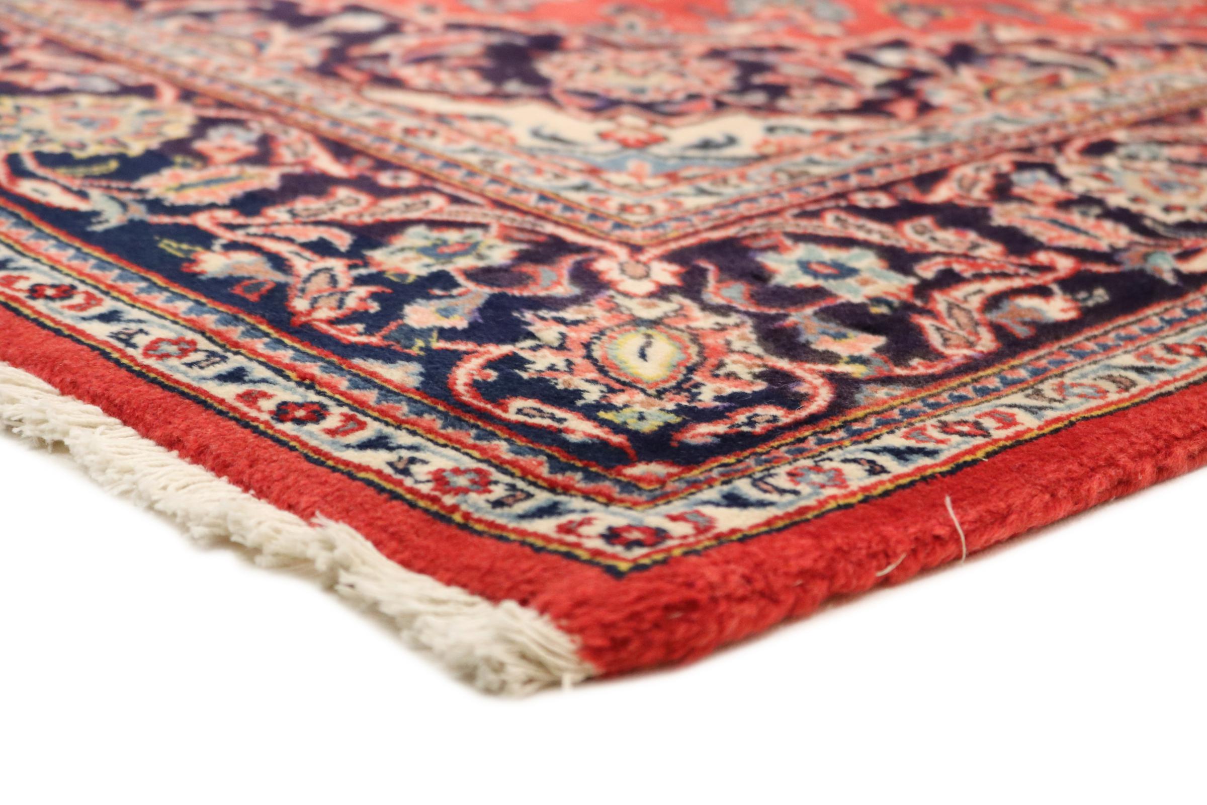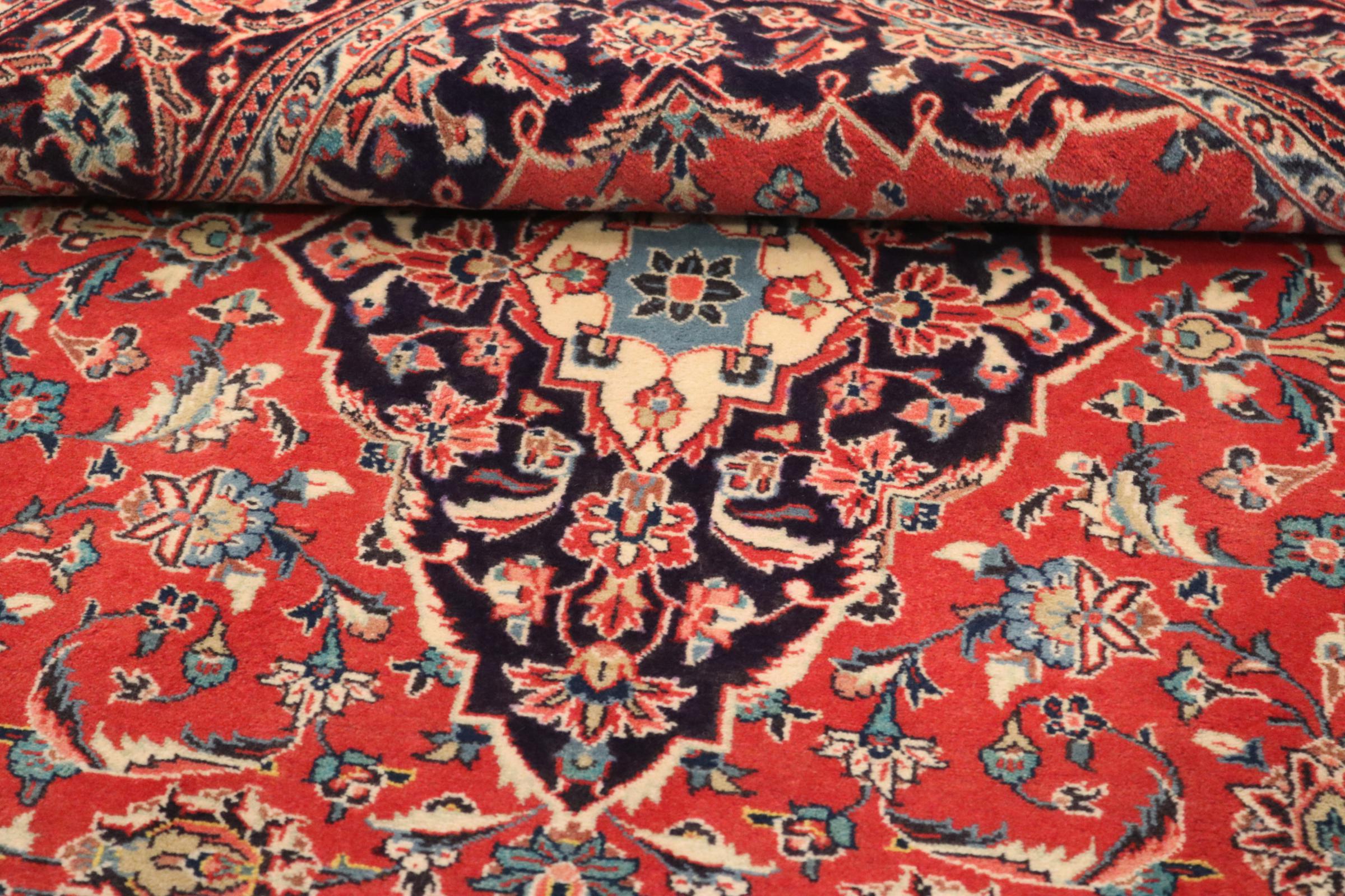 Este tapete de Kashan (Keshan) é mantido em seu design persa muito tradicional e típico com belos ornamentos. Os tapetes Kashan são muito populares devido ao seu design excepcionalmente elegante. Esses tapetes são originários de Kashan, uma cidade na antiga Rota da Seda. Este tapete foi feito à mão com lã de ovelha de alta qualidade e será um destaque único em sua casa.