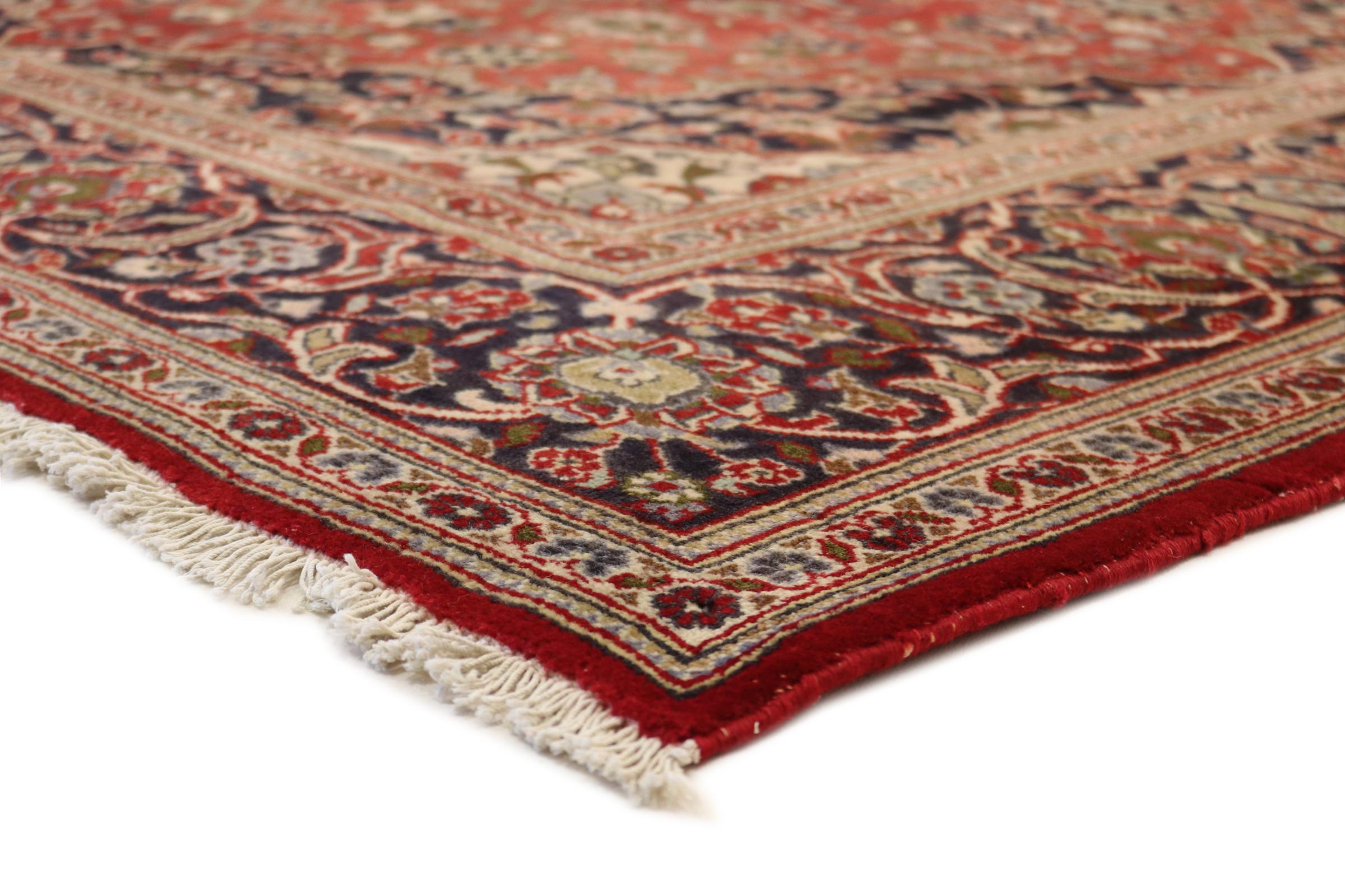 Este tapete de Kashan (Keshan) é mantido em seu design persa muito tradicional e típico com belos ornamentos. Os tapetes Kashan são muito populares devido ao seu design excepcionalmente elegante. Esses tapetes são originários de Kashan, uma cidade na antiga Rota da Seda. Este tapete foi feito à mão com lã de ovelha de alta qualidade e será um destaque único em sua casa.