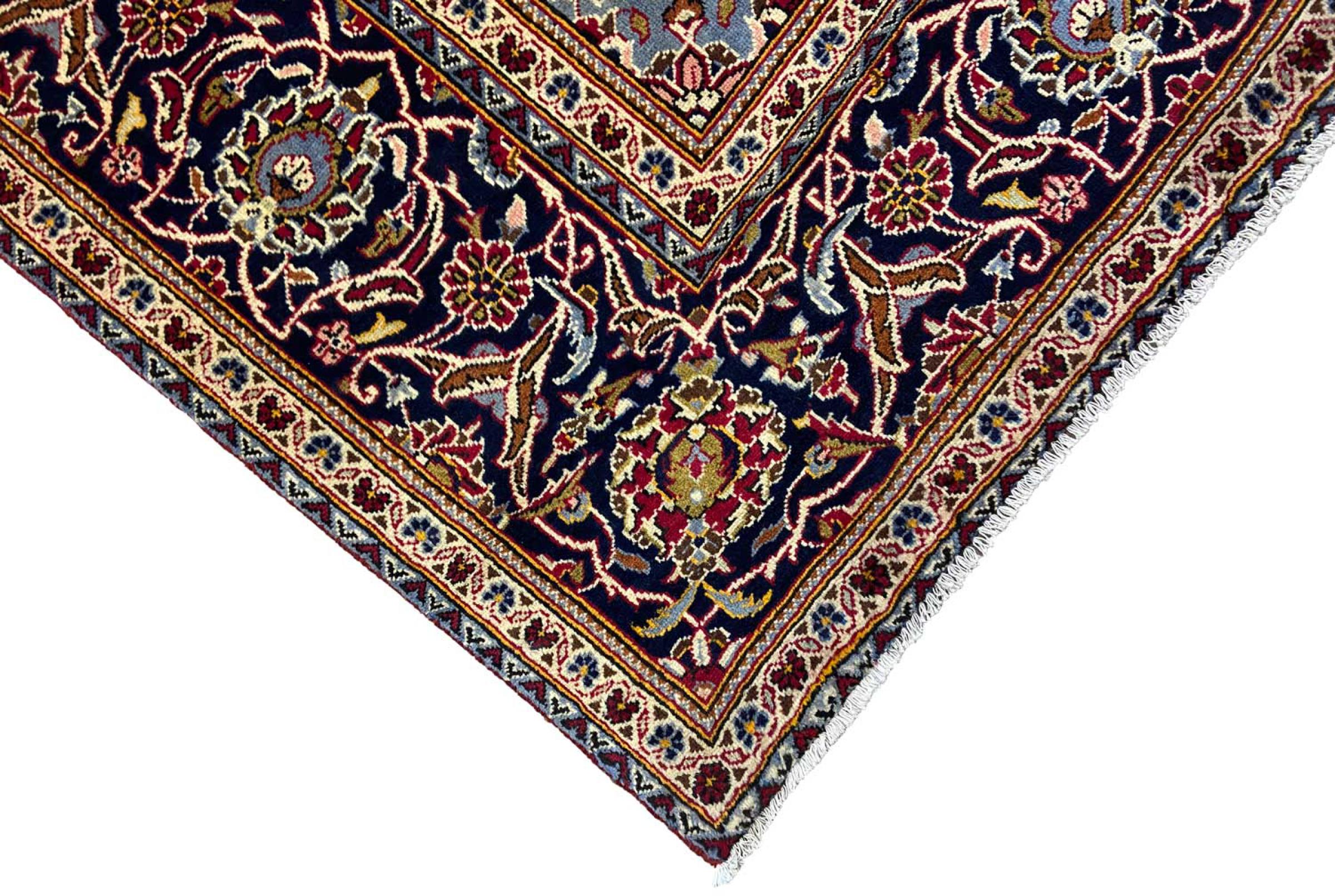 Este tapete de Kashan (Keshan) é mantido em seu design persa muito tradicional e típico com belos ornamentos. Os tapetes Kashan são muito populares devido ao seu design excepcionalmente elegante. Esses tapetes são originários de Kashan, uma cidade na antiga Rota da Seda. Este tapete foi feito à mão com lã de ovelha de alta qualidade e será um destaque único em sua casa.