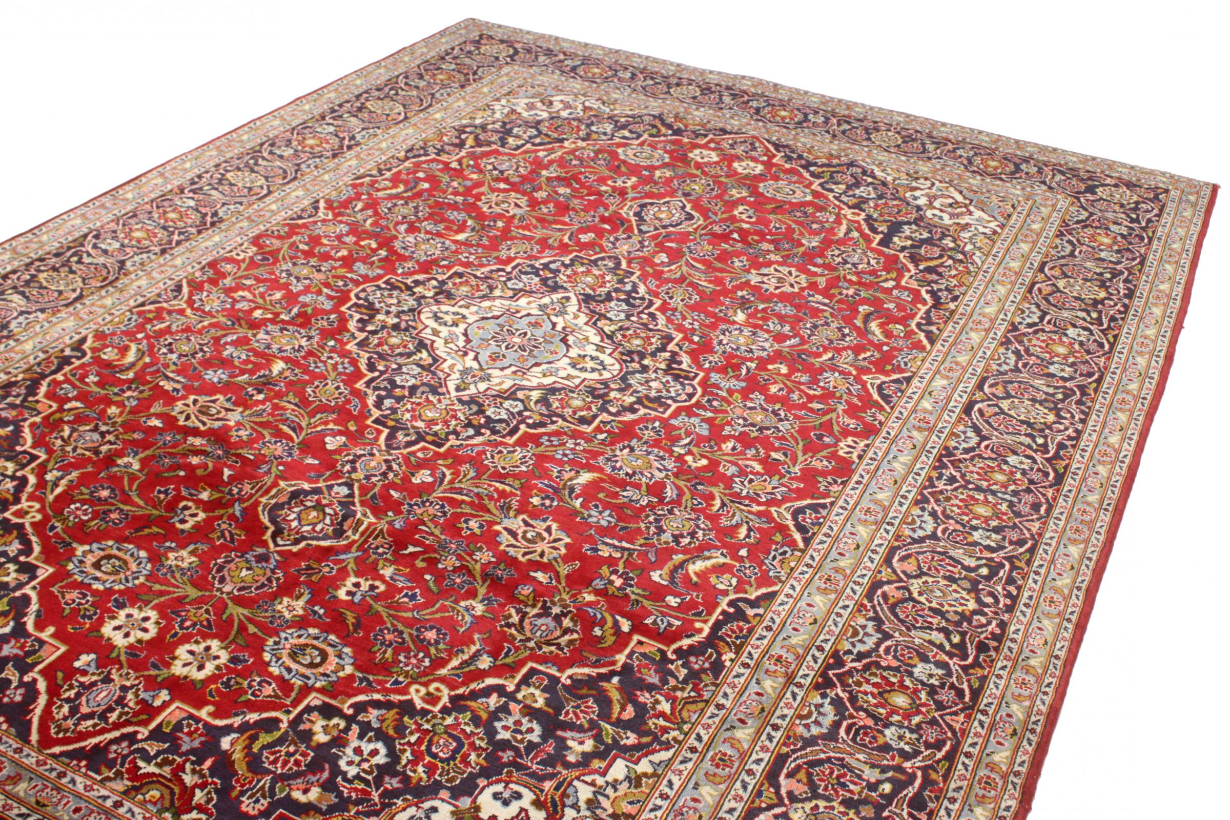 Este tapete de Kashan (Keshan) é mantido em seu design persa muito tradicional e típico com belos ornamentos. Os tapetes Kashan são muito populares devido ao seu design excepcionalmente elegante. Esses tapetes são originários de Kashan, uma cidade na antiga Rota da Seda. Este tapete foi feito à mão com lã de ovelha de alta qualidade e será um destaque único em sua casa.