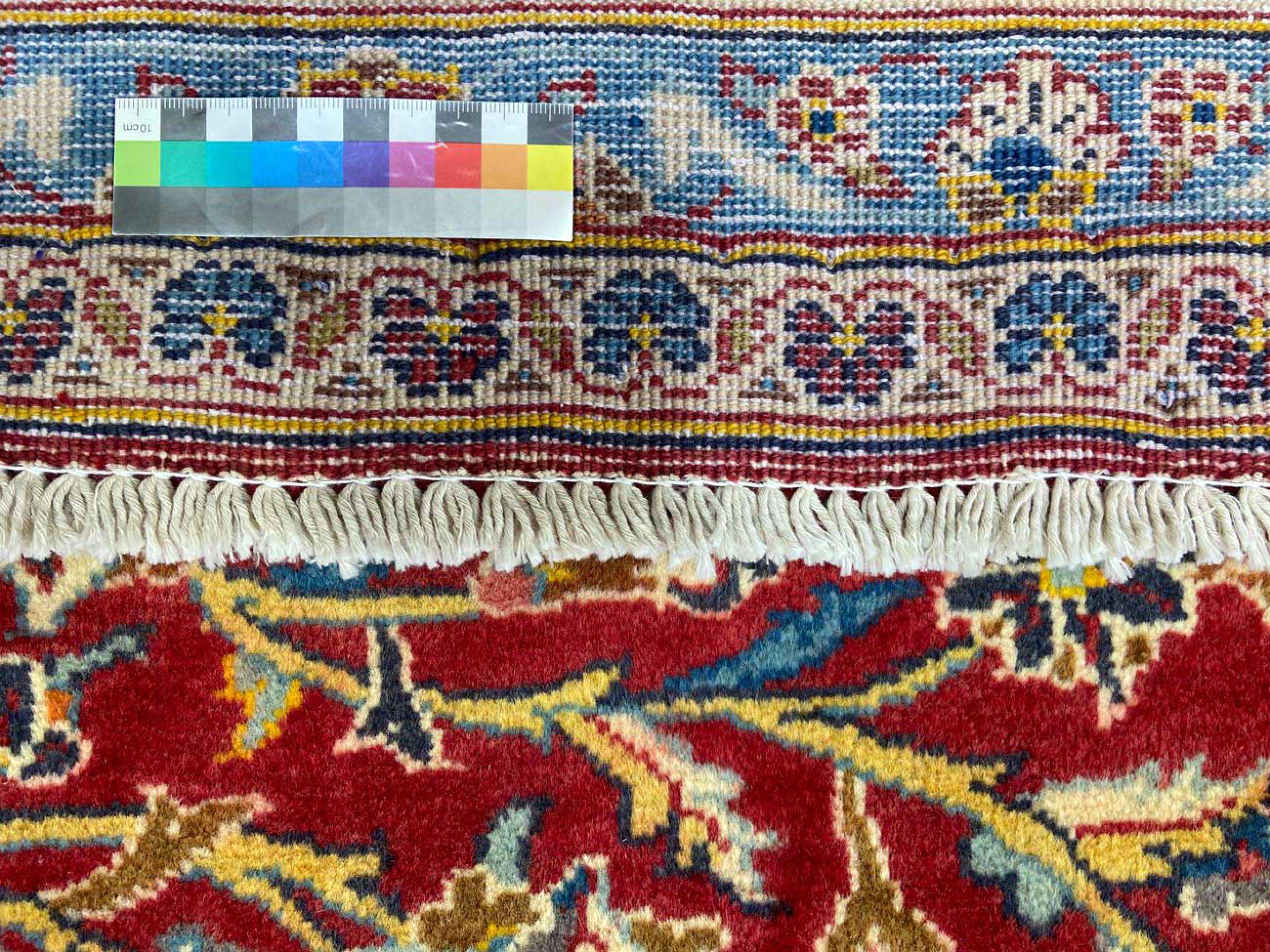 Este tapete é feito de lã de ovelha fiada à mão, da mais alta qualidade. Especialmente no Irão (antiga Pérsia), Afeganistão e Paquistão, a lã ainda é fiada à mão antes do início do nó do tapete. A lã tem provado ser um material natural e extremamente resistente ao longo dos séculos. Entre outras coisas, tem propriedades repelentes de impurezas e isolantes térmicos. Ao mesmo tempo, a lã é incomparavelmente macia e tem um brilho natural.