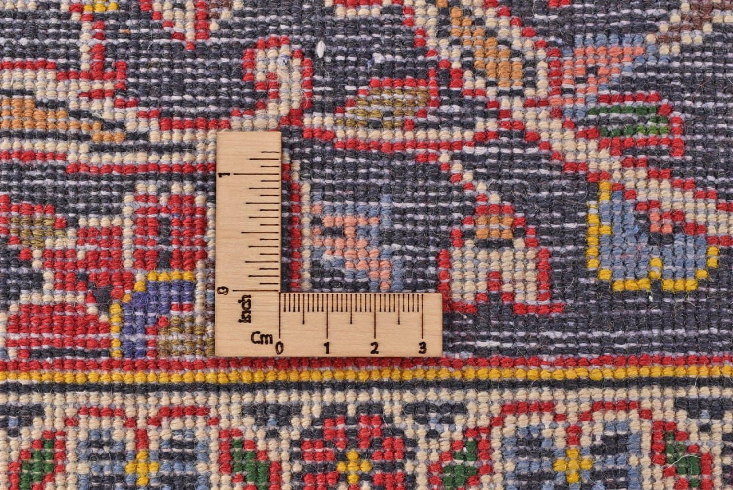 Este tapete é feito de lã de ovelha fiada à mão, da mais alta qualidade. Especialmente no Irão (antiga Pérsia), Afeganistão e Paquistão, a lã ainda é fiada à mão antes do início do nó do tapete. A lã tem provado ser um material natural e extremamente resistente ao longo dos séculos. Entre outras coisas, tem propriedades repelentes de impurezas e isolantes térmicos. Ao mesmo tempo, a lã é incomparavelmente macia e tem um brilho natural.