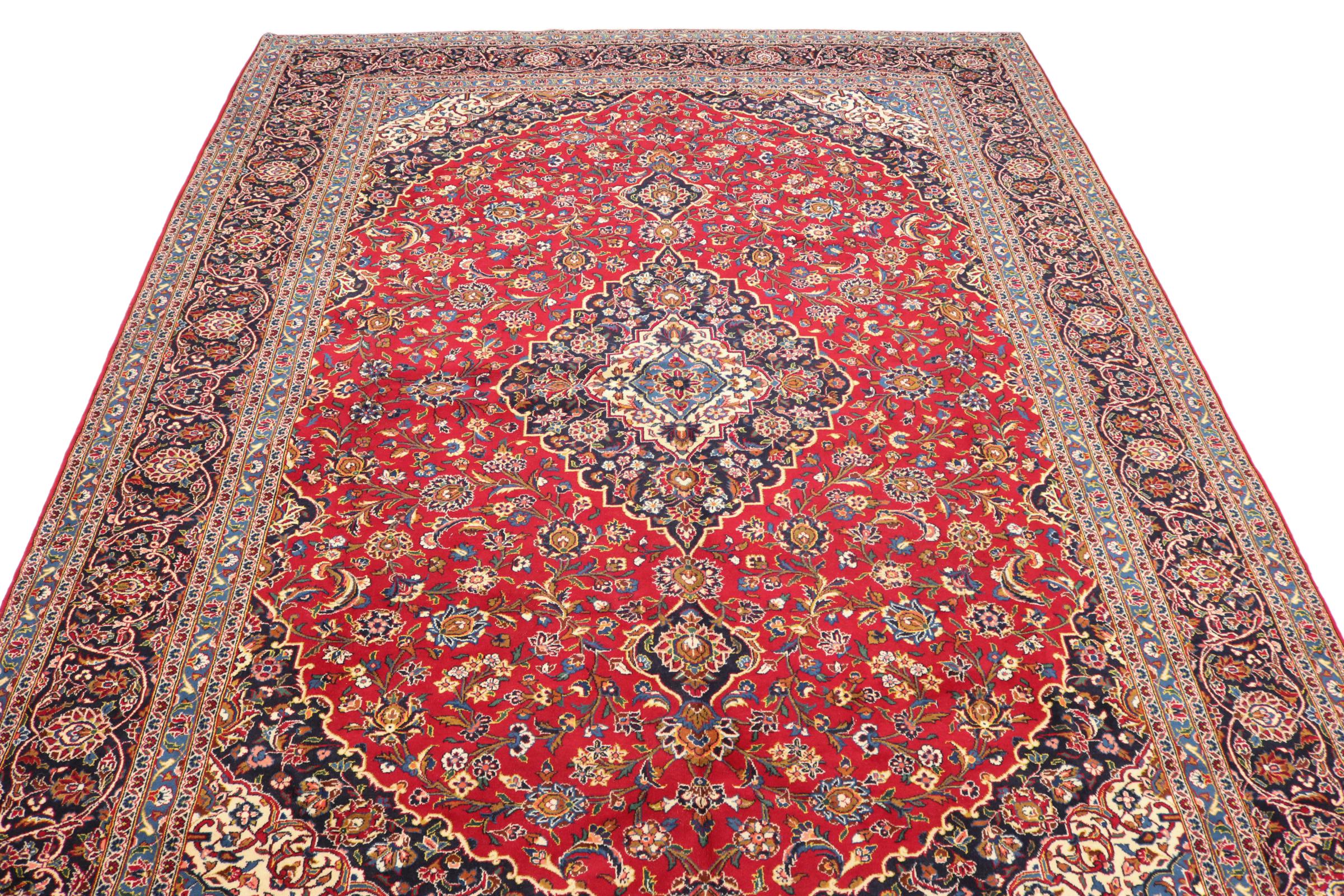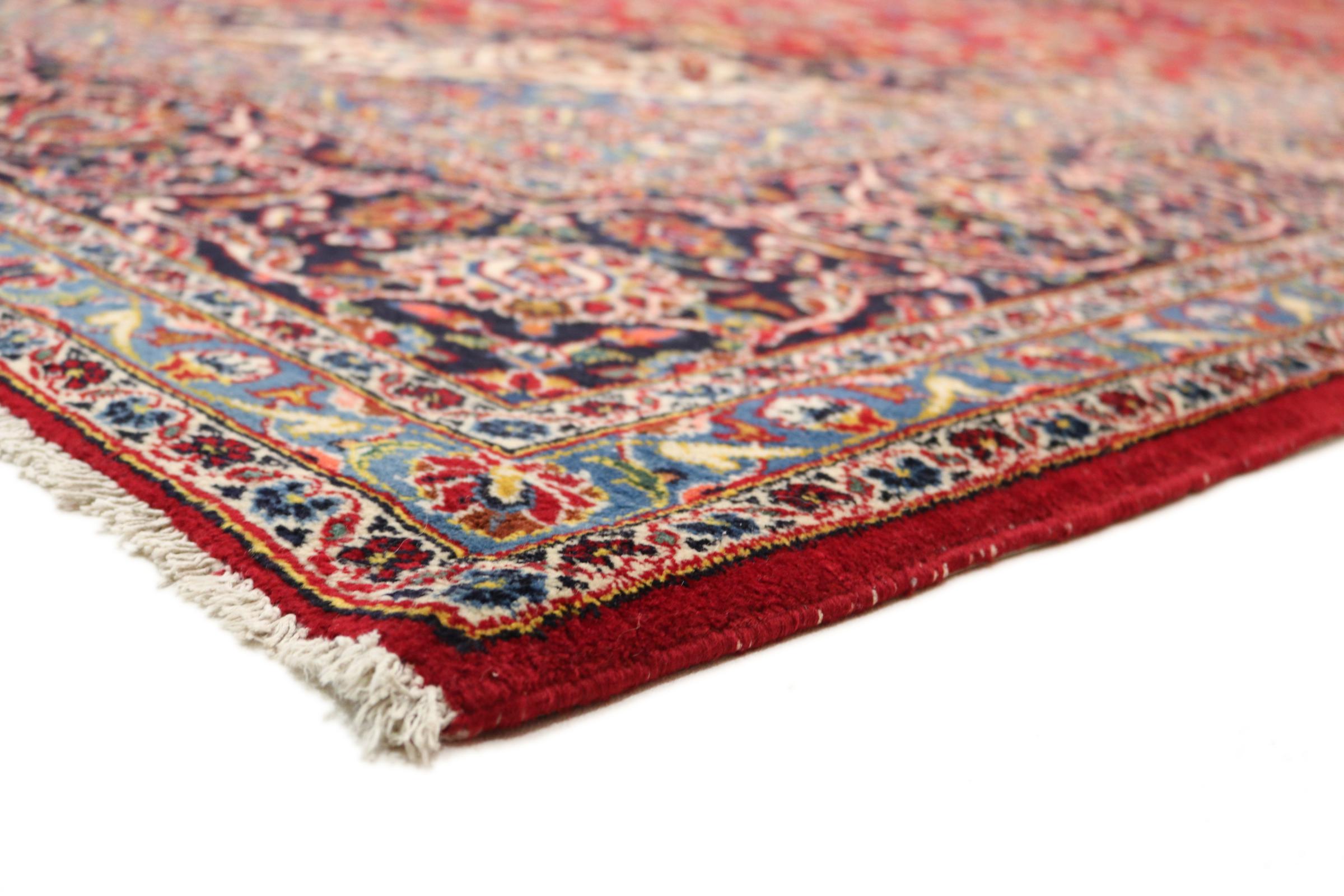 Este tapete de Kashan (Keshan) é mantido em seu design persa muito tradicional e típico com belos ornamentos. Os tapetes Kashan são muito populares devido ao seu design excepcionalmente elegante. Esses tapetes são originários de Kashan, uma cidade na antiga Rota da Seda. Este tapete foi feito à mão com lã de ovelha de alta qualidade e será um destaque único em sua casa.