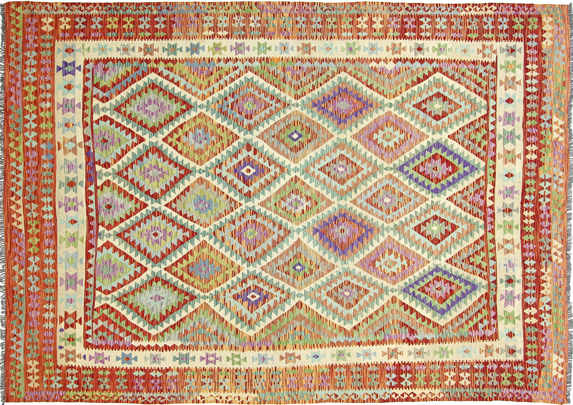 Estes tapetes quilim mostram uma diferença decisiva em relação aos tapetes feitos à mão - são tecidos à mão. Assim, não têm uma grande pilha de lã e são frequentemente mais achatados e ásperos do que os tapetes de lã nodados. O seu fabrico é menos elaborado e, por isso, são normalmente muito mais baratos. Como vantagem, os tapetes kilim são também muito mais leves e podem ser colocados pela frente e por trás. Os quilims tecidos à mão provêm originalmente da antiga Pérsia e são agora frequentemente fabricados também no Afeganistão. Têm padrões bastante simples e simples, que se devem à sua técnica de tecelagem.