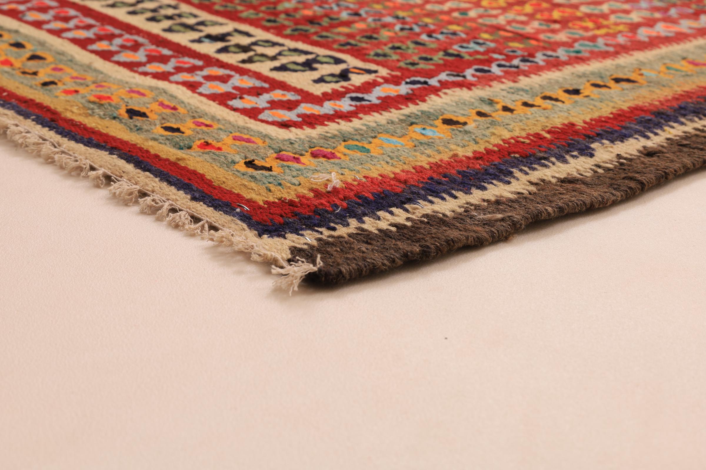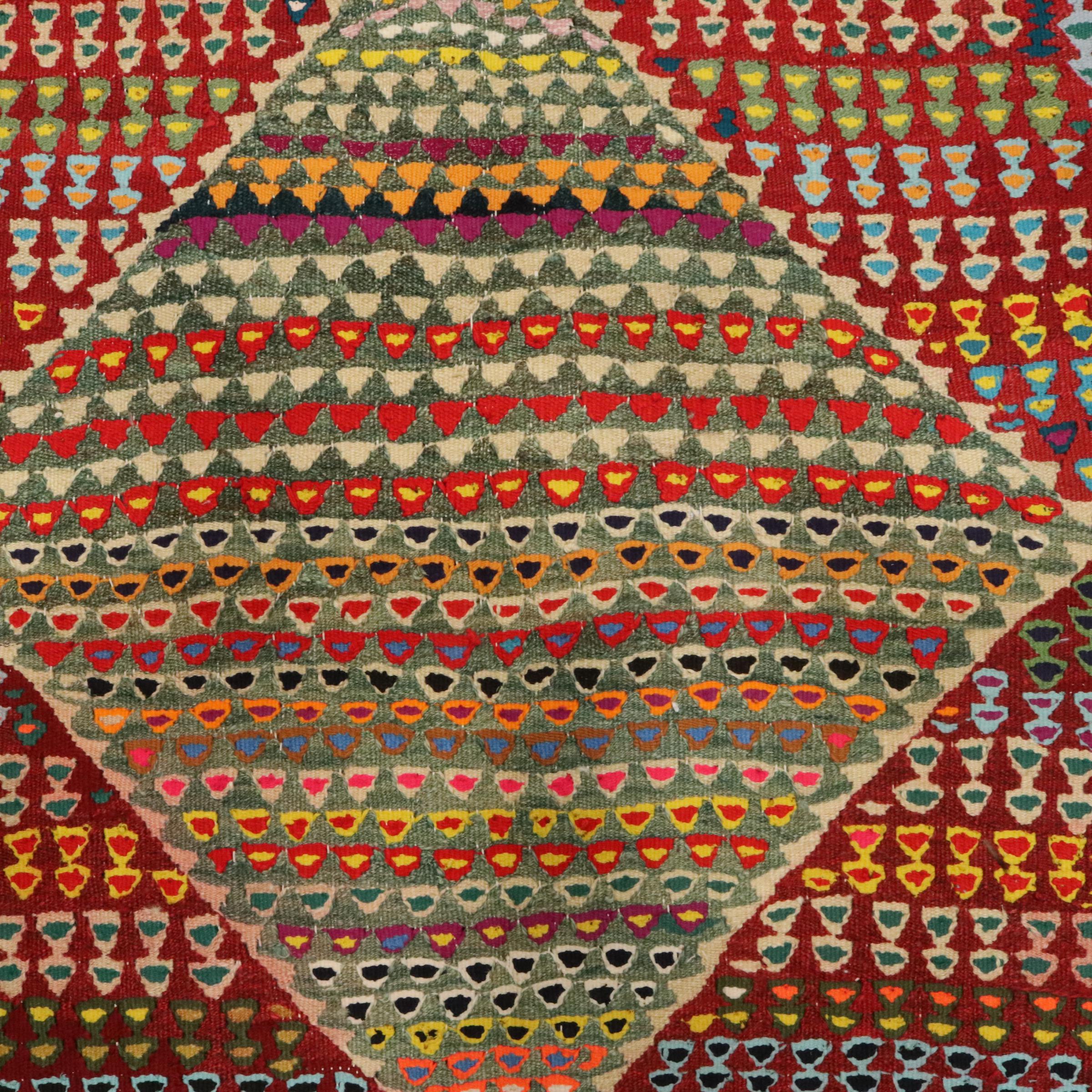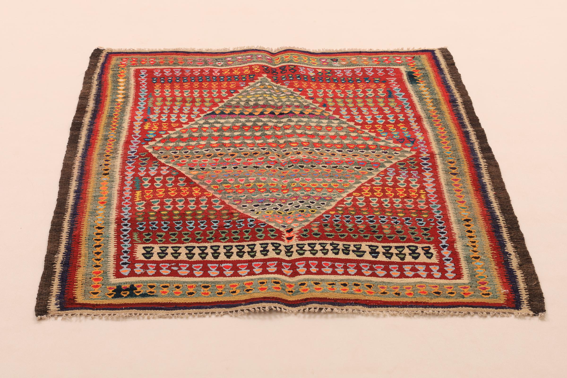 Este kilim fars tecido à mão combina padrões e ornamentos persas com a tradição de tramas planas. Uma grande e moderna combinação dos conceitos mais populares do Oriente. Isso cria um tapete com uma ampla gama de usos. Seja como colcha ou tapete na frente do sofá - um kilim Fars torna isso possível e agora pode ser encontrado nas revistas de design de interiores mais conhecidas. Os tapetes Kilim Fars são tecidos à mão no Irã e, portanto, estão entre os kilims da mais alta qualidade.