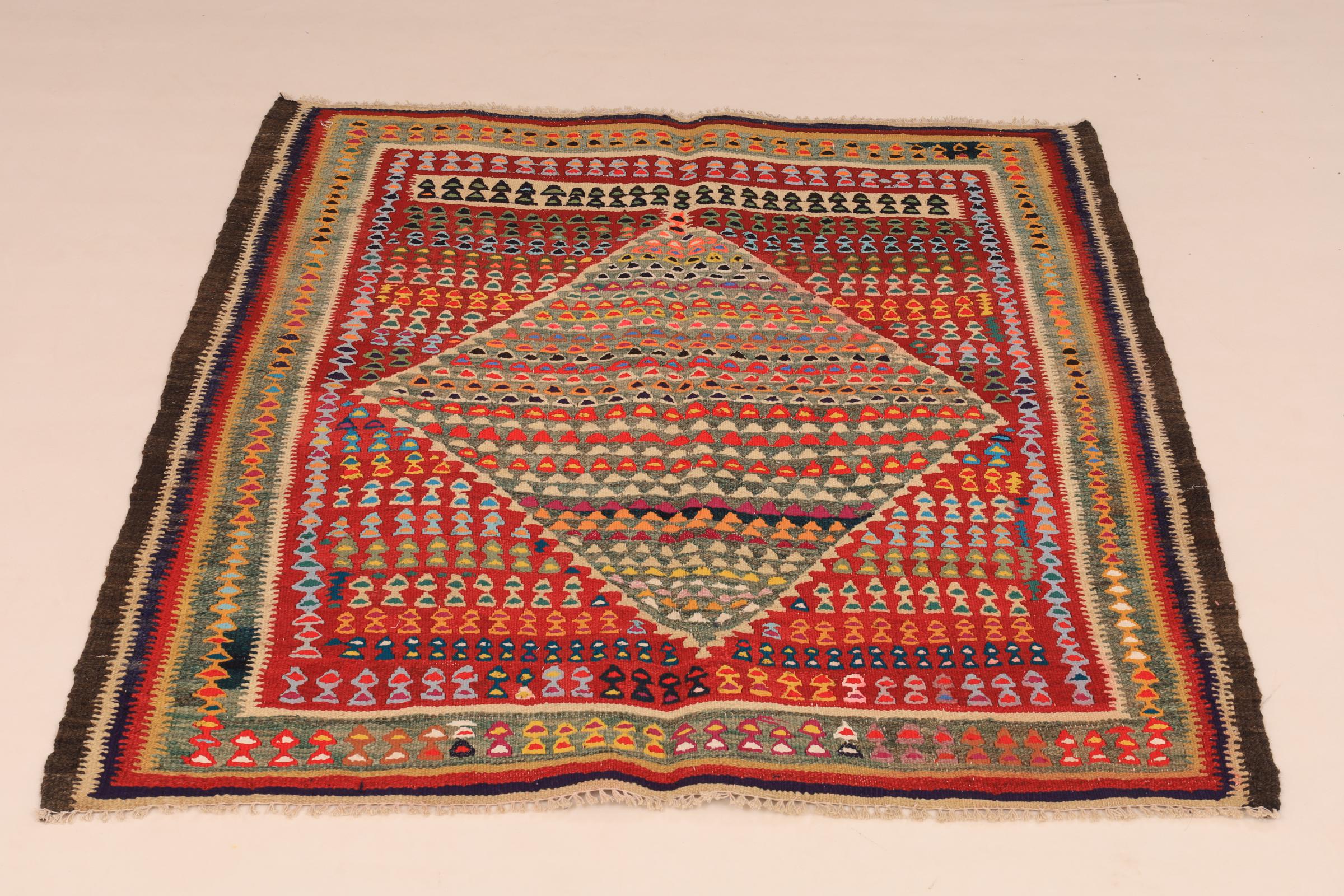 Estes tapetes quilim mostram uma diferença decisiva em relação aos tapetes feitos à mão - são tecidos à mão. Assim, não têm uma grande pilha de lã e são frequentemente mais achatados e ásperos do que os tapetes de lã nodados. O seu fabrico é menos elaborado e, por isso, são normalmente muito mais baratos. Como vantagem, os tapetes kilim são também muito mais leves e podem ser colocados pela frente e por trás. Os quilims tecidos à mão provêm originalmente da antiga Pérsia e são agora frequentemente fabricados também no Afeganistão. Têm padrões bastante simples e simples, que se devem à sua técnica de tecelagem.