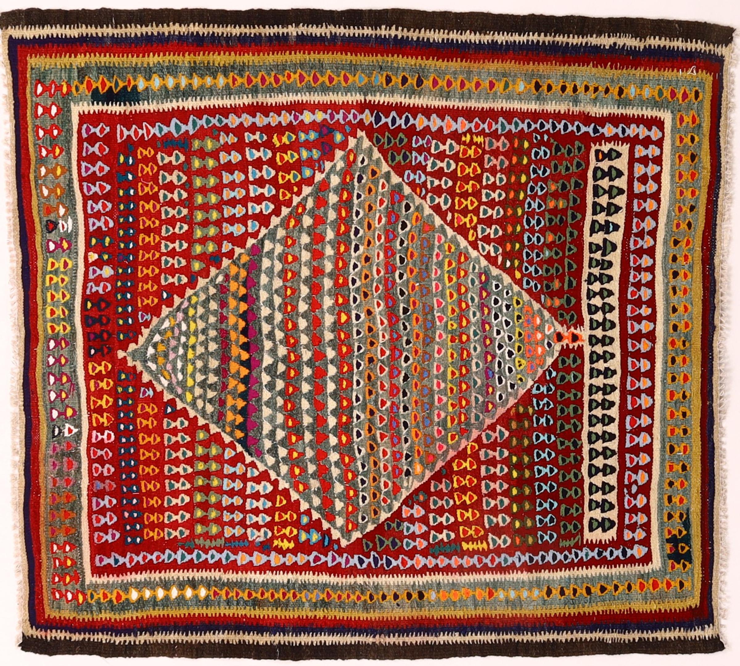 Este tapete foi feito à mão sobre um tear como uma trama plana. Flatweave é o termo utilizado para descrever tapetes que não têm pêlo. Como o nome promete, estes tapetes são tecidos e não atados. Isto resulta num tapete plano com uma superfície estruturada. Os tecidos planos não são tão macios e geralmente mais finos do que os tapetes com nós. Ao mesmo tempo, são muito menos complexos de fabricar e podem normalmente ser dispostos de ambos os lados (frente e verso). Os seus padrões são normalmente geométricos, o que é determinado pelo tecido.