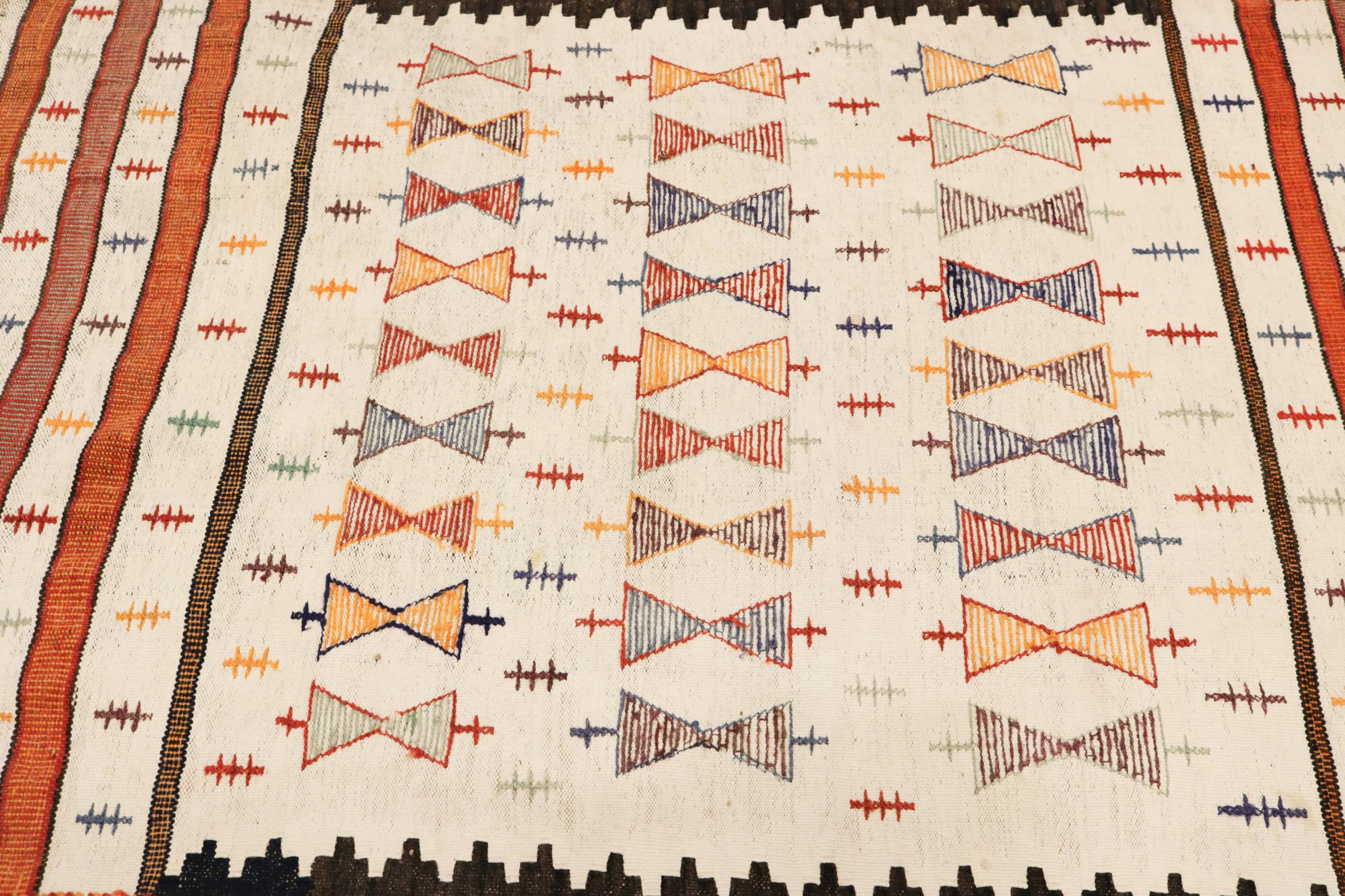 Este kilim fars tecido à mão combina padrões e ornamentos persas com a tradição de tramas planas. Uma grande e moderna combinação dos conceitos mais populares do Oriente. Isso cria um tapete com uma ampla gama de usos. Seja como colcha ou tapete na frente do sofá - um kilim Fars torna isso possível e agora pode ser encontrado nas revistas de design de interiores mais conhecidas. Os tapetes Kilim Fars são tecidos à mão no Irã e, portanto, estão entre os kilims da mais alta qualidade.