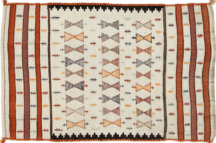 Este tapete foi feito à mão sobre um tear como uma trama plana. Flatweave é o termo utilizado para descrever tapetes que não têm pêlo. Como o nome promete, estes tapetes são tecidos e não atados. Isto resulta num tapete plano com uma superfície estruturada. Os tecidos planos não são tão macios e geralmente mais finos do que os tapetes com nós. Ao mesmo tempo, são muito menos complexos de fabricar e podem normalmente ser dispostos de ambos os lados (frente e verso). Os seus padrões são normalmente geométricos, o que é determinado pelo tecido.