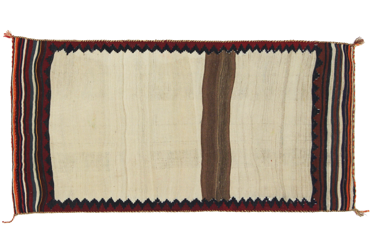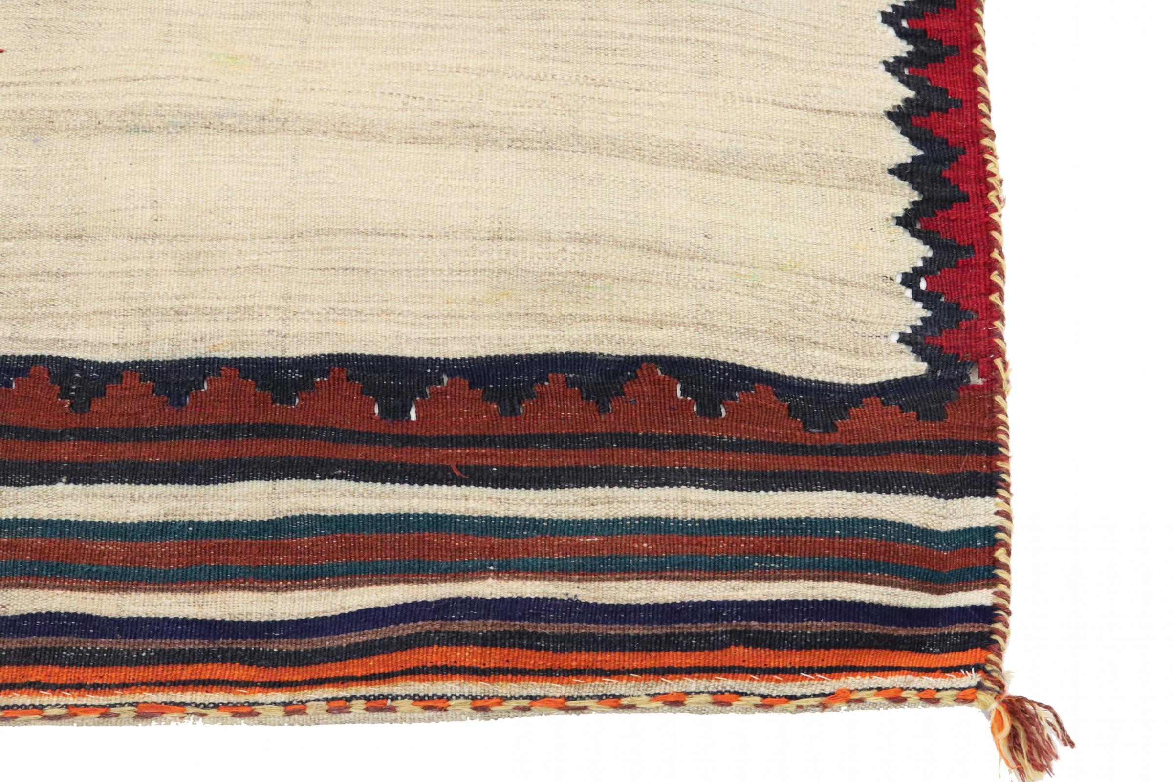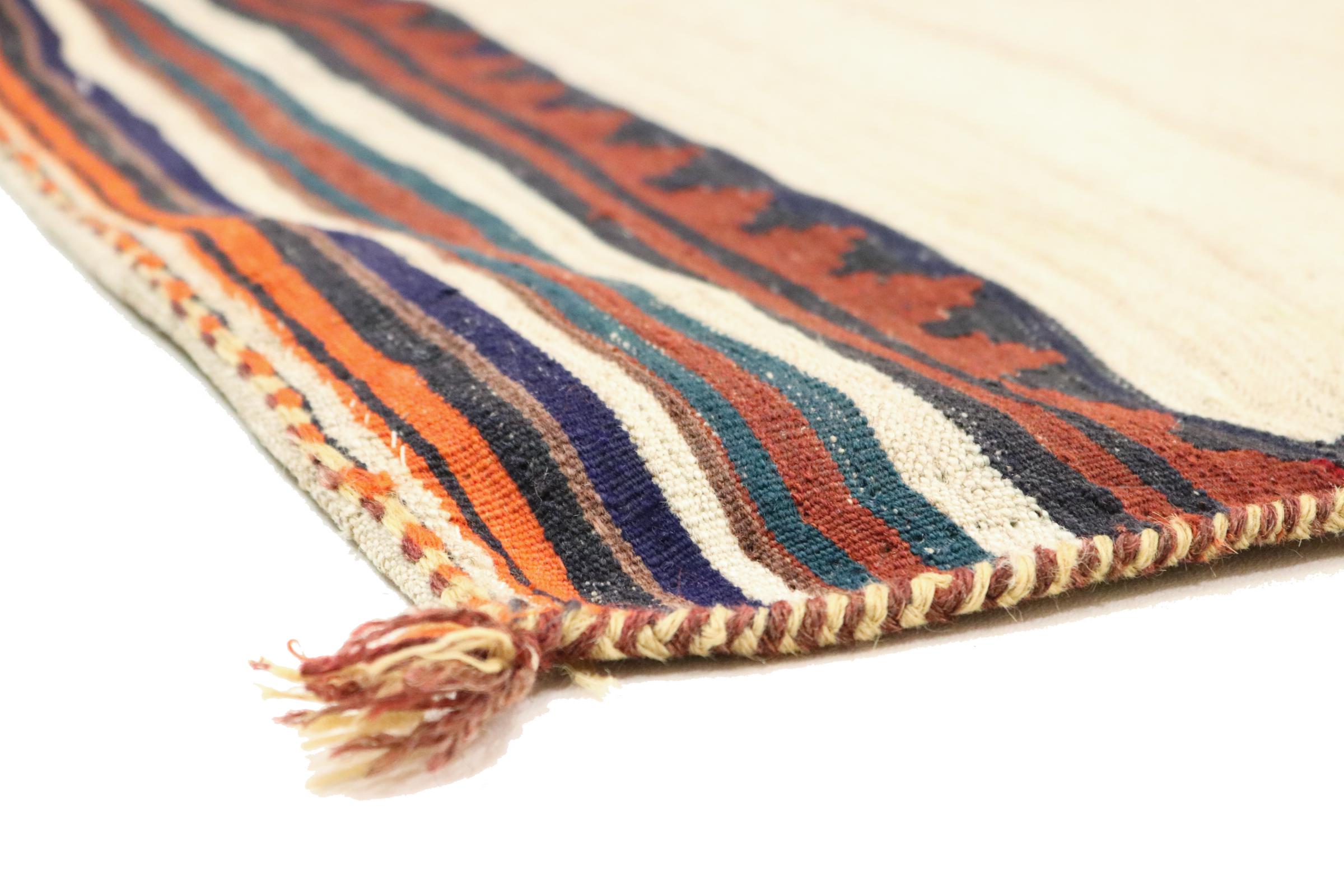 Este kilim fars tecido à mão combina padrões e ornamentos persas com a tradição de tramas planas. Uma grande e moderna combinação dos conceitos mais populares do Oriente. Isso cria um tapete com uma ampla gama de usos. Seja como colcha ou tapete na frente do sofá - um kilim Fars torna isso possível e agora pode ser encontrado nas revistas de design de interiores mais conhecidas. Os tapetes Kilim Fars são tecidos à mão no Irã e, portanto, estão entre os kilims da mais alta qualidade.