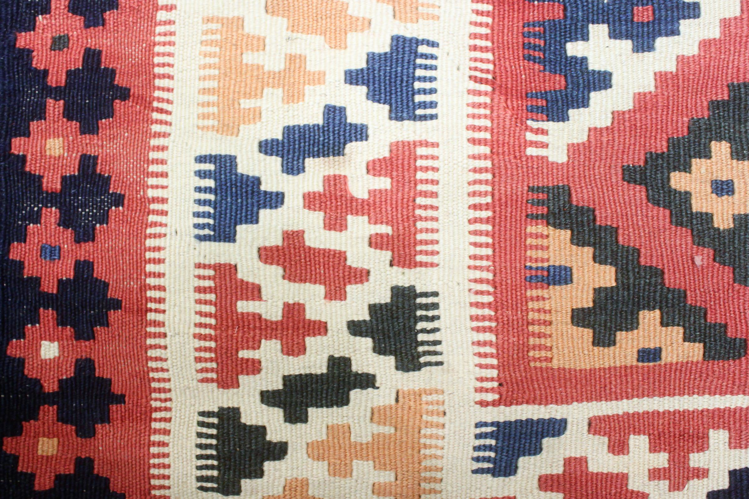 Este kilim fars tecido à mão combina padrões e ornamentos persas com a tradição de tramas planas. Uma grande e moderna combinação dos conceitos mais populares do Oriente. Isso cria um tapete com uma ampla gama de usos. Seja como colcha ou tapete na frente do sofá - um kilim Fars torna isso possível e agora pode ser encontrado nas revistas de design de interiores mais conhecidas. Os tapetes Kilim Fars são tecidos à mão no Irã e, portanto, estão entre os kilims da mais alta qualidade.
