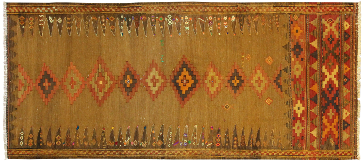 Este tapete foi feito à mão sobre um tear como uma trama plana. Flatweave é o termo utilizado para descrever tapetes que não têm pêlo. Como o nome promete, estes tapetes são tecidos e não atados. Isto resulta num tapete plano com uma superfície estruturada. Os tecidos planos não são tão macios e geralmente mais finos do que os tapetes com nós. Ao mesmo tempo, são muito menos complexos de fabricar e podem normalmente ser dispostos de ambos os lados (frente e verso). Os seus padrões são normalmente geométricos, o que é determinado pelo tecido.