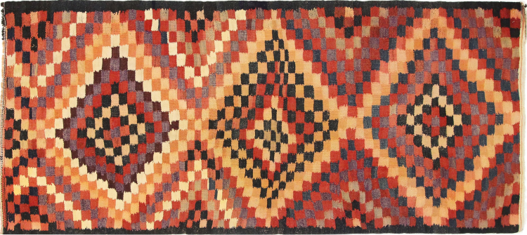 Este tapete foi feito à mão sobre um tear como uma trama plana. Flatweave é o termo utilizado para descrever tapetes que não têm pêlo. Como o nome promete, estes tapetes são tecidos e não atados. Isto resulta num tapete plano com uma superfície estruturada. Os tecidos planos não são tão macios e geralmente mais finos do que os tapetes com nós. Ao mesmo tempo, são muito menos complexos de fabricar e podem normalmente ser dispostos de ambos os lados (frente e verso). Os seus padrões são normalmente geométricos, o que é determinado pelo tecido.