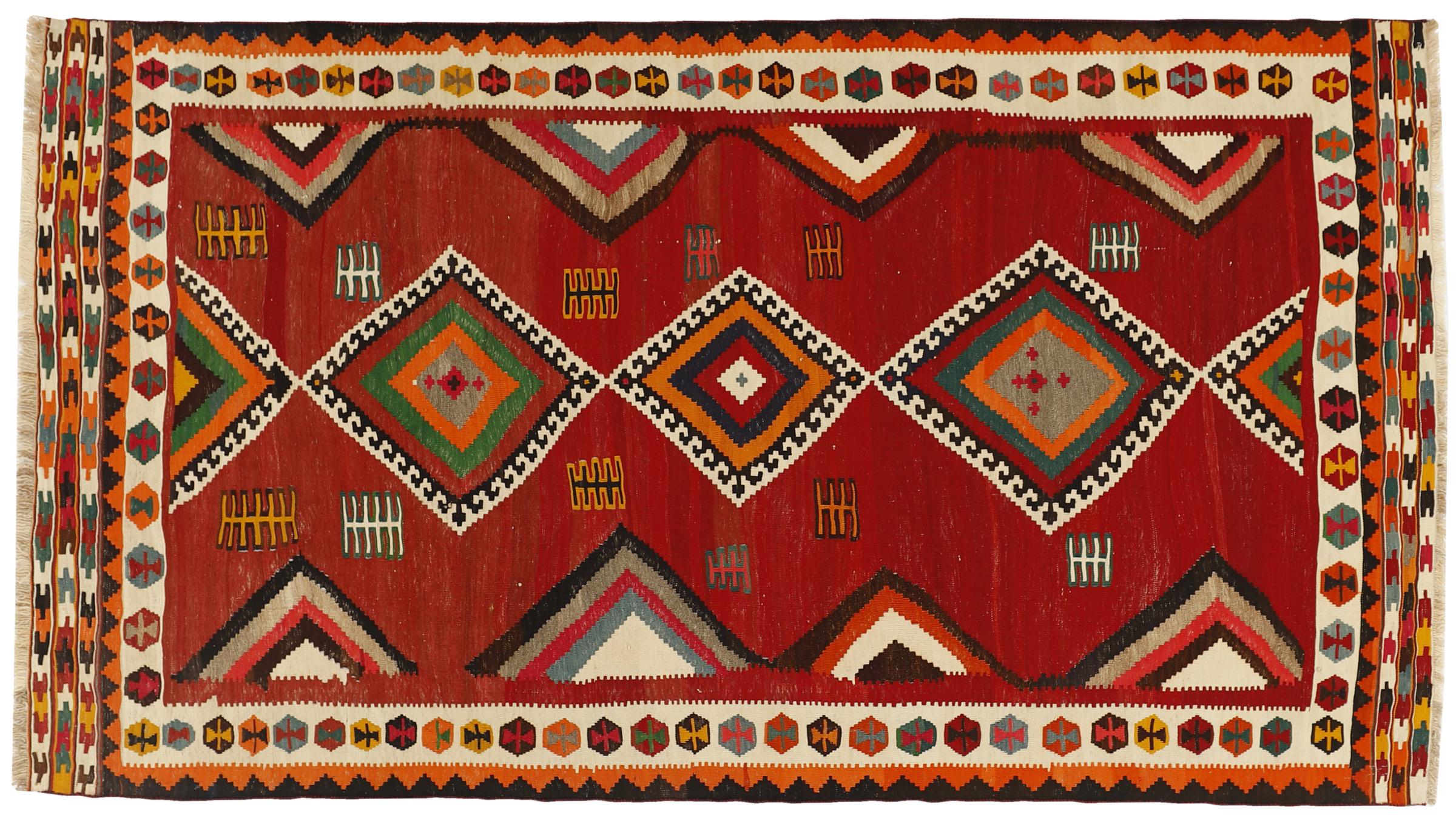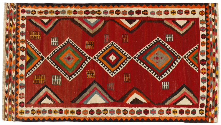 Este kilim fars tecido à mão combina padrões e ornamentos persas com a tradição de tramas planas. Uma grande e moderna combinação dos conceitos mais populares do Oriente. Isso cria um tapete com uma ampla gama de usos. Seja como colcha ou tapete na frente do sofá - um kilim Fars torna isso possível e agora pode ser encontrado nas revistas de design de interiores mais conhecidas. Os tapetes Kilim Fars são tecidos à mão no Irã e, portanto, estão entre os kilims da mais alta qualidade.